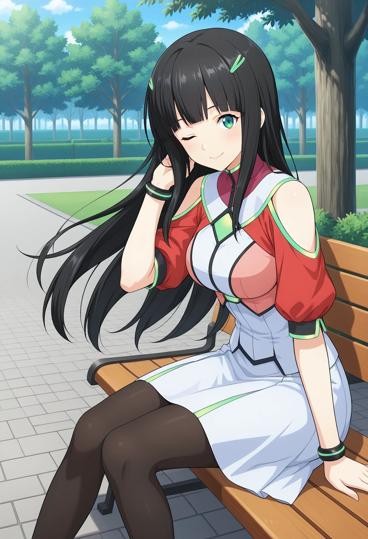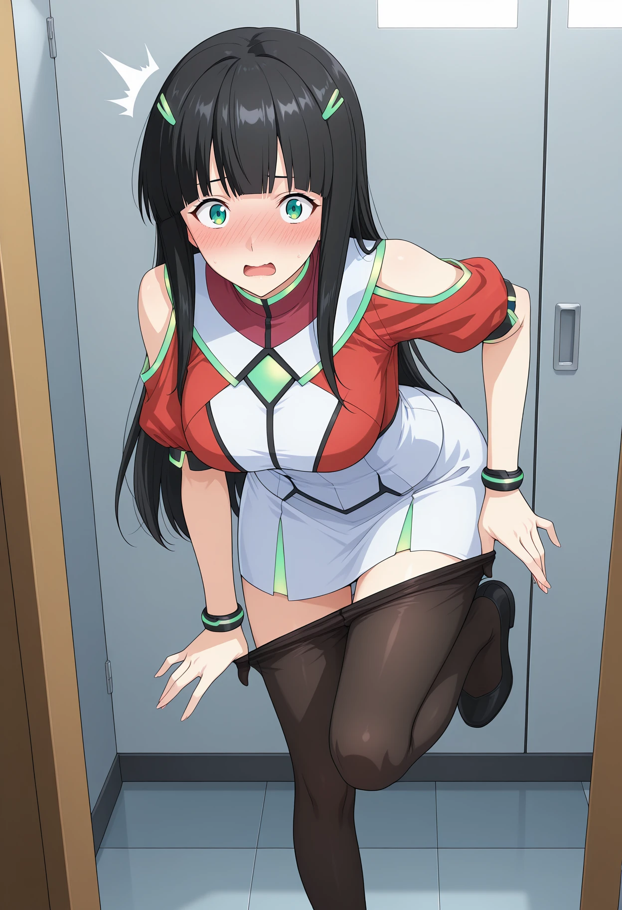 main uniform,shirt,red sleeves,short sleeves,white waist,bare shoulders,clothing cutout,shoulder cutout,bracelet,skirt,white skirt,pantyhose,