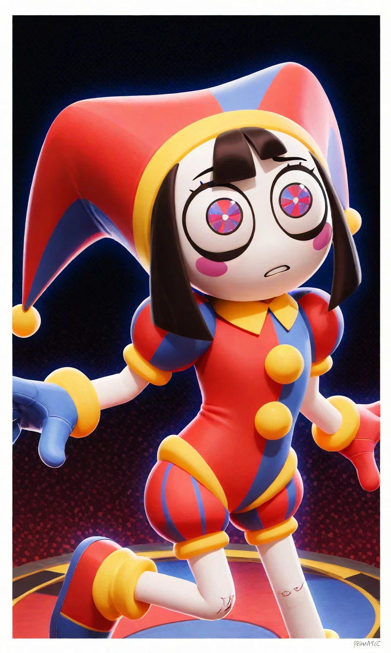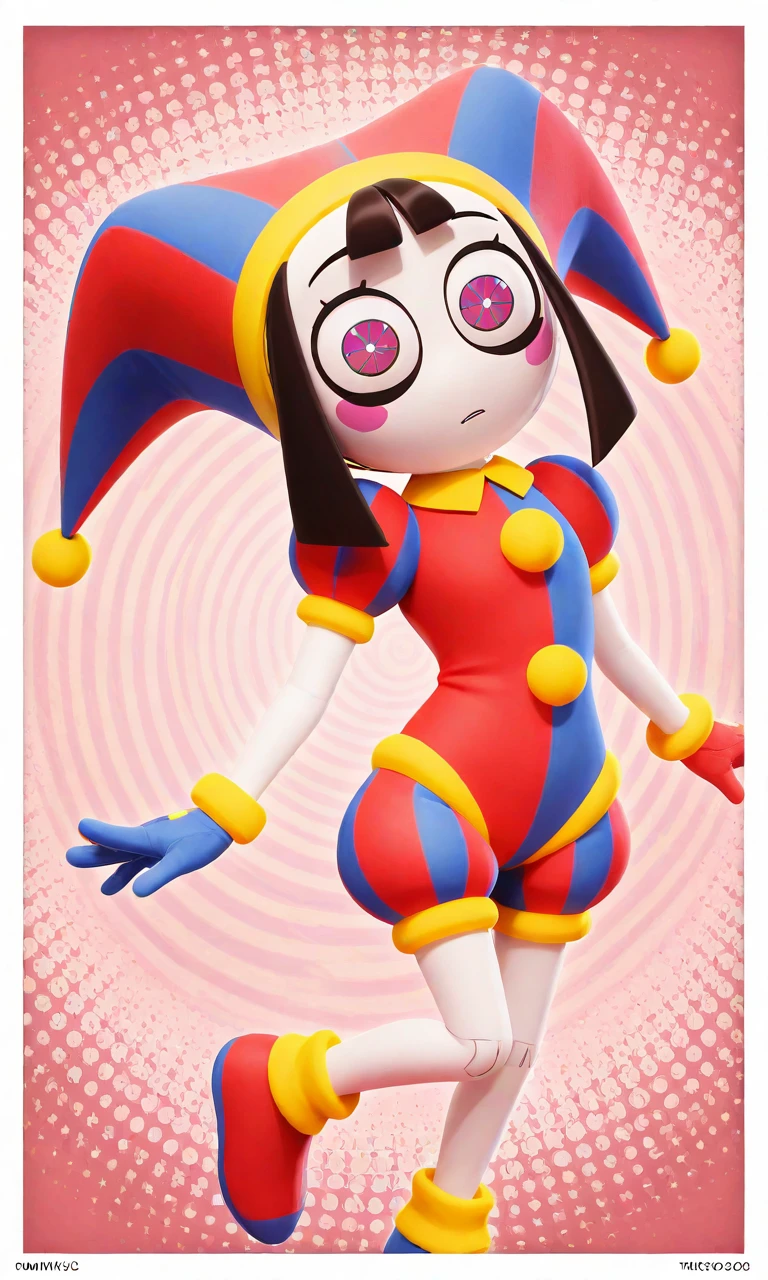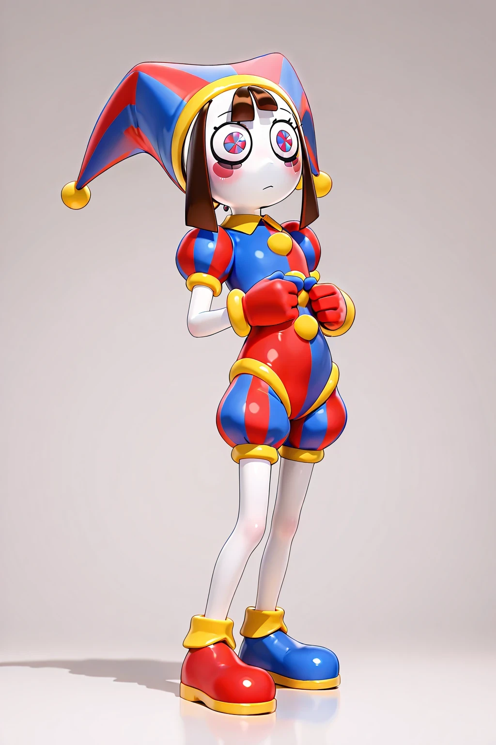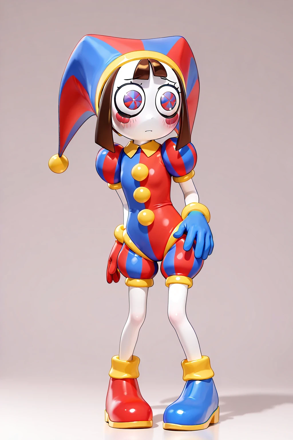 PomniTADC, 1girl, blue eyes, brown hair, red eyes, short puffy sleeves, symbol-shaped pupils, blush stickers, red gloves, facepaint, jester cap, pale white skin, blue shoes, red shoes, blue gloves, pomni (the amazing digital circus),