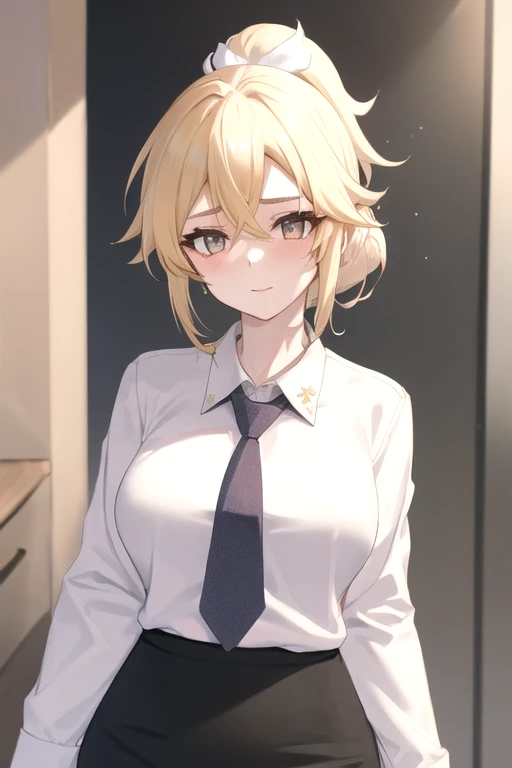 SimoneRakuen, 1girl, solo, short hair, blonde hair, pencil skirt, large breasts, white shirt, black skirt, long sleeves, necktie, collared shirt, folded ponytail