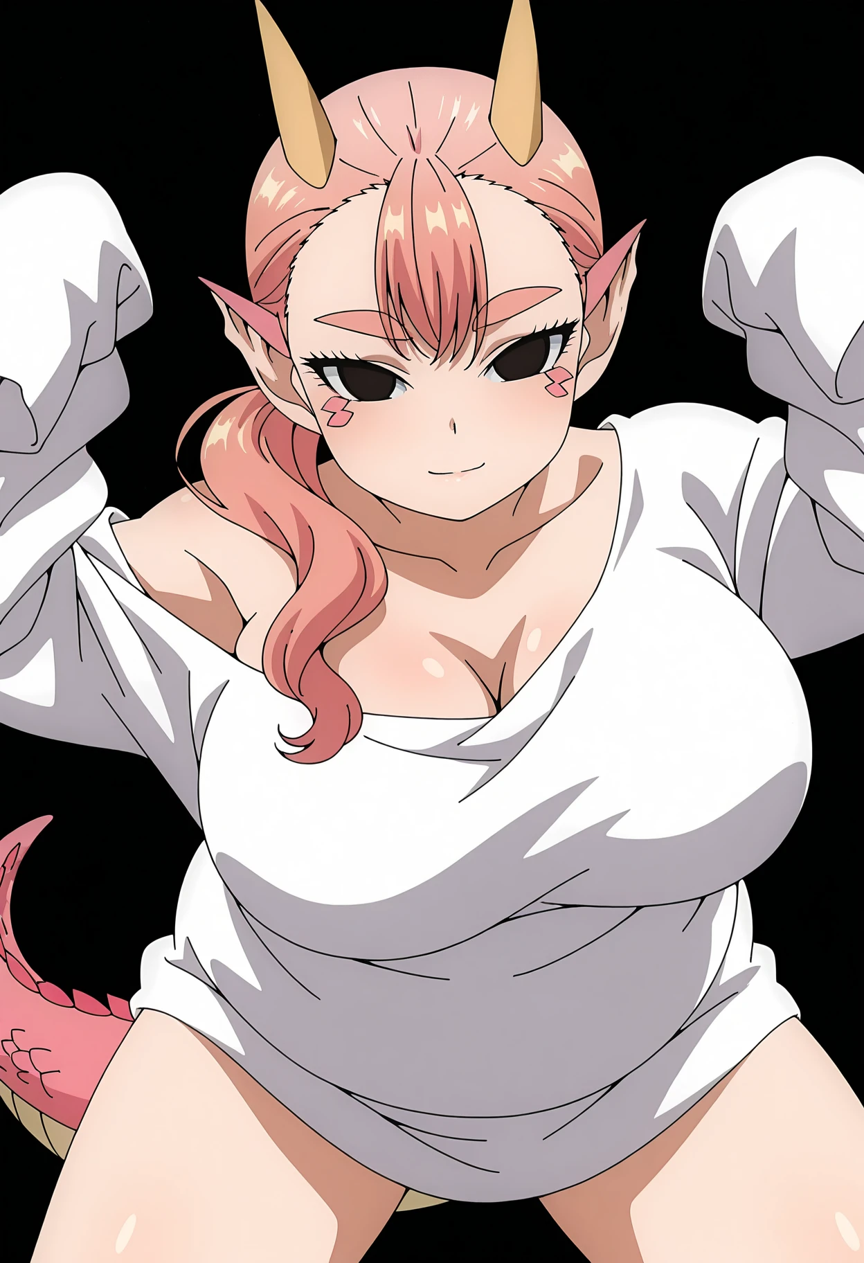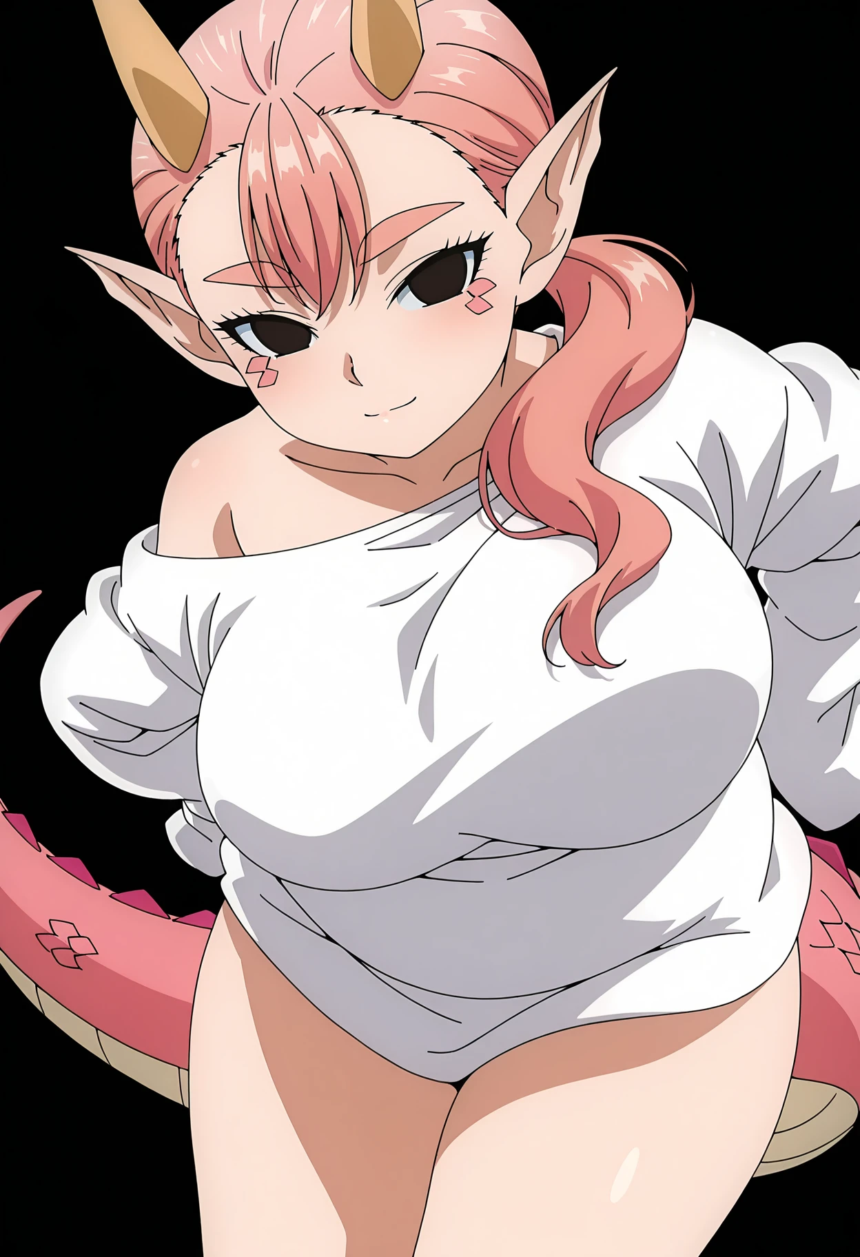 1girl, gonda, dragon girl, pointy ears, long hair, pink hair, twintails, low twintails, bangs, thick eyebrows, black eyes, horns, scales, large breasts, plump