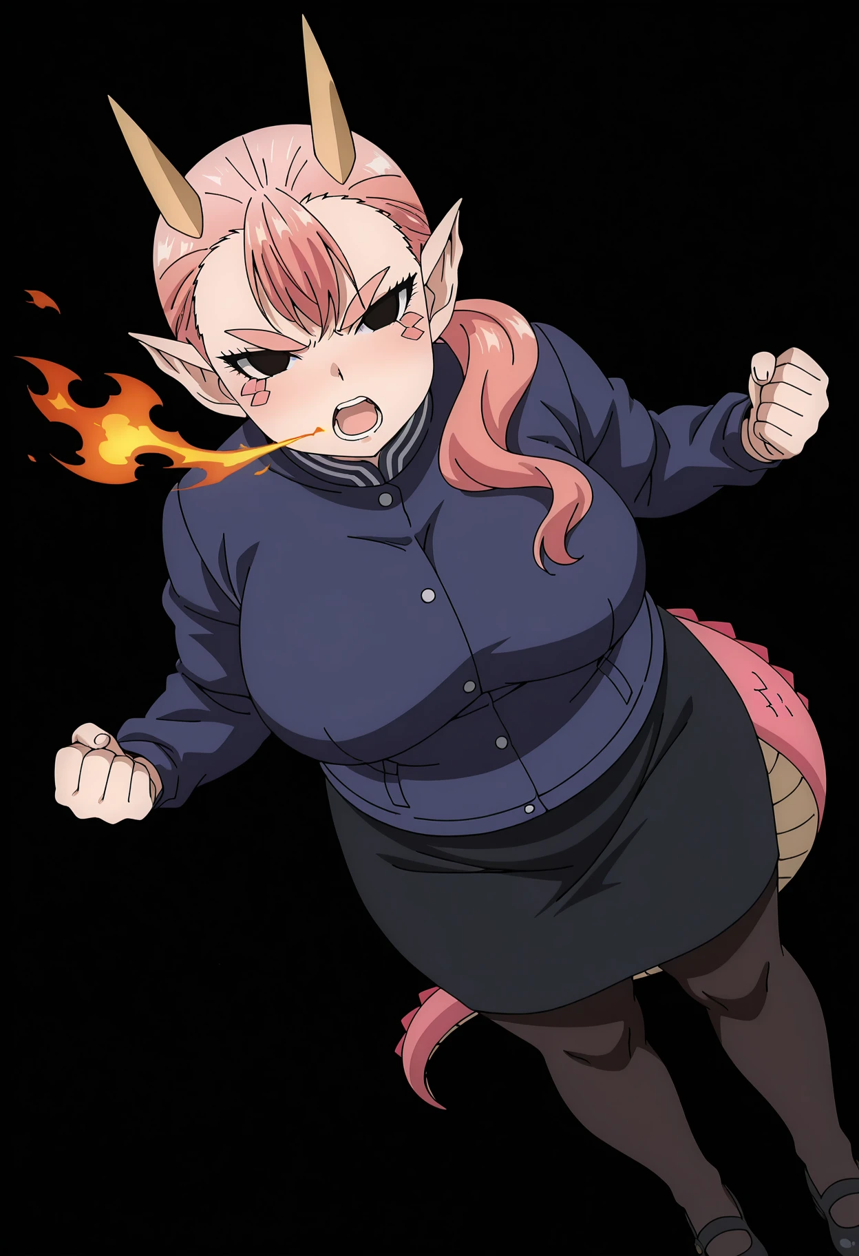 1girl, gonda, dragon girl, pointy ears, long hair, pink hair, ponytail, bangs, thick eyebrows, black eyes, horns, scales, large breasts, dragon tail, plump