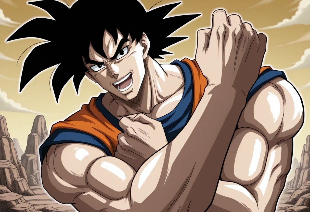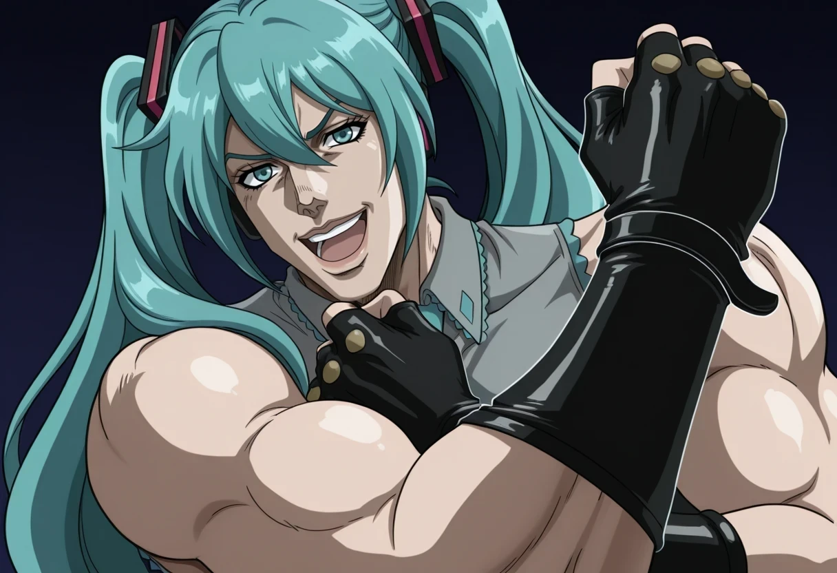 jojonice,araki hirohiko \(style\),upper body,muscular male,smile,leaning to the side,v-shaped eyebrows,Description