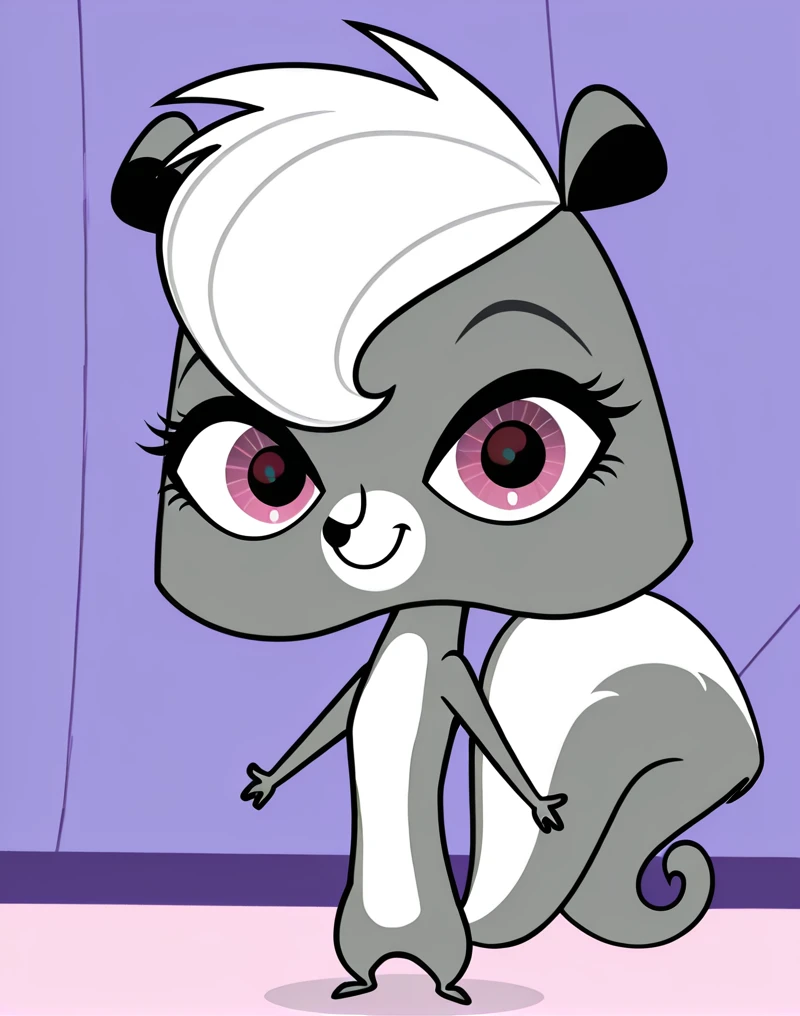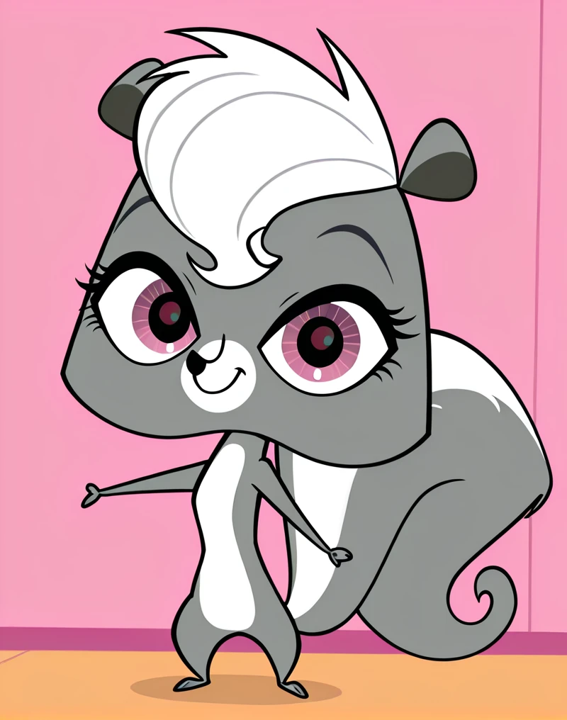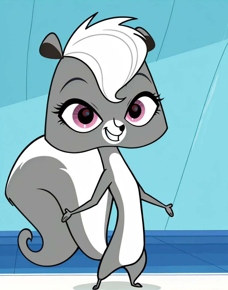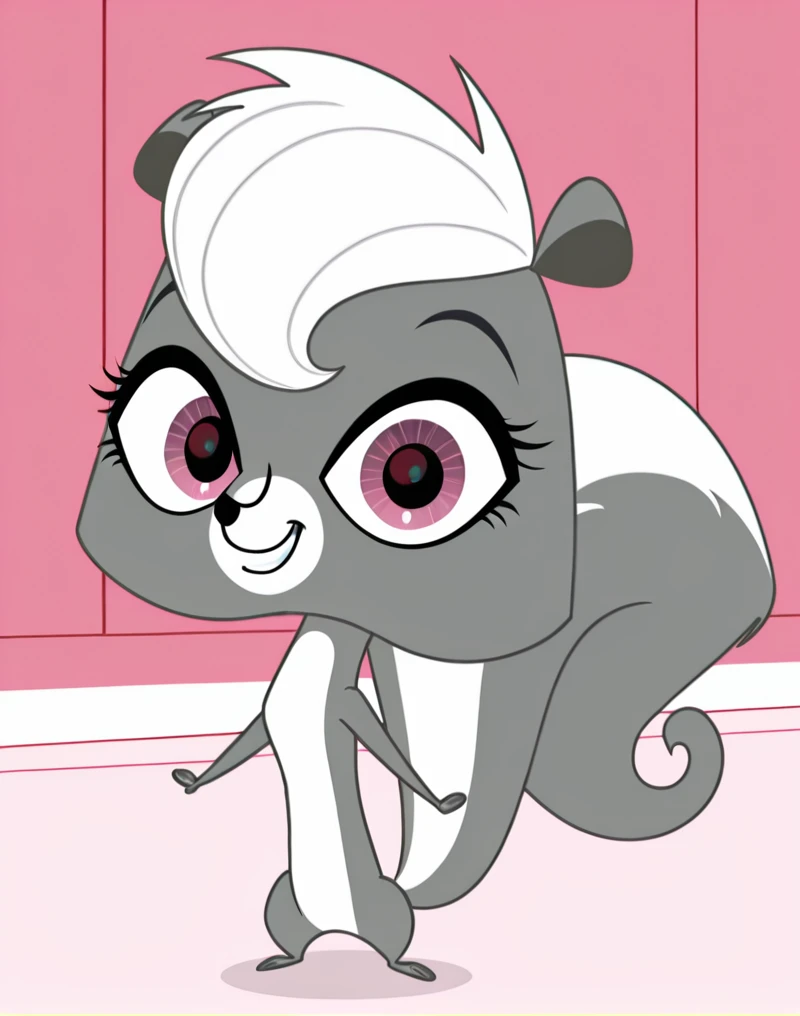 PepperClark, skunk, gray fur, two-tone fur, white hair, skunk nose, skunk ears, skunk tail, pink eyes, semi-anthro