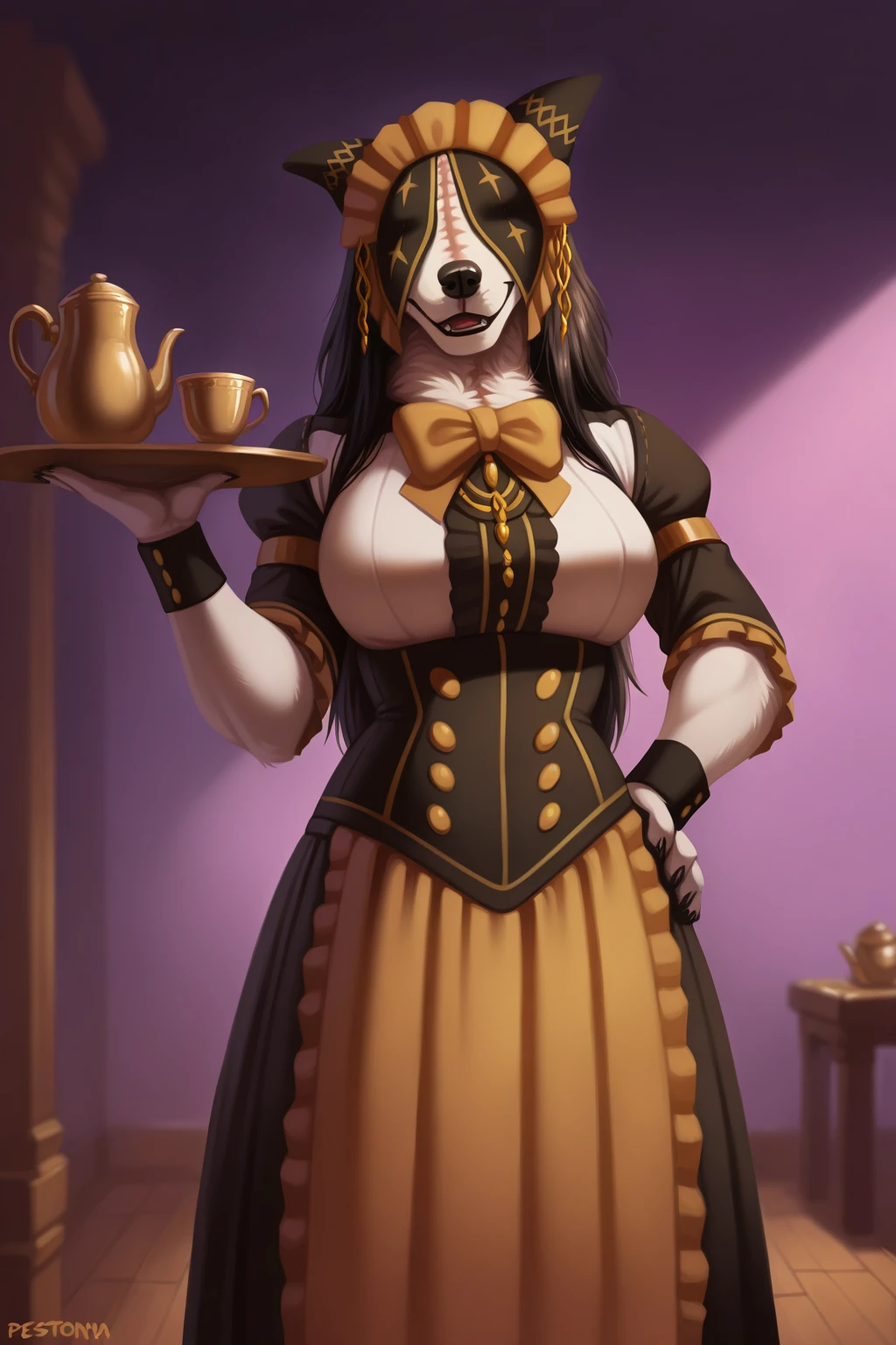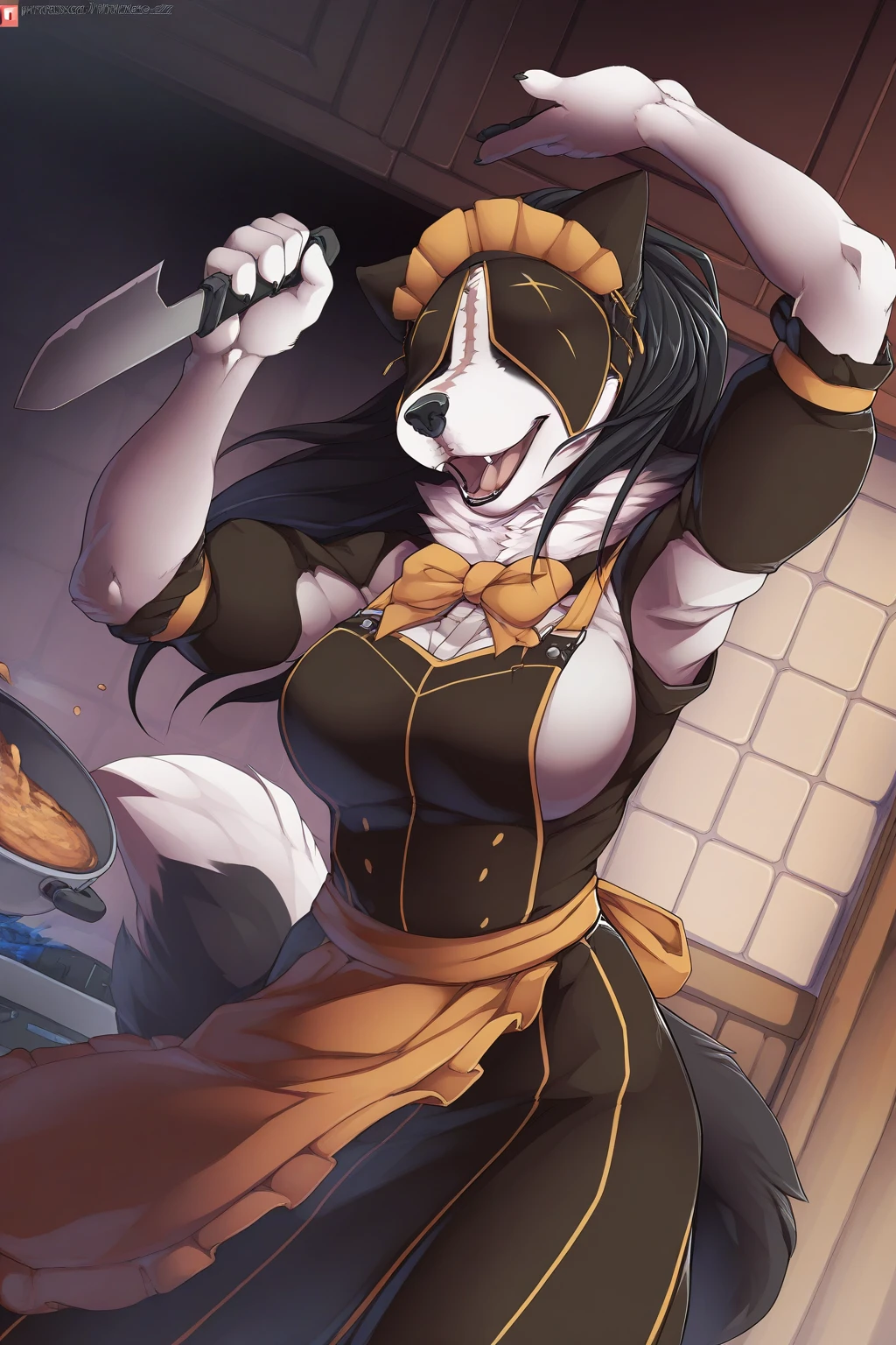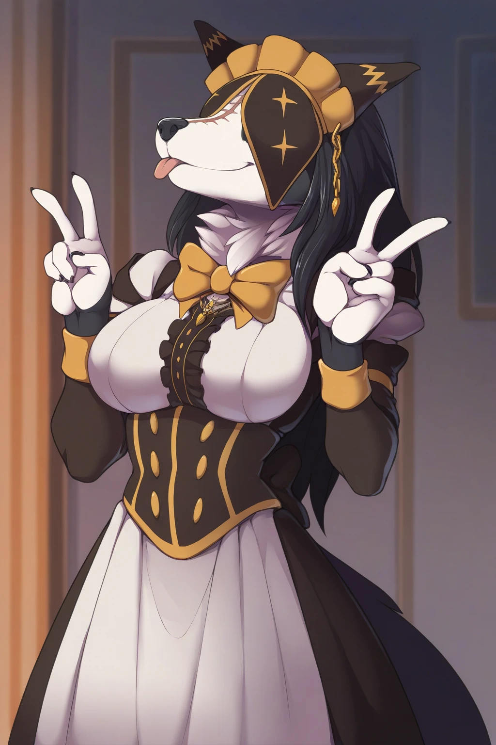 Helpful tags: maid, neck tuft, white tuft, two-toned body, black and white body, snout, white hands, black nails, (scar on neck:0.8)