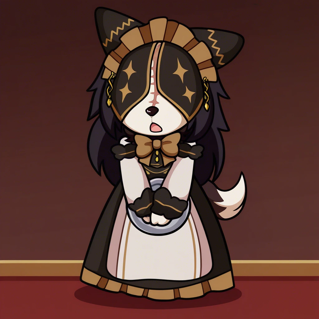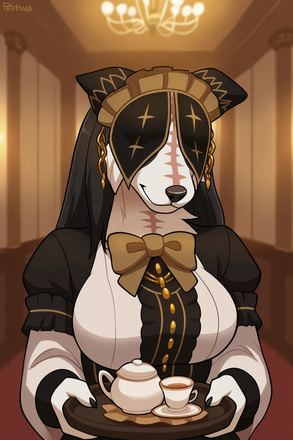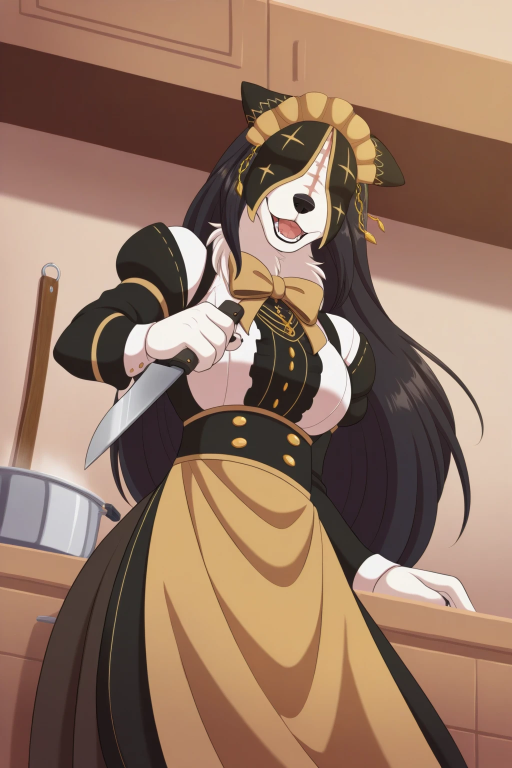 Helpful tags: maid, neck tuft, white tuft, two-toned body, black and white body, snout, white hands, black nails, (scar on neck:0.8)