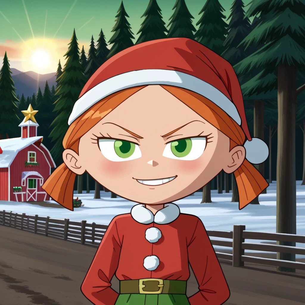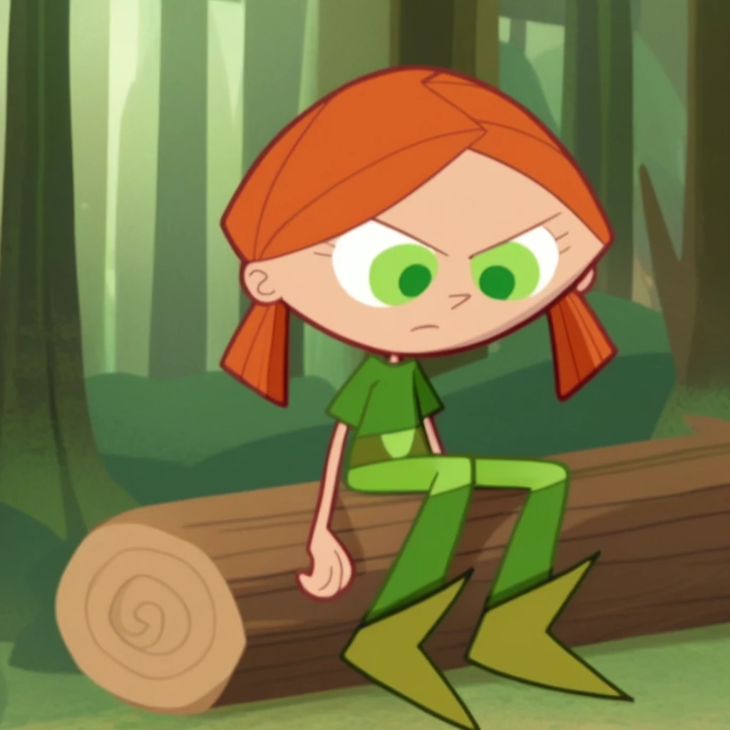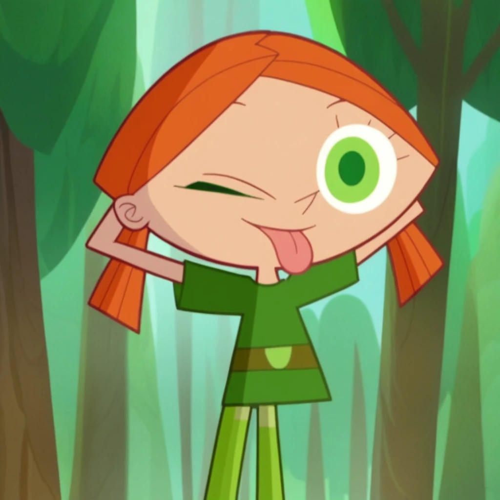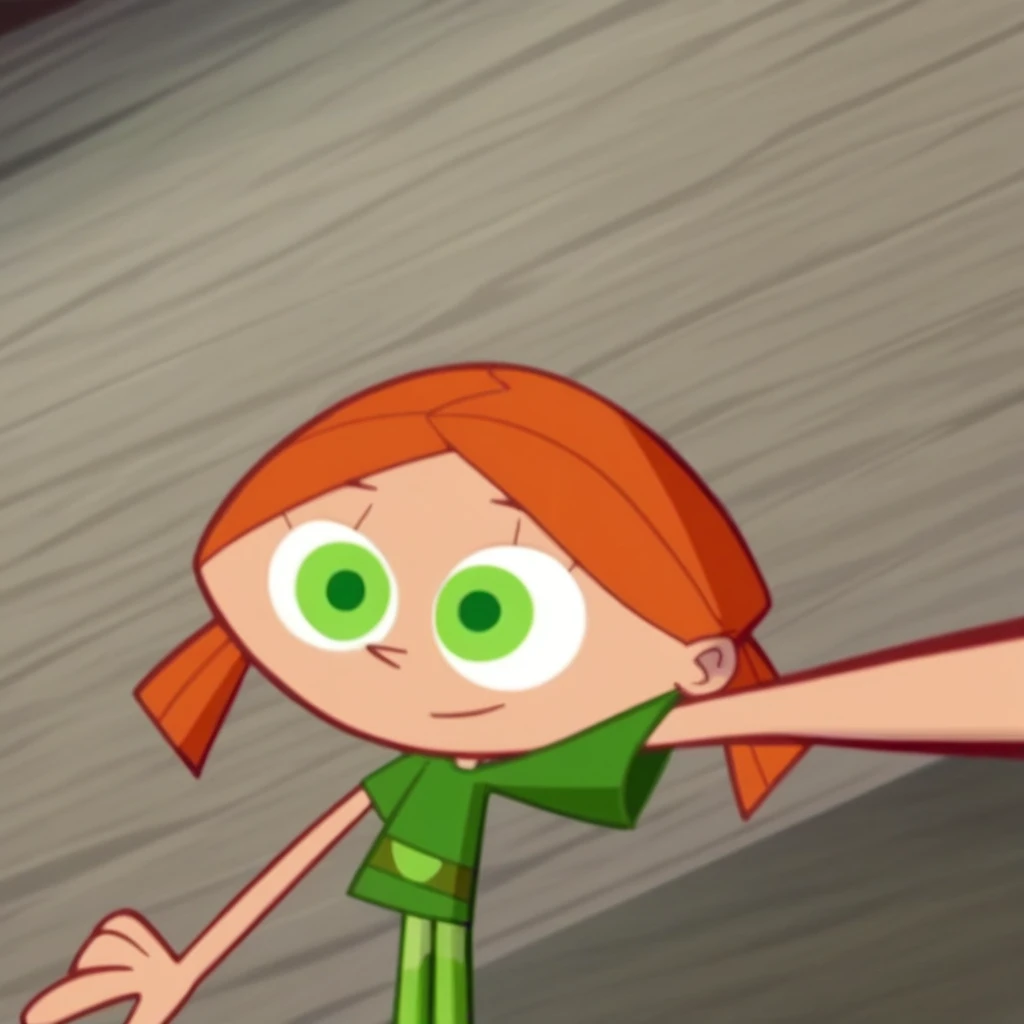 elspeth, green eyes, orange hair, twintails, shirt, pants