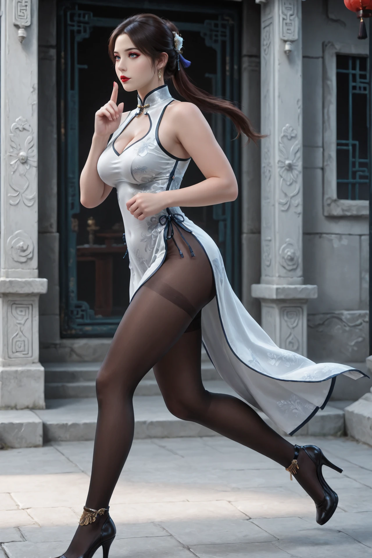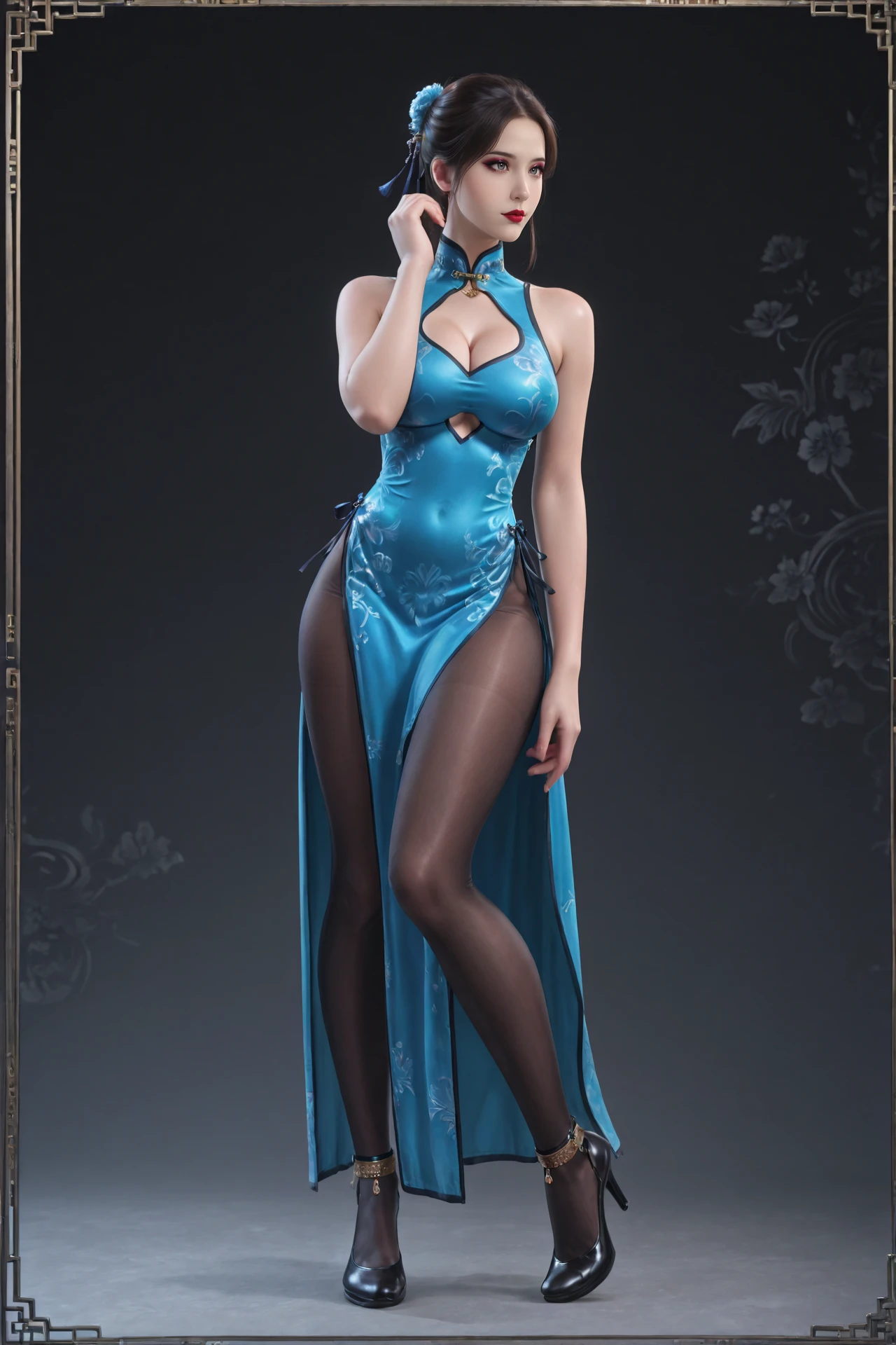jewelry,collar, chinese_clothes,china_dress,side_slit,pantyhose,bare_shoulders,anklet,strappy_heels,high_heels, large_breasts,cleavage_cutout,side-tie,