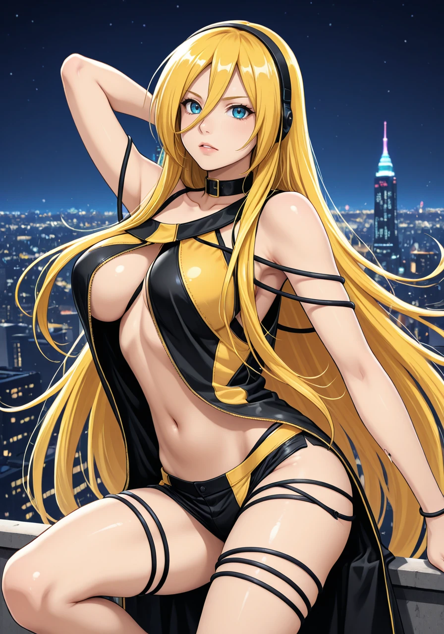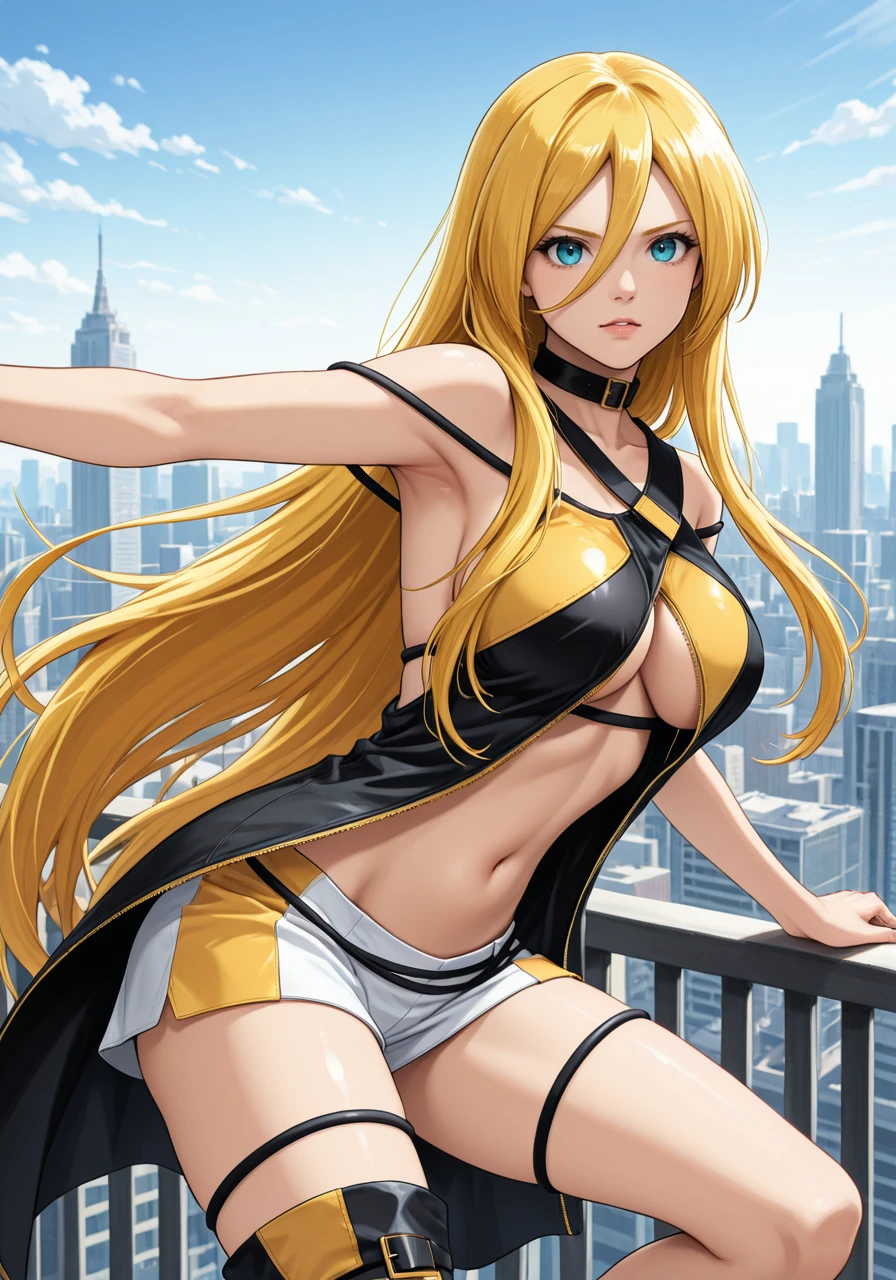 long hair, large breasts, blue eyes, boots,