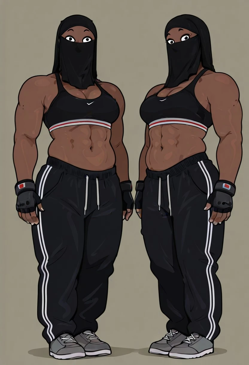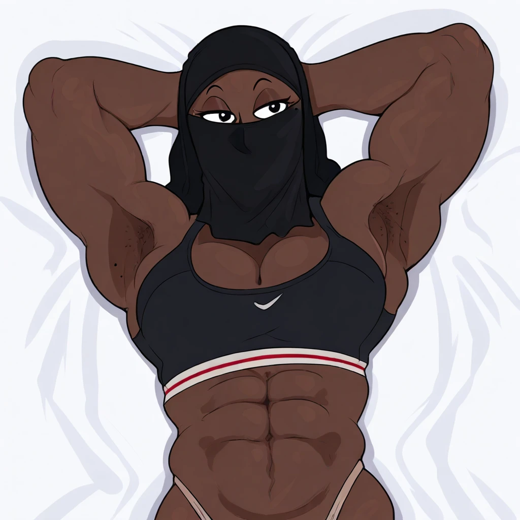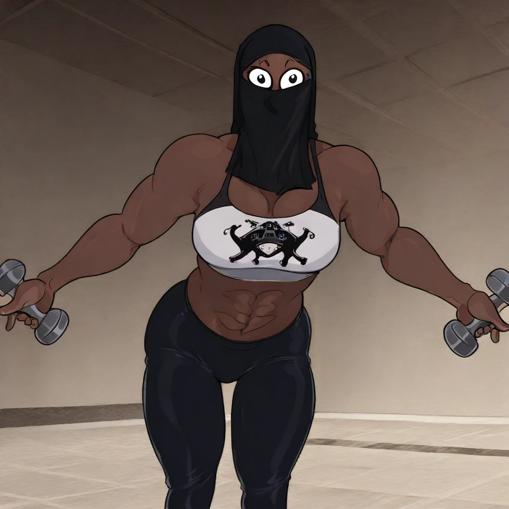 uzialmahdi, dark skin, niqab, covered face, eyelashes, eyeliner, big breasts, muscular, black eyes, mole under eye, thick thighs, covered face, abs, black niqab, biceps, broad shoulders, muscular female, small eyebrows