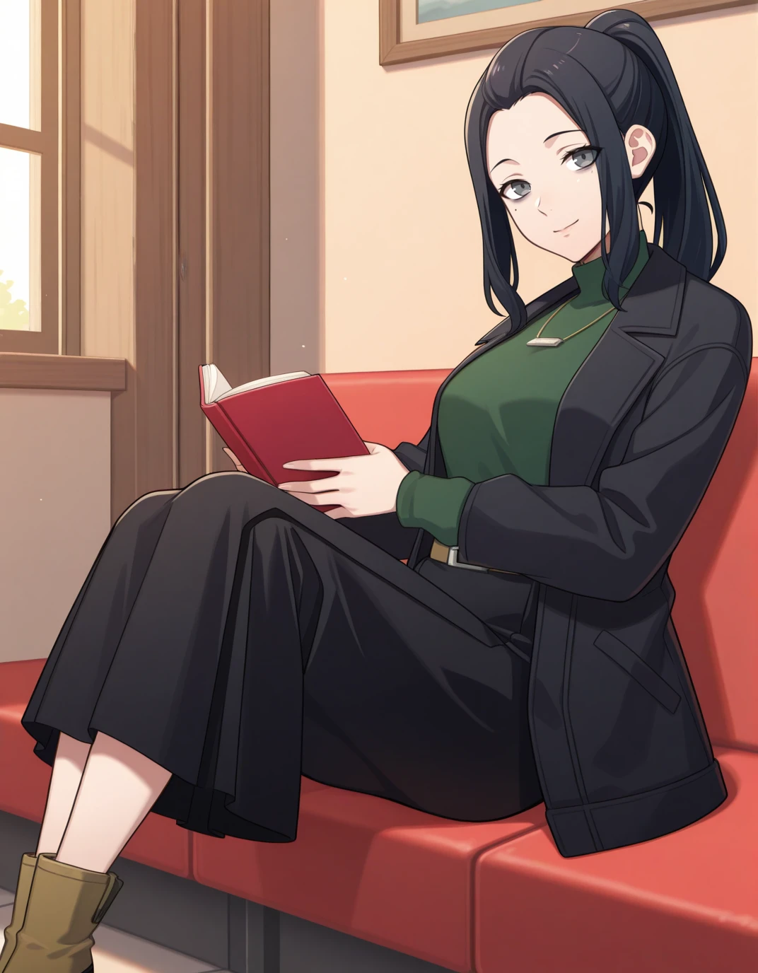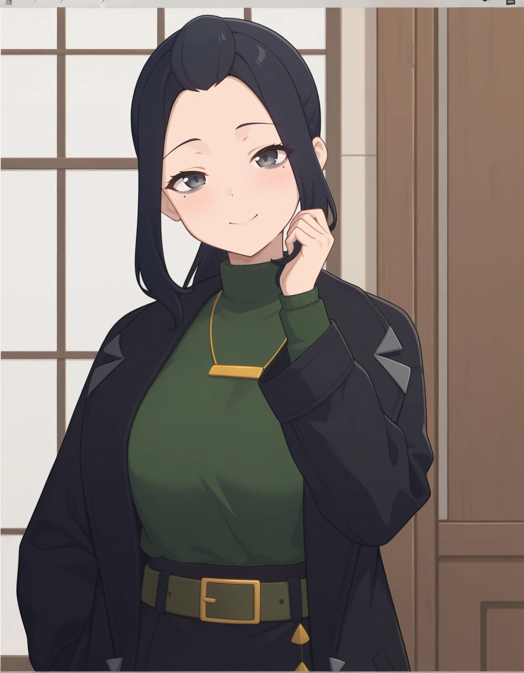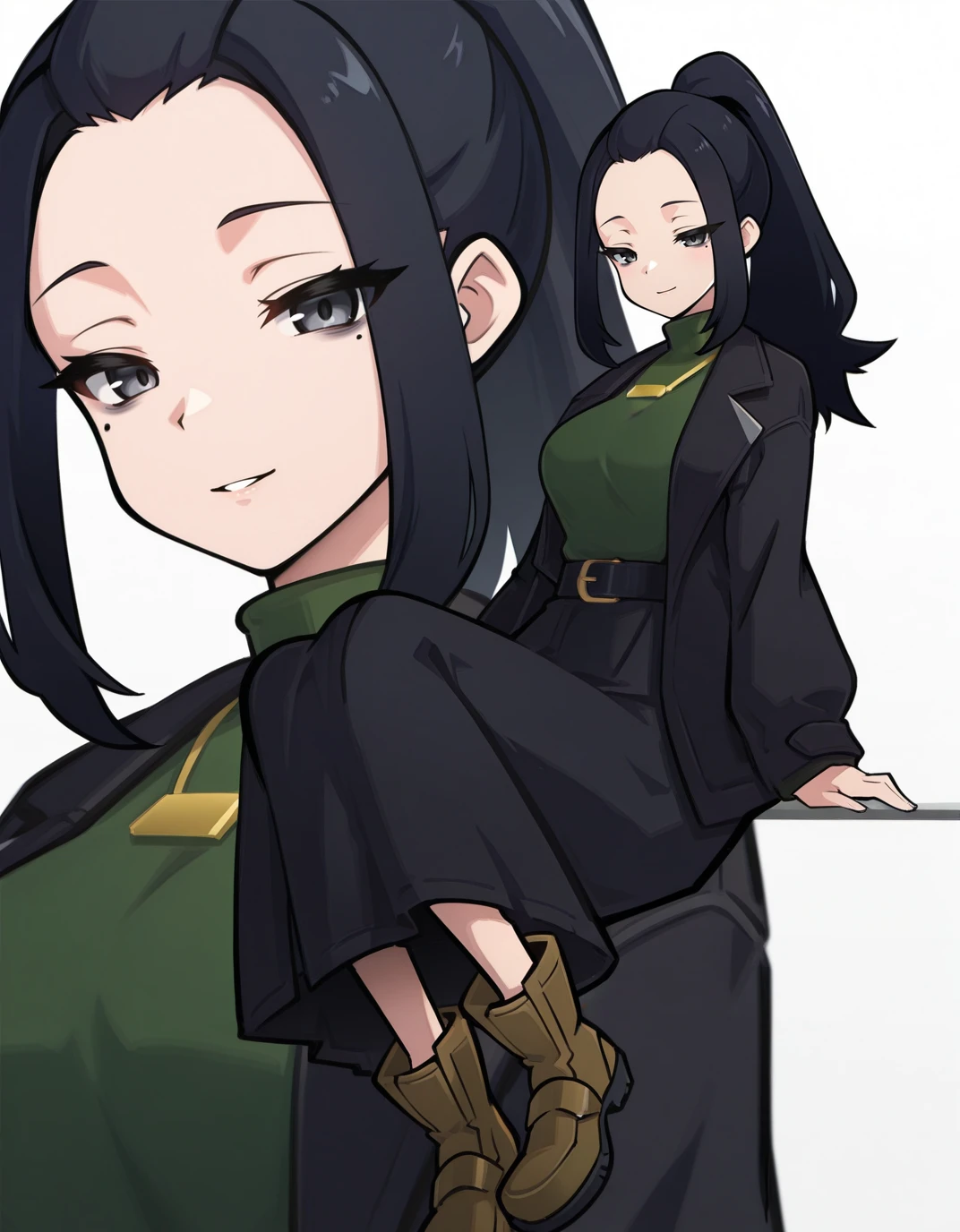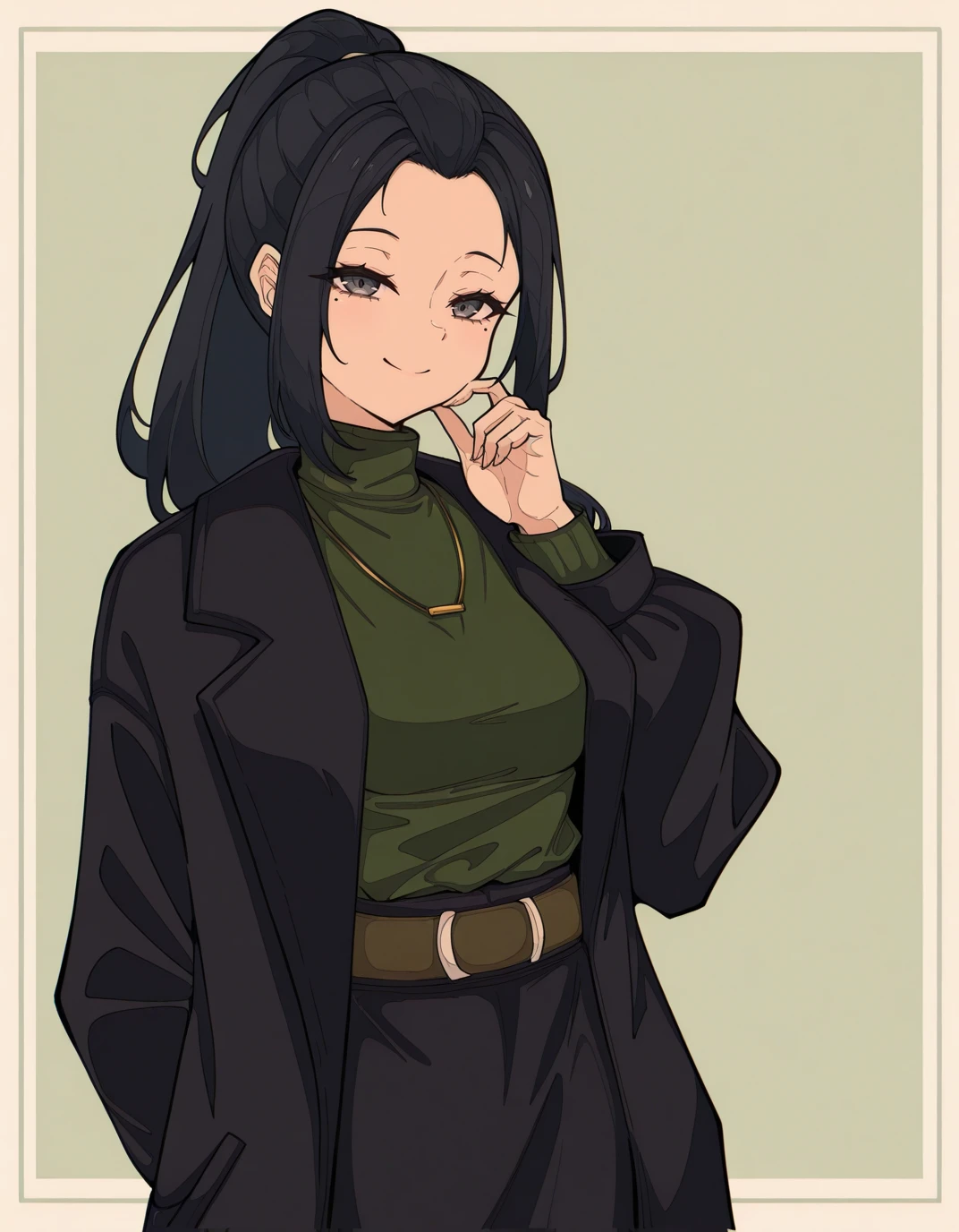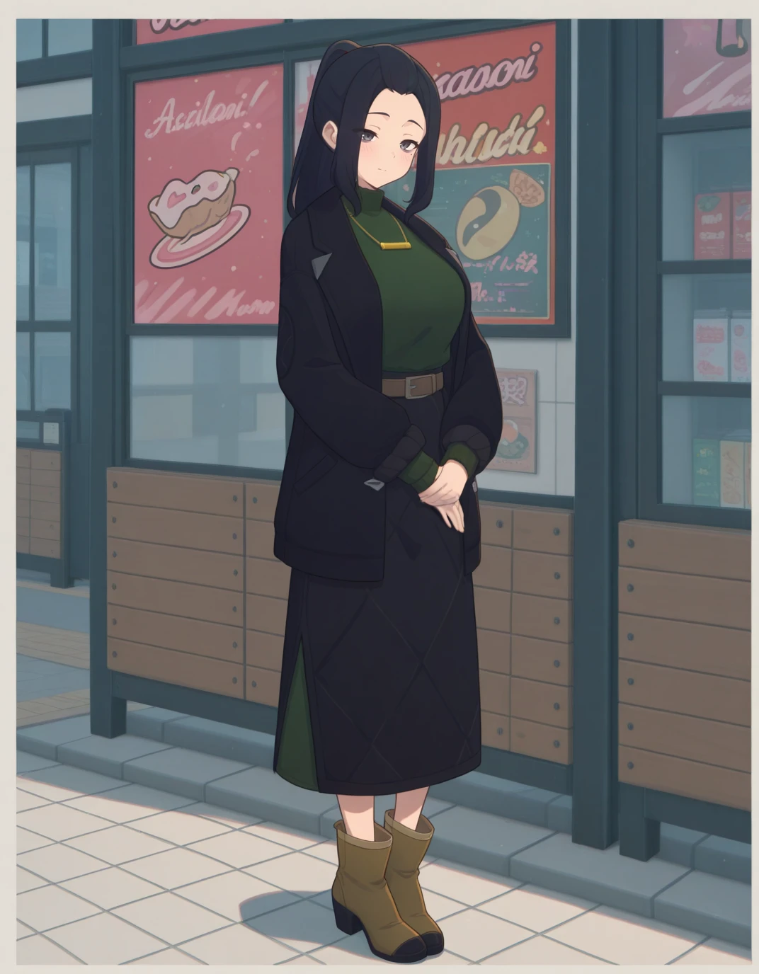 AECaroni, grey eyes, black eyes, black hair, forehead, long hair, mole under eye, ponytail, sidelocks, black coat, long sleeves, green sweater, turtleneck sweater, necklace, belt, black skirt, long skirt, ankle boots, brown footwear,