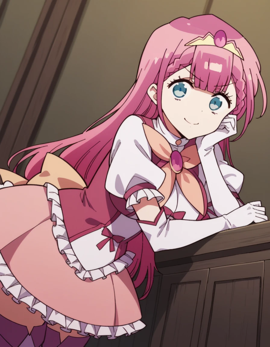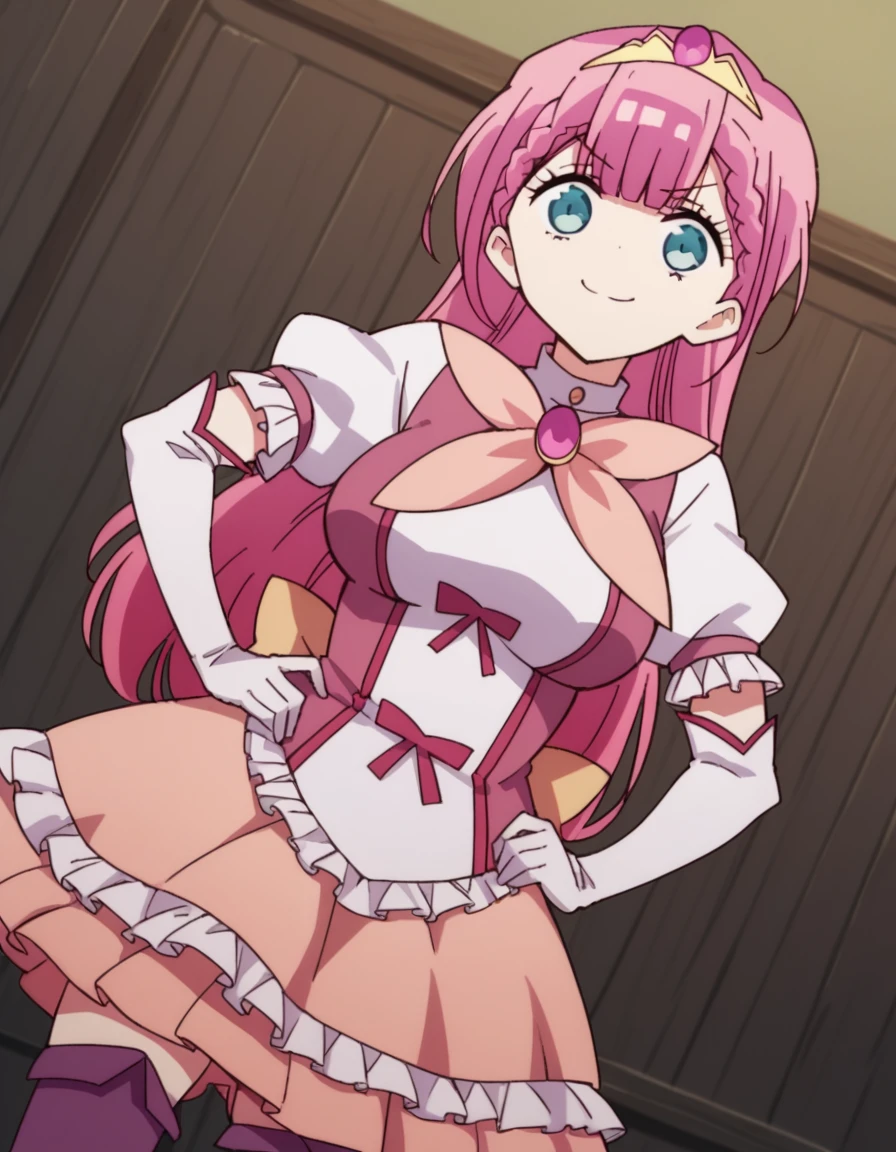 boots, center frills, dress, elbow gloves, frilled skirt, frills, gloves, magical girl, pink skirt, puffy short sleeves, puffy sleeves, purple thighhighs, short sleeves, skirt, thigh boots, thighhighs, tiara, white gloves,