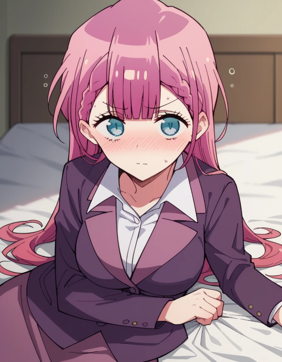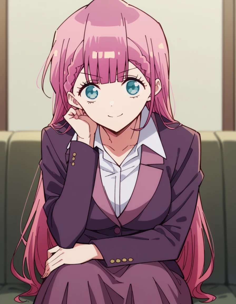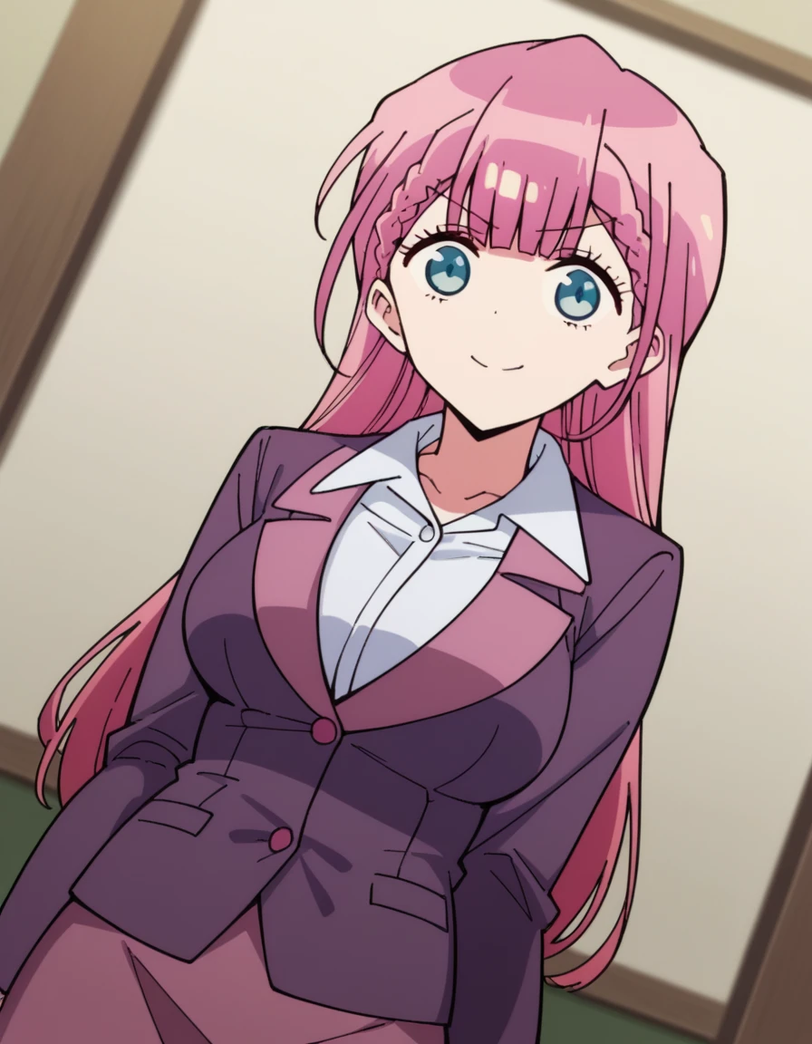 <lora:mafuyu-kirisu-s2-ponyxl-lora-nochekaiser:1>, mafuyu kirisu, blue eyes, braid, long hair, twin braids, pink hair, large breasts,