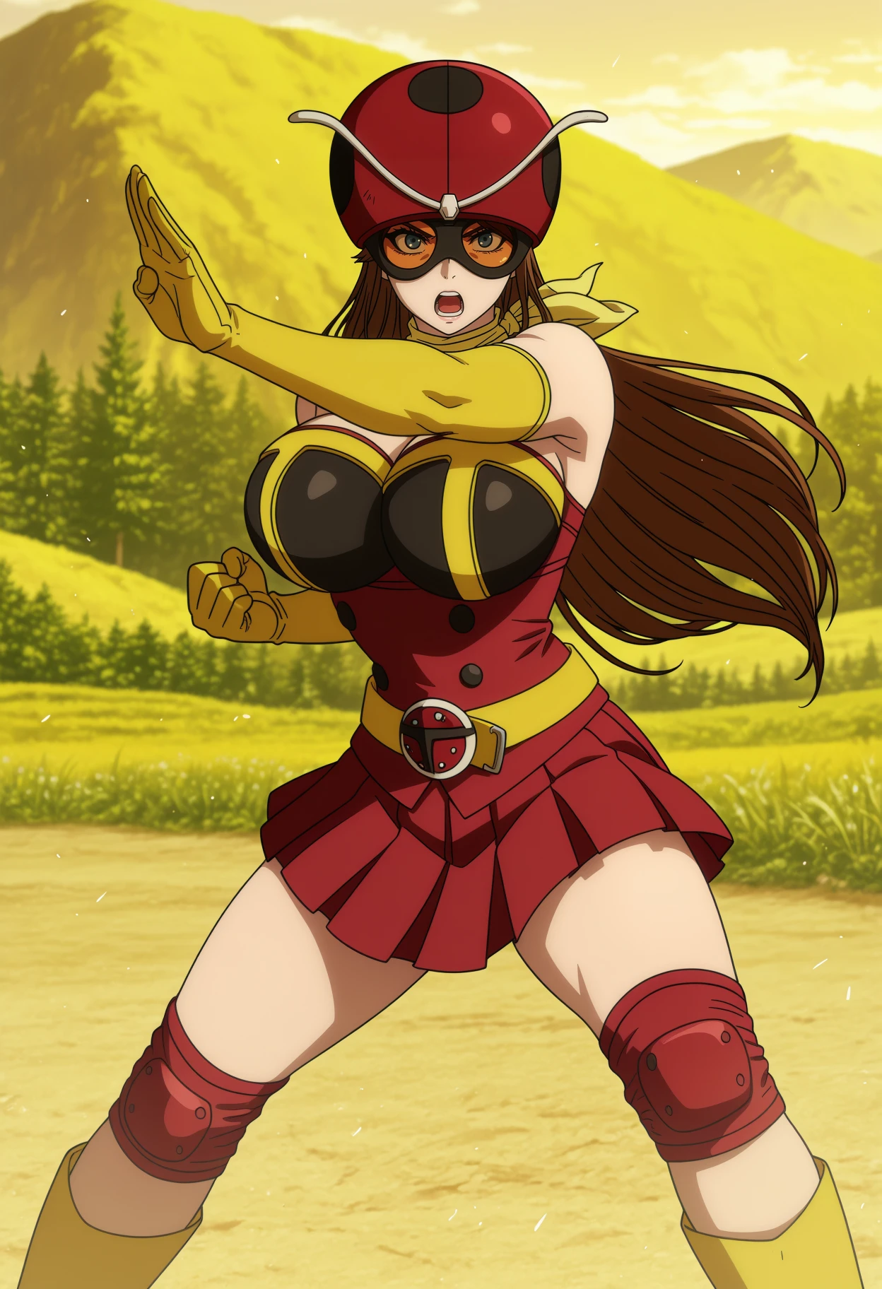 1girl,solo,mm,mature female,long hair,brown hair,blue eyes,large breasts,anime coloring, hero outfit,helmet,goggles,yellow scarf,yellow gloves,elbow gloves,leotard,red leotard,yellow belt,pleated skirt,red skirt,red knee pads,yellow boots