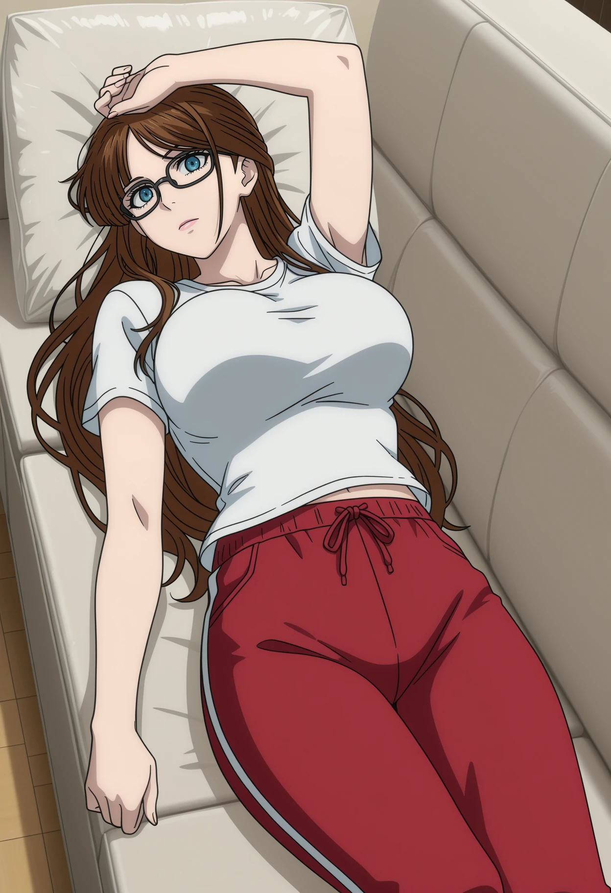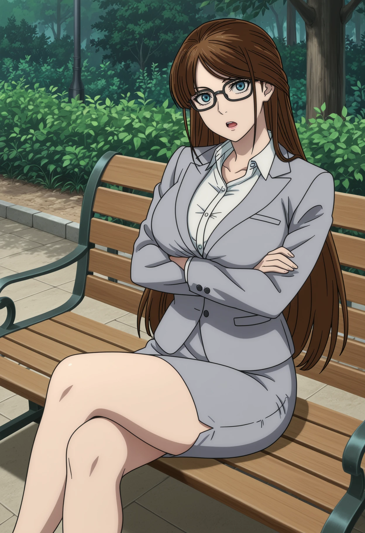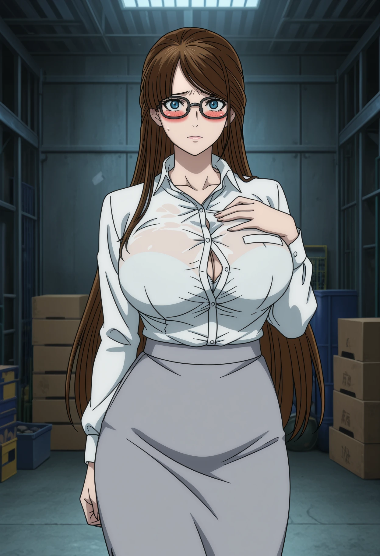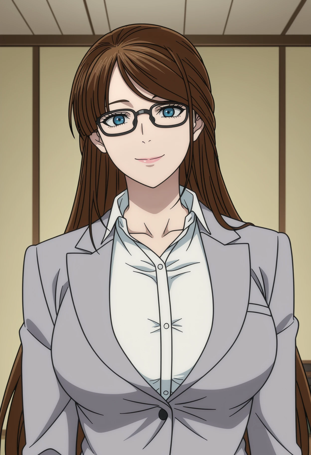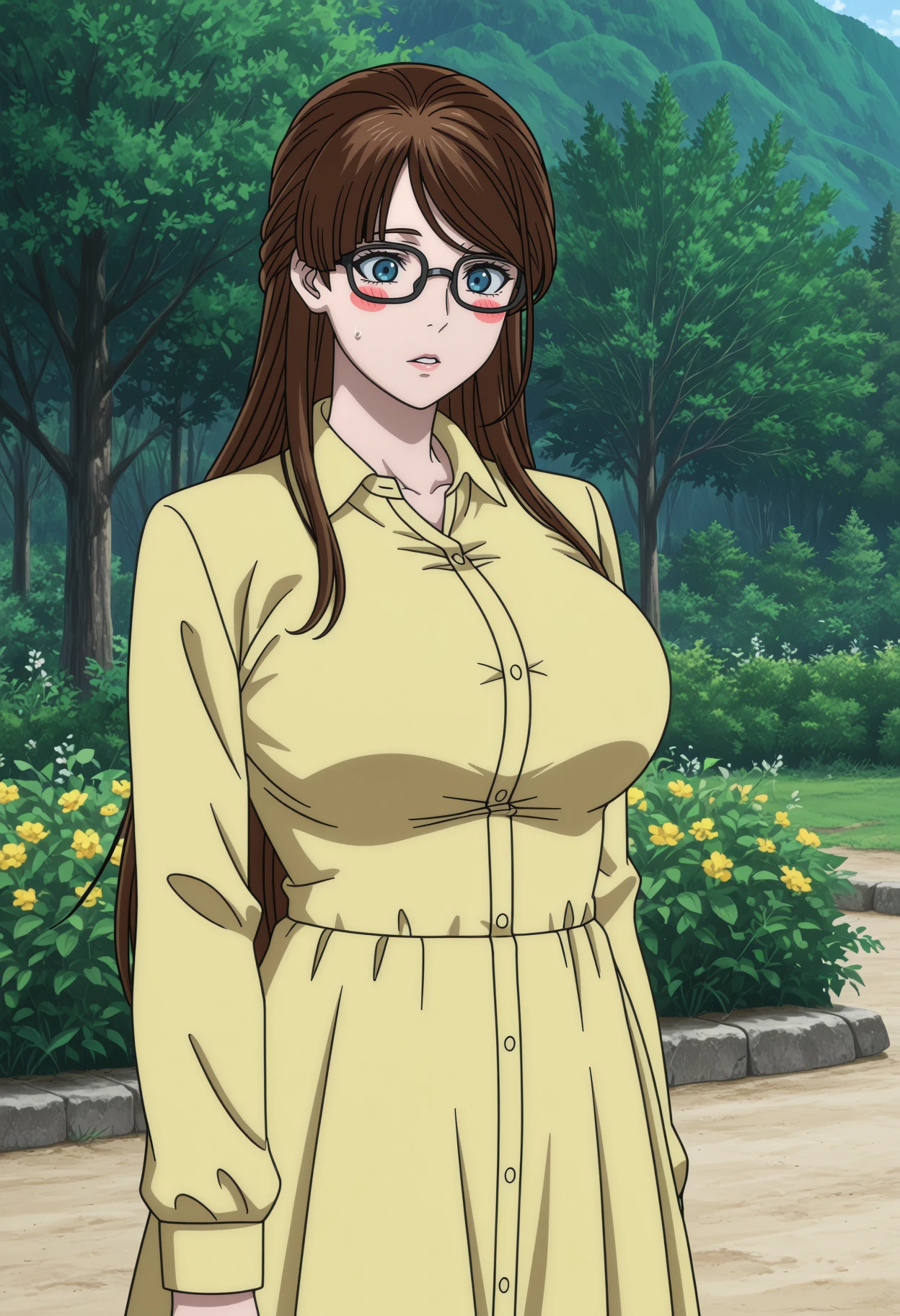 1girl,solo,mm,mature female,long hair,brown hair,blue eyes,glasses,half updo,large breasts,anime coloring