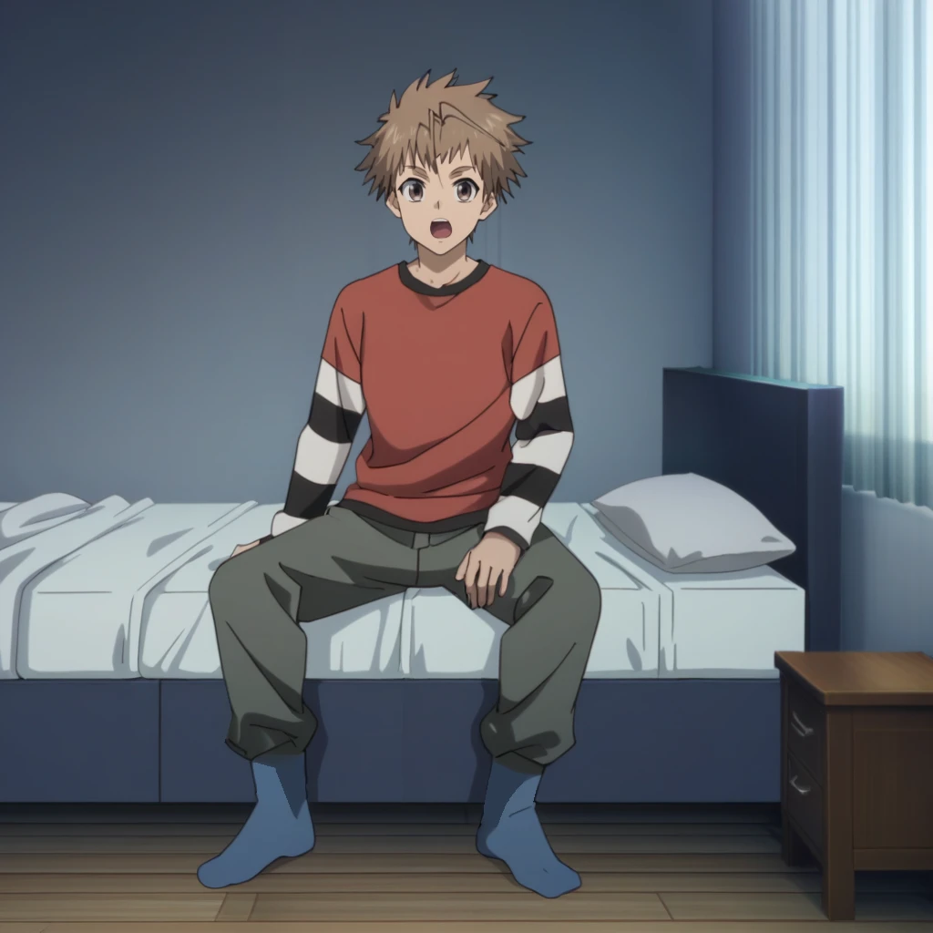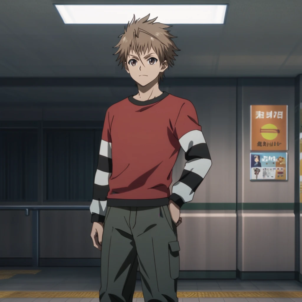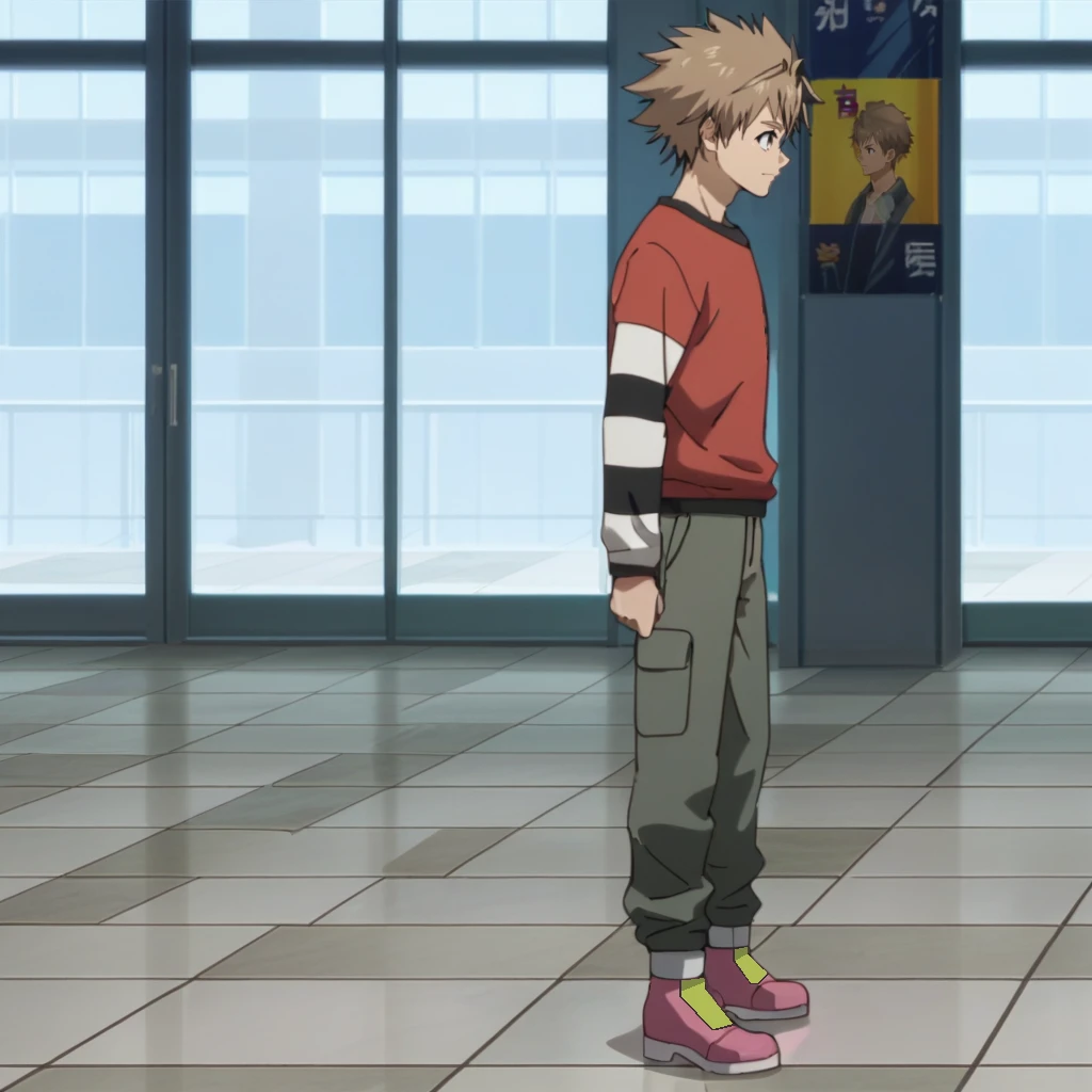Prompts: male, brown hair, spiked hair, brown eyes, shirt, long sleeves, pants, pink footwear, indoors (studio/tile floor/billboard (object)/glass door), indoors (train station/ceiling light/sign/magazine rack), indoors (lobby/door), indoors (bedroom/wooden floor/bed/white pillow/white sheets/bedside table/bookshelf/window/blinds), outdoors (city/building/sidewalk/bush/shop), outdoors (park/sky/cloud/tree/buildings in distance)