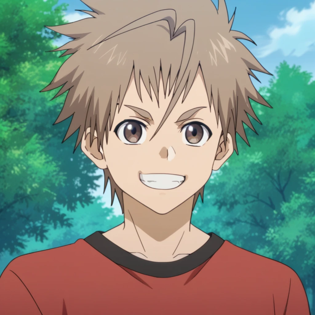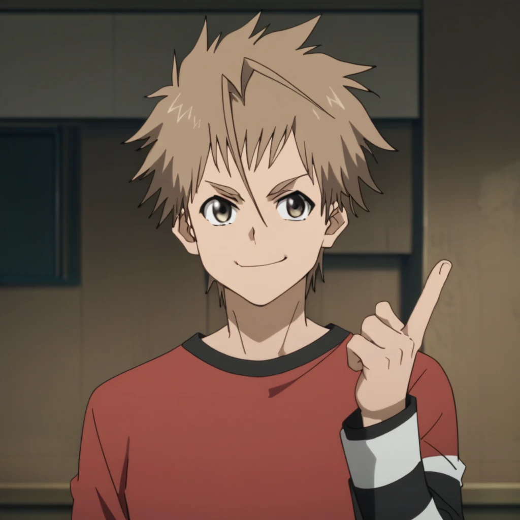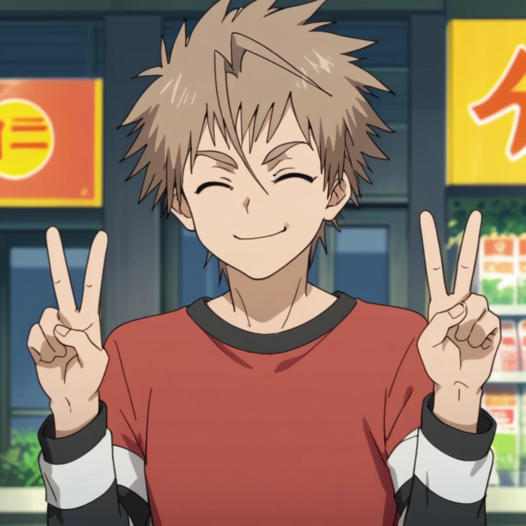 Prompts: male, brown hair, spiked hair, brown eyes, shirt, long sleeves, pants, pink footwear, indoors (studio/tile floor/billboard (object)/glass door), indoors (train station/ceiling light/sign/magazine rack), indoors (lobby/door), indoors (bedroom/wooden floor/bed/white pillow/white sheets/bedside table/bookshelf/window/blinds), outdoors (city/building/sidewalk/bush/shop), outdoors (park/sky/cloud/tree/buildings in distance)