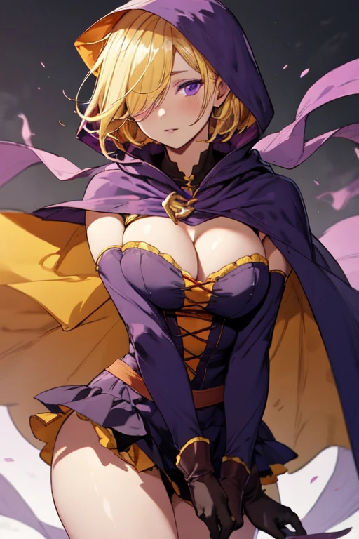 PearlHarem, 1girl, blonde hair, solo, hair over one eye, purple eyes, purple hood, cape, short hair, purple gloves, large breasts, cleavage, short dress, cloak