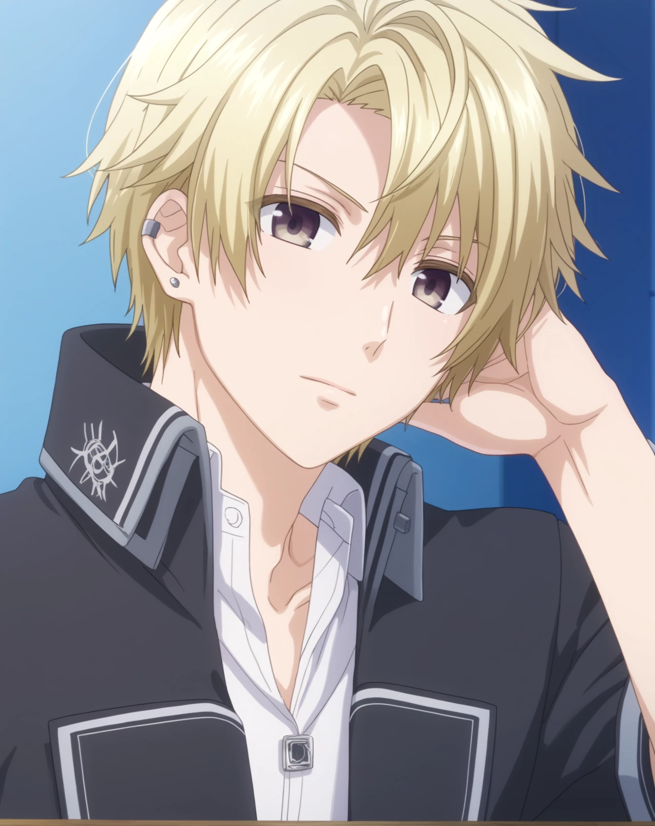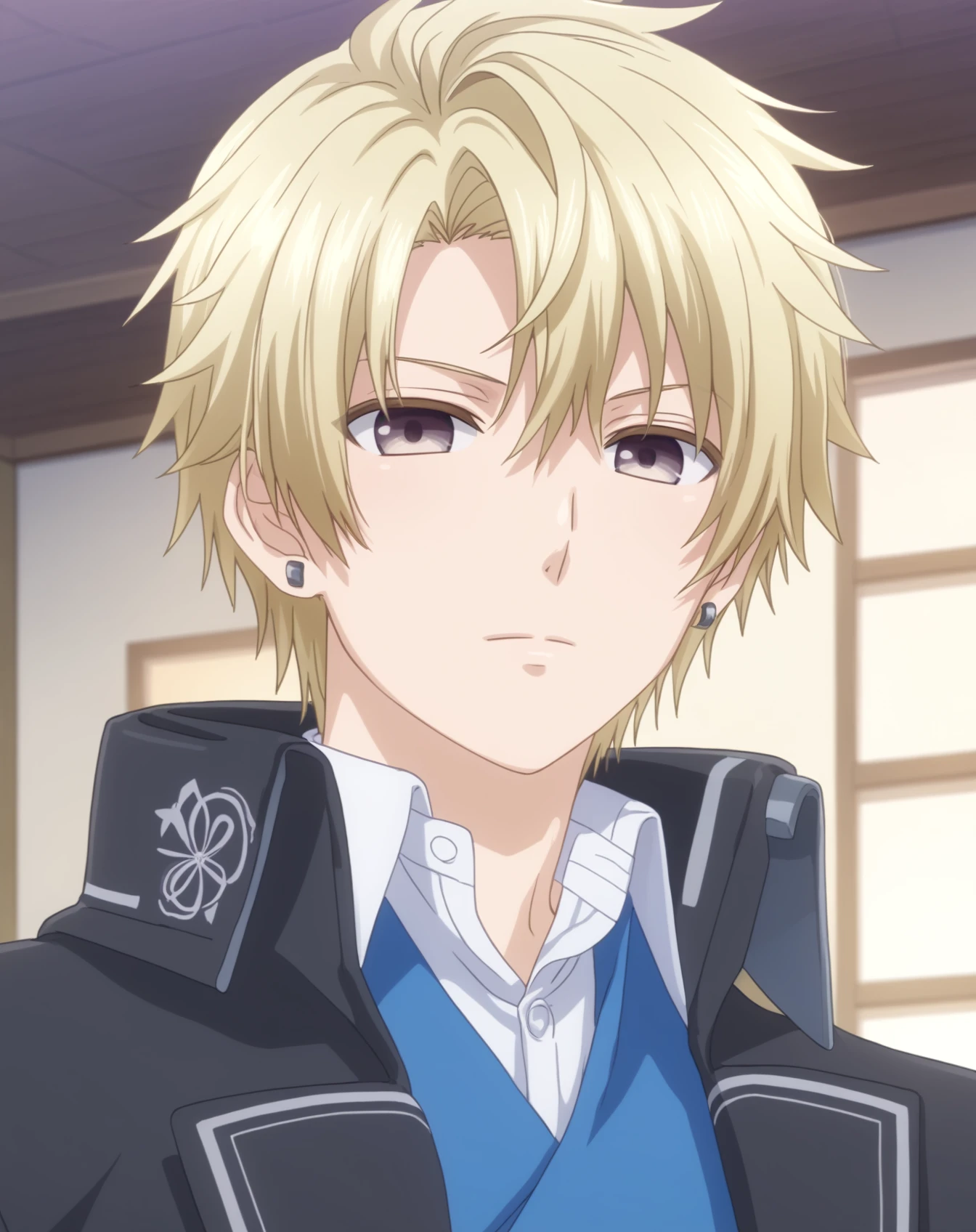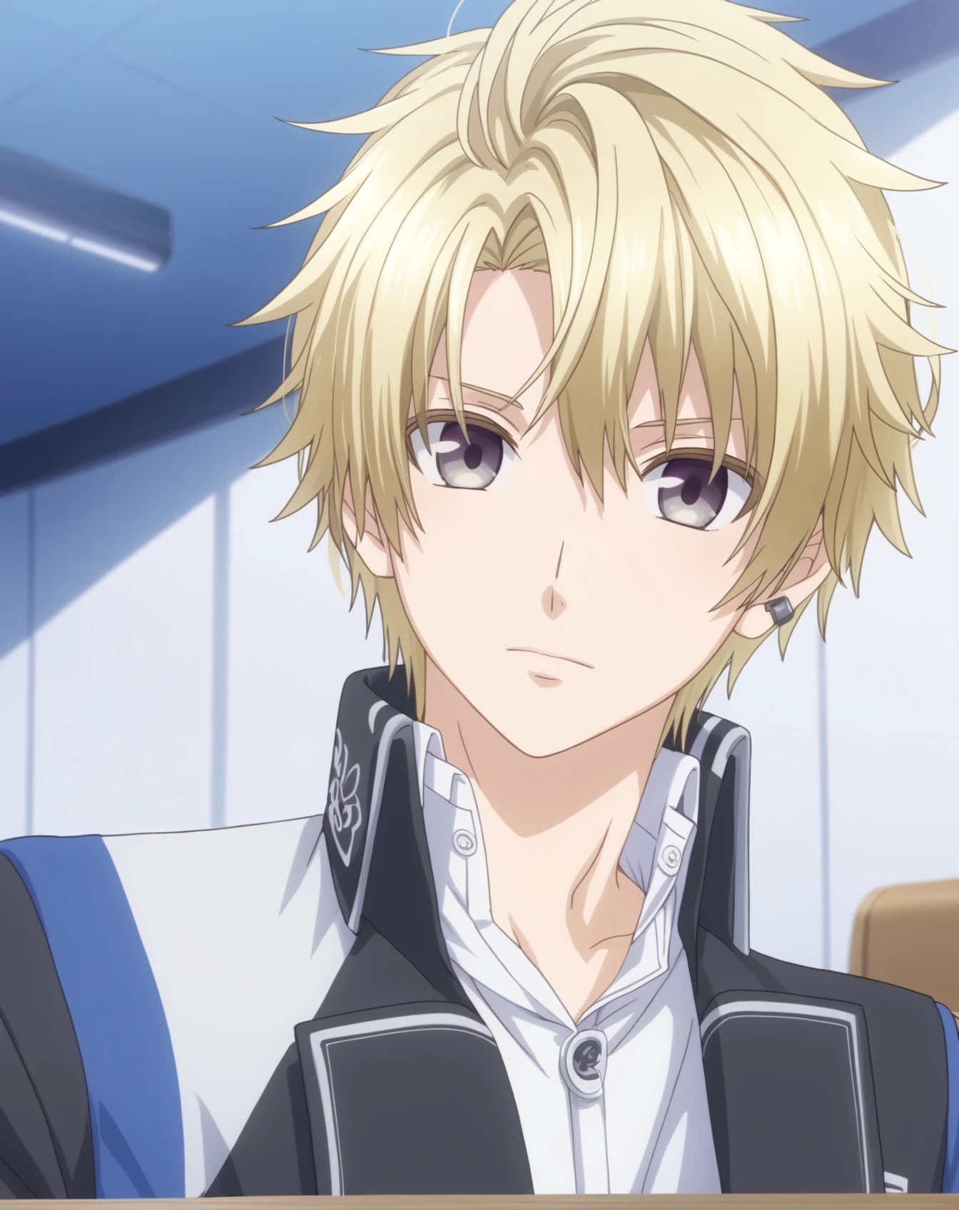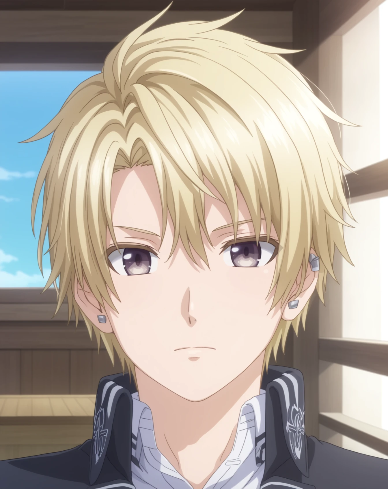 yuiga_kakeru_pony, blonde hair, grey eyes, short hair, bangs, hair between eyes, ear piercing,