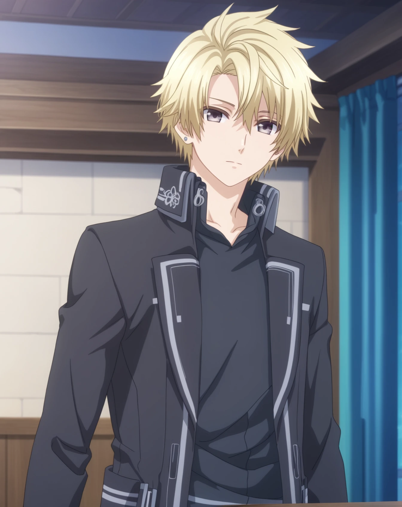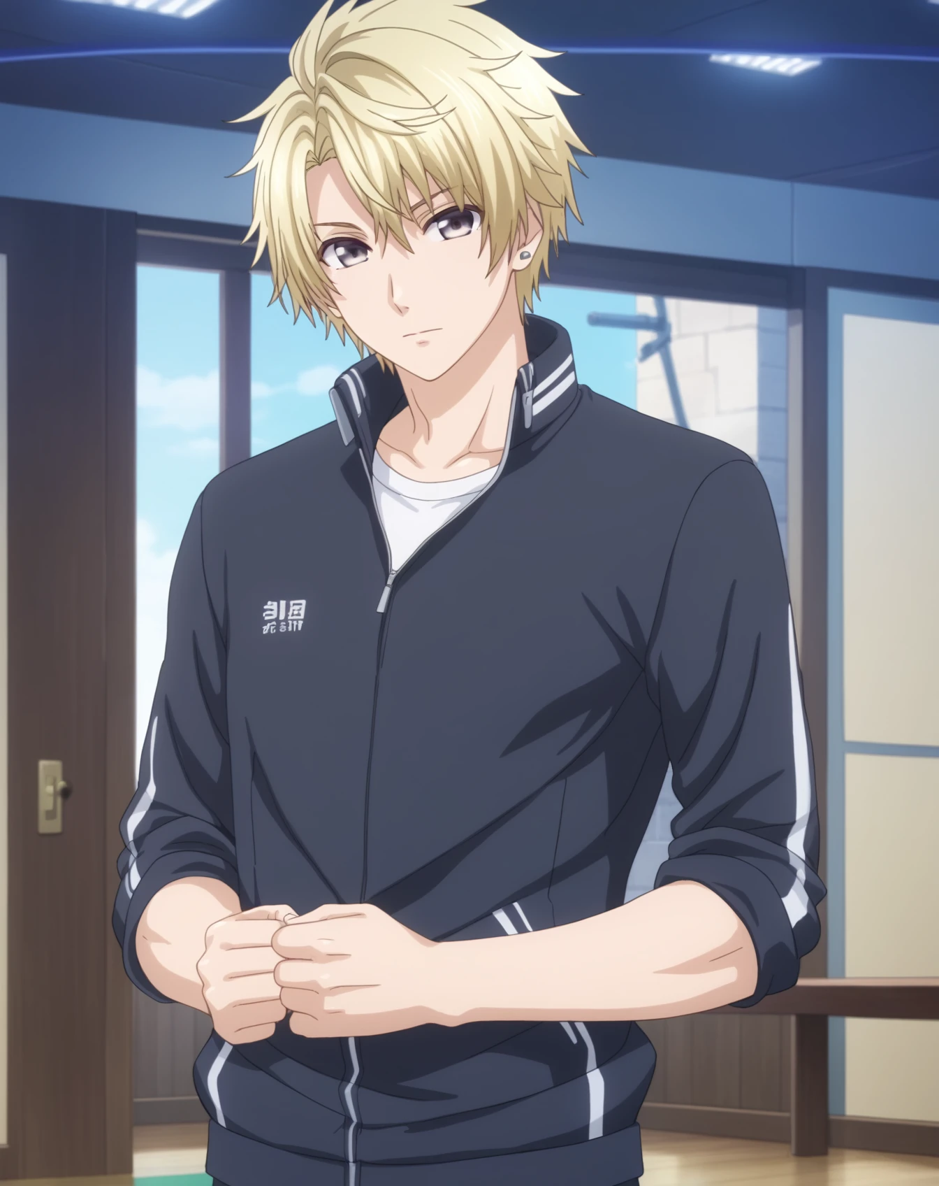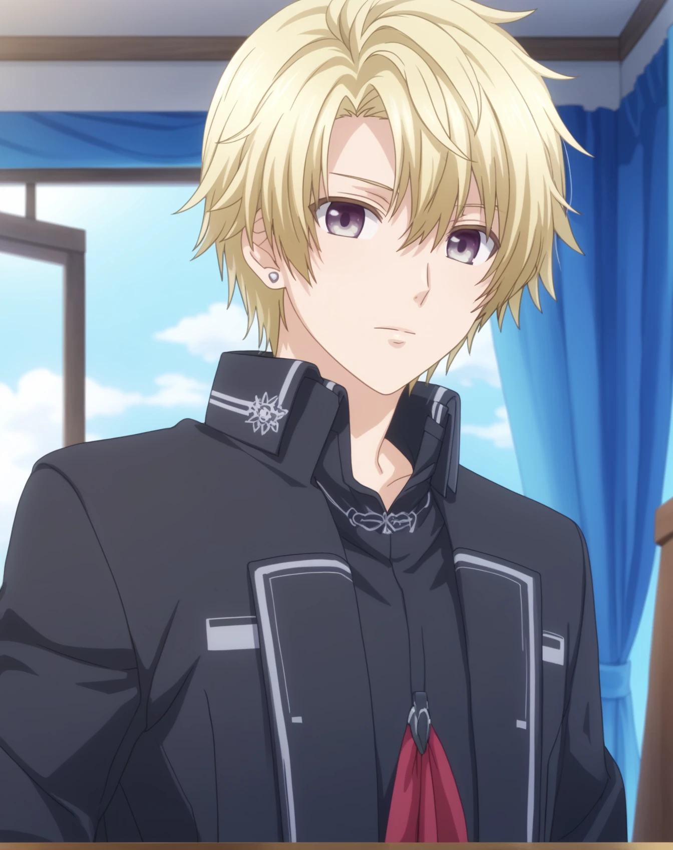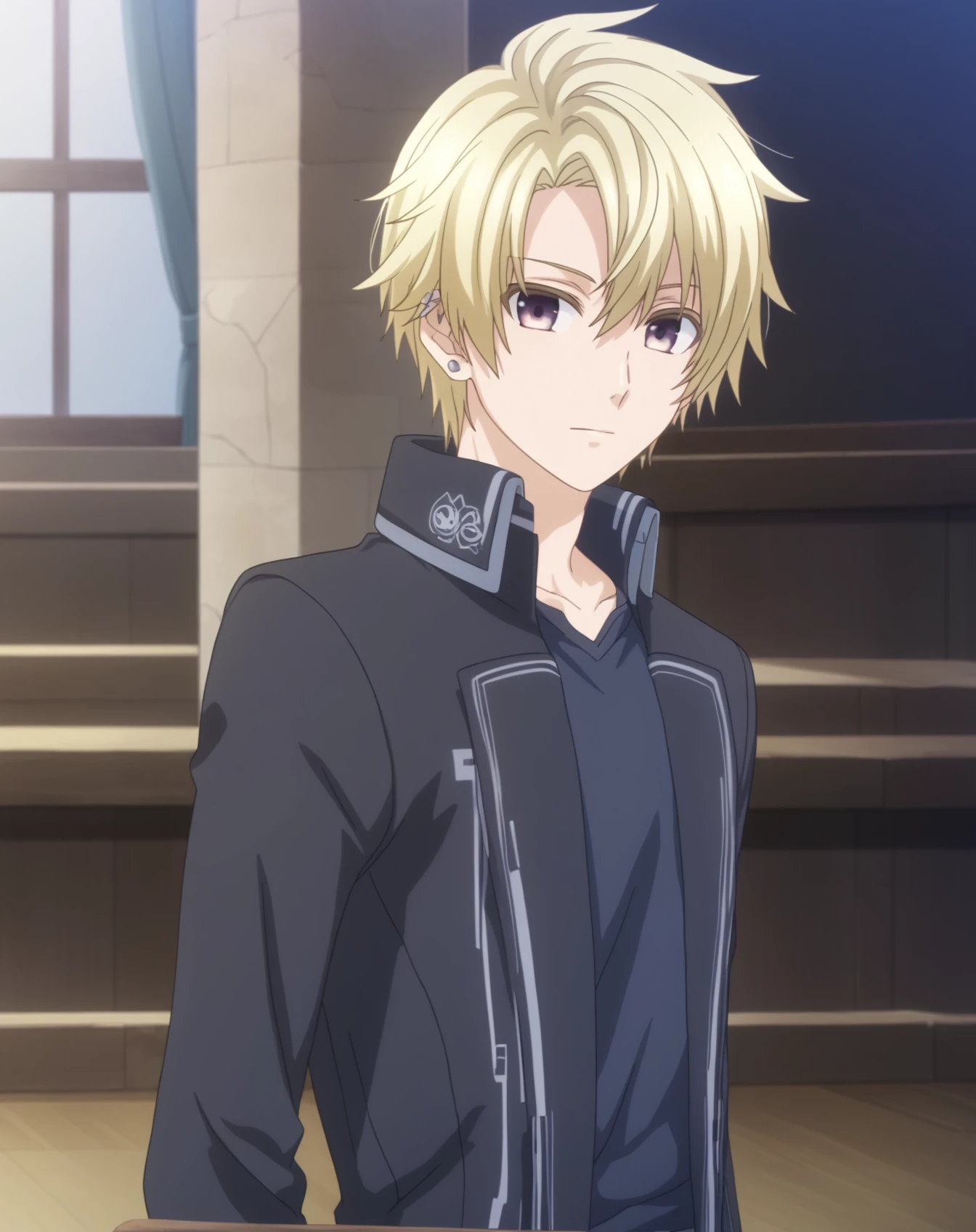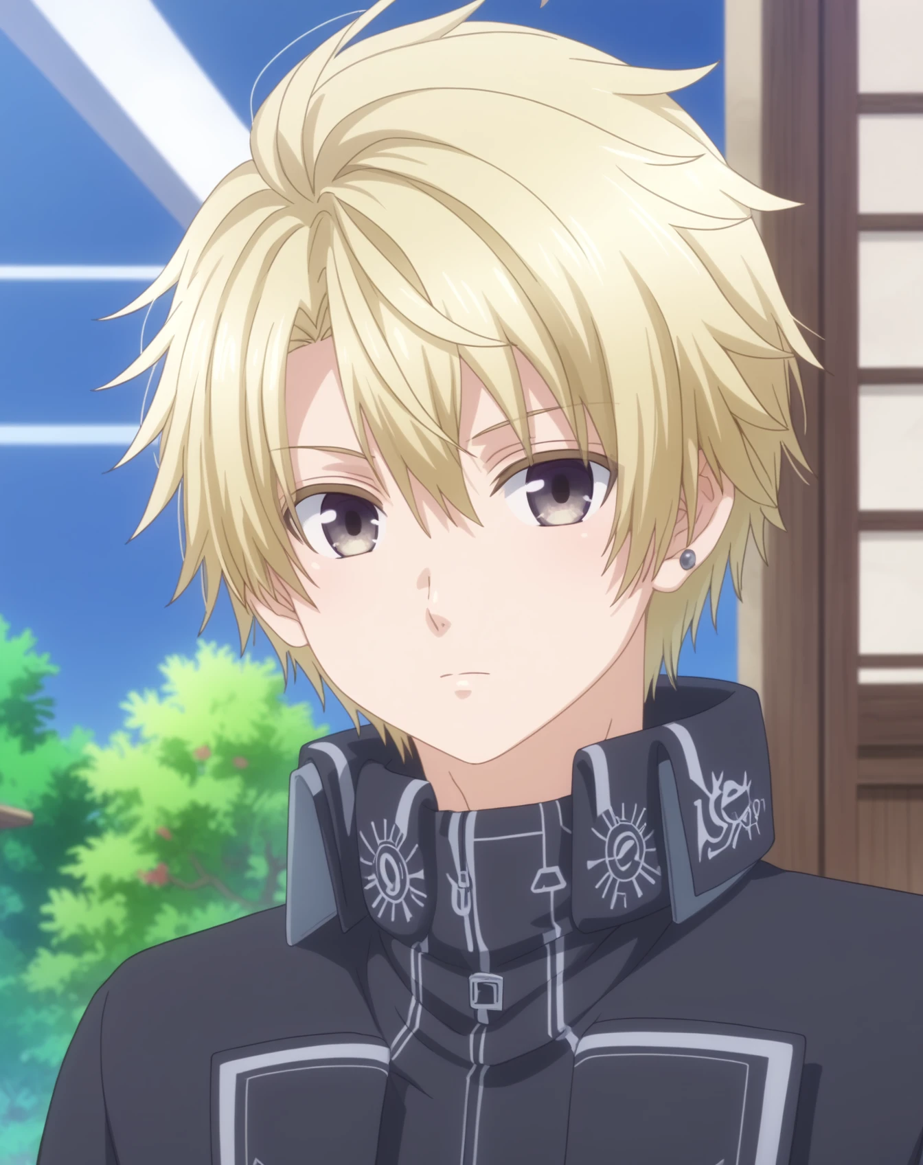 yuiga_kakeru_pony, blonde hair, grey eyes, short hair, bangs, hair between eyes, ear piercing,