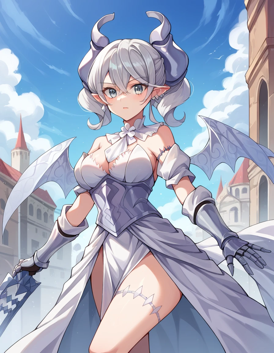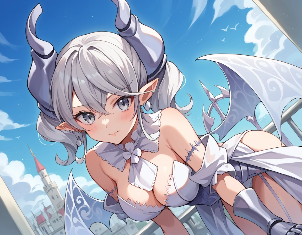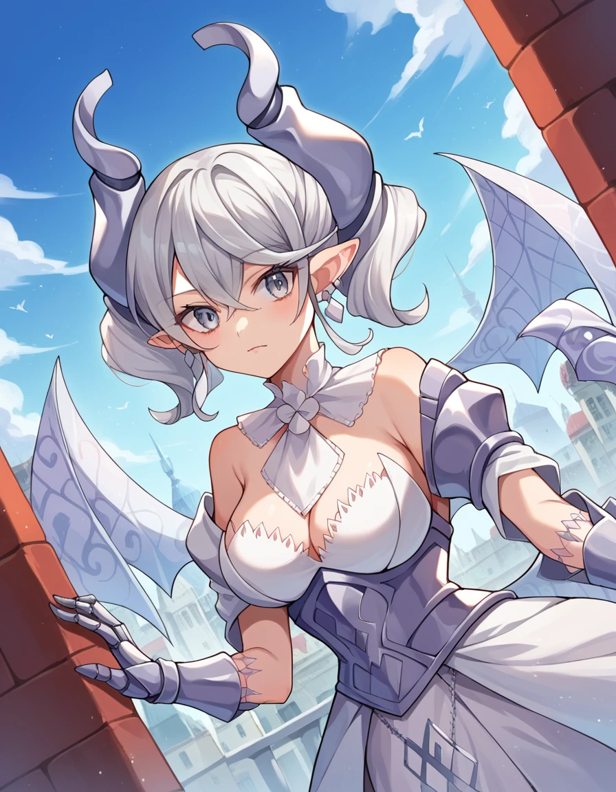 lovely labrynth of the silver castle, demon horns, drill hair, grey eyes, grey hair, hair between eyes, horns, medium hair, pointy ears,