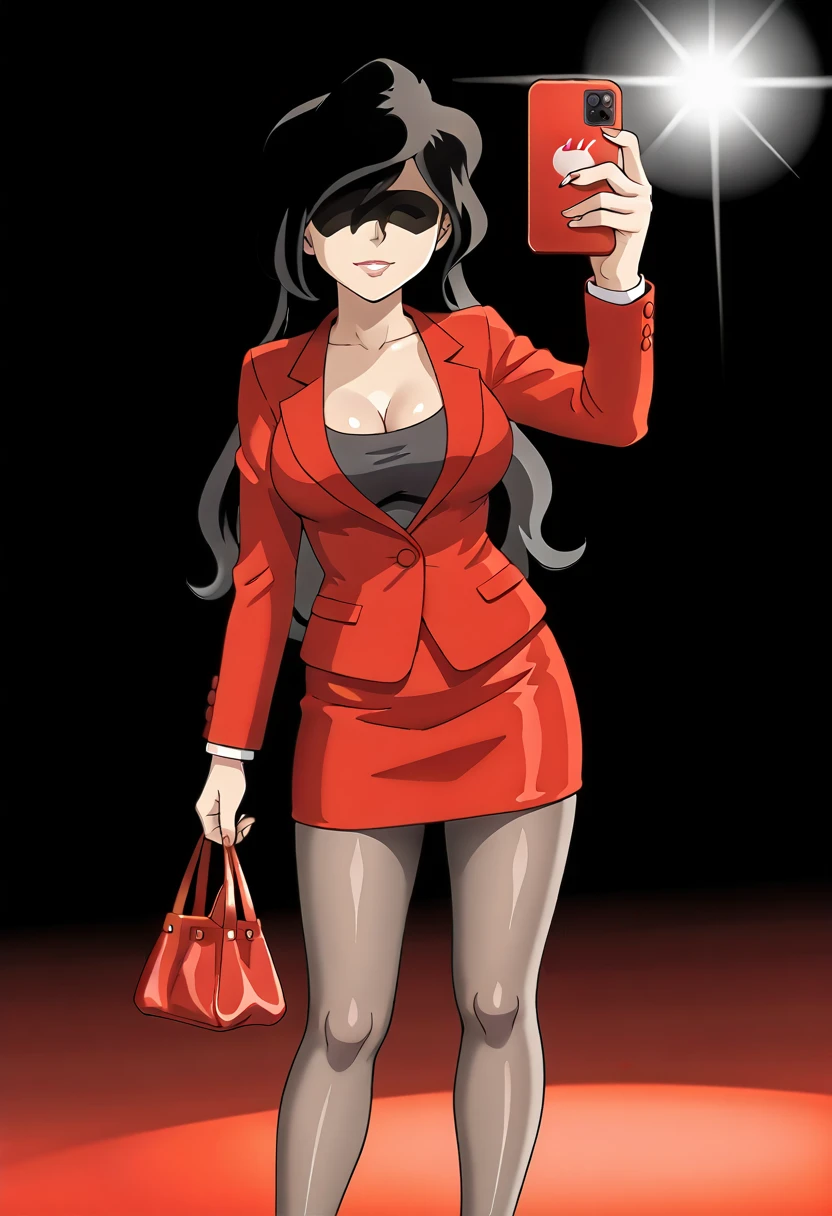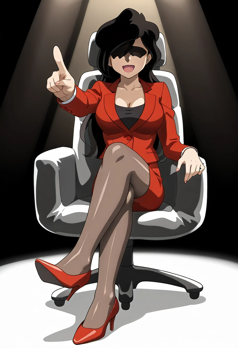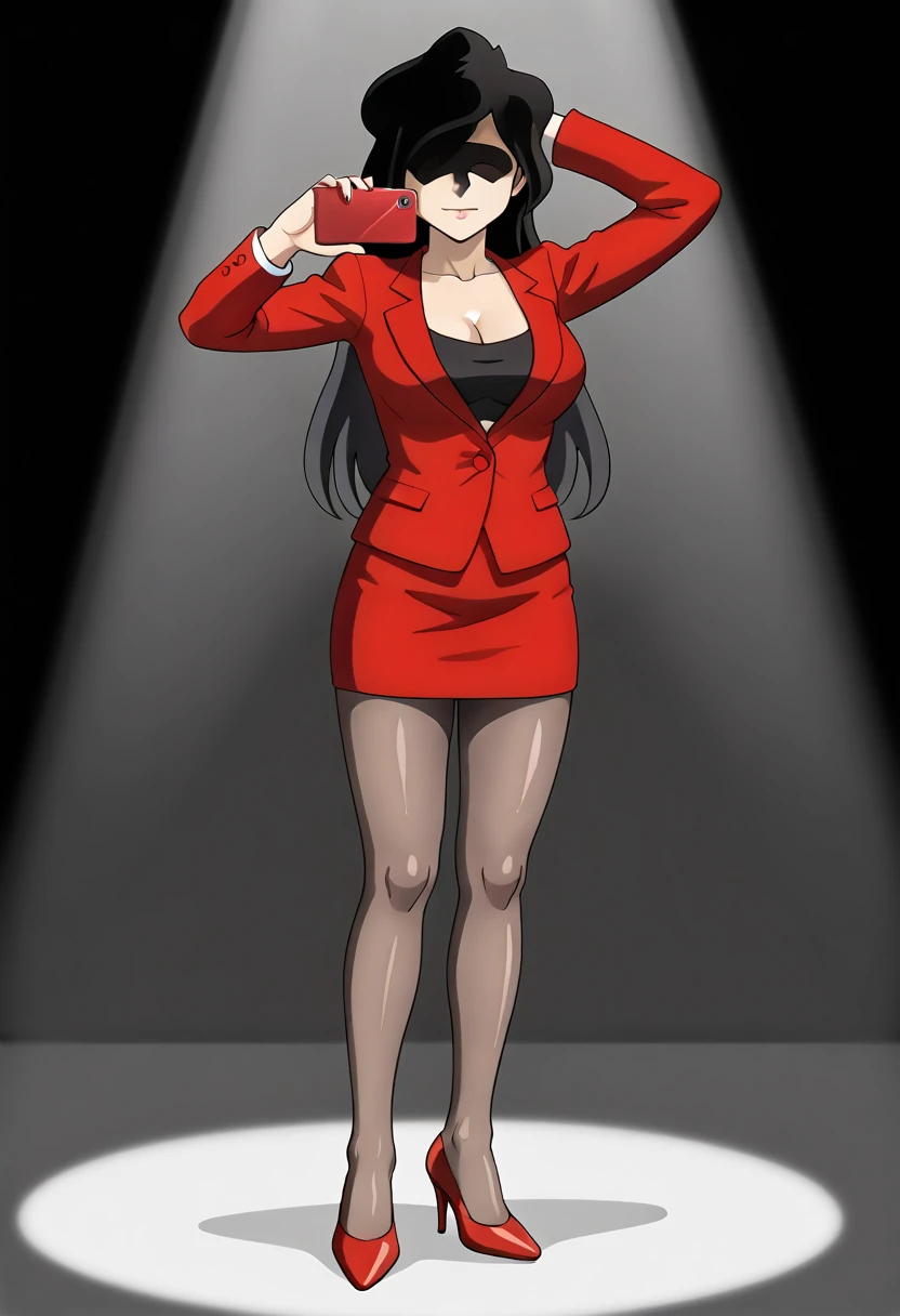 formal, red jacket, black shirt, large breasts, cleavage, red skirt, pencil skirt, miniskirt, black pantyhose, red footwear, high heels