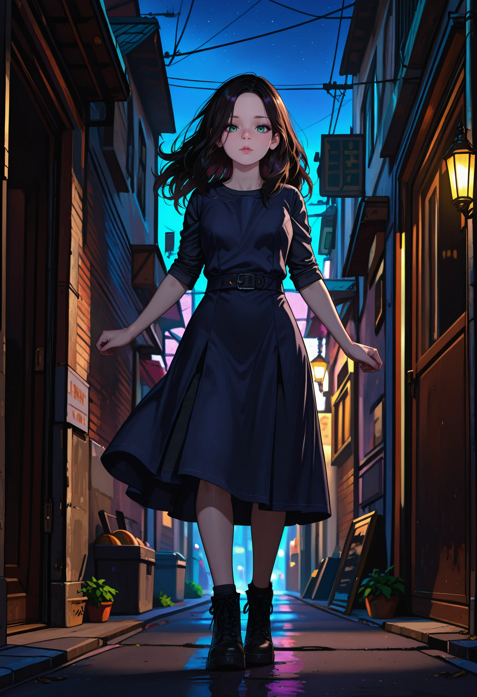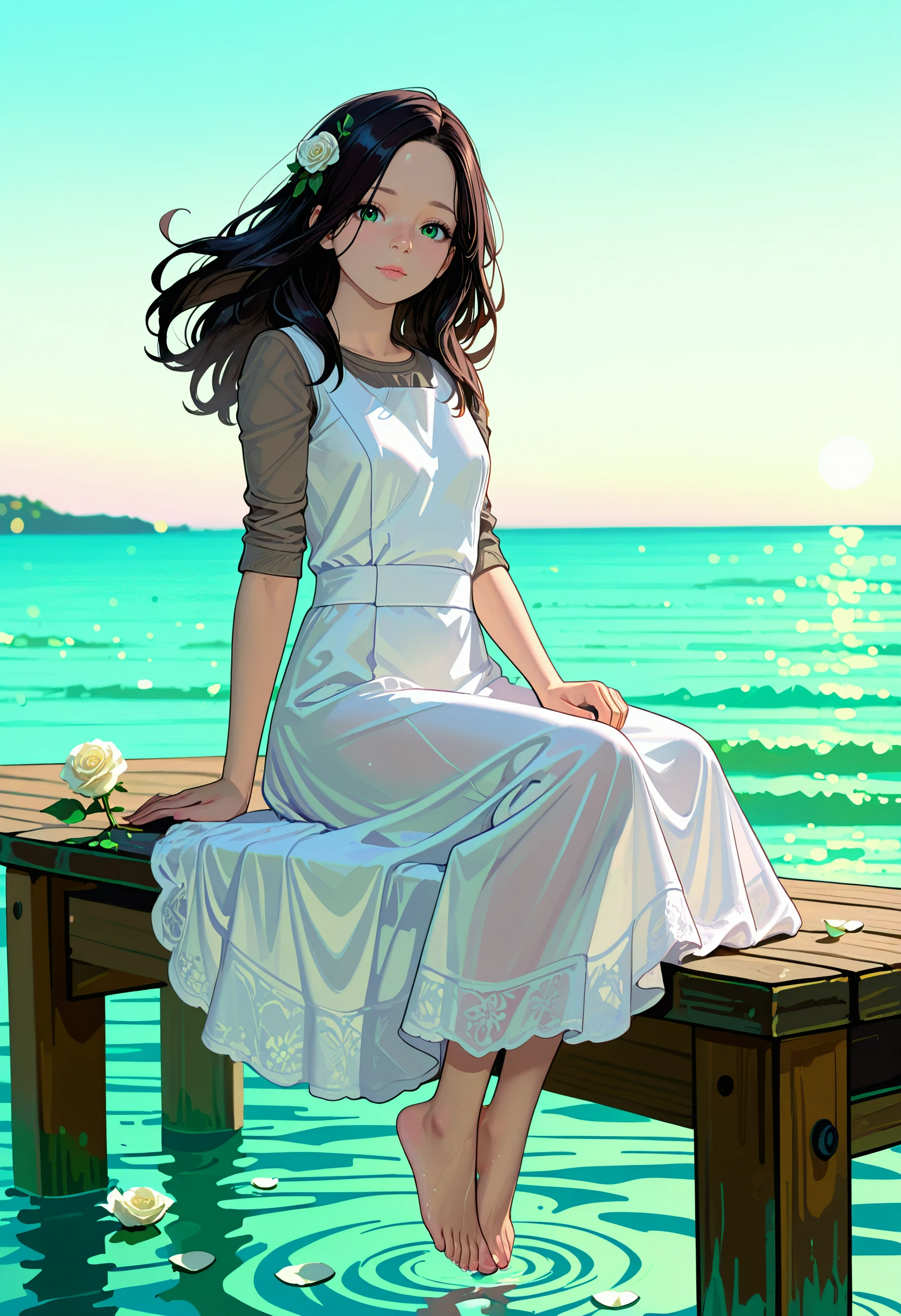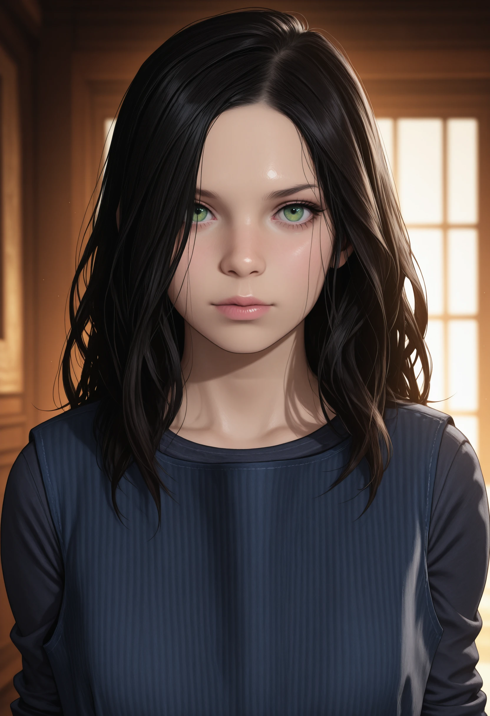 RE7Eveline, 1girl, black hair, long hair, green eyes