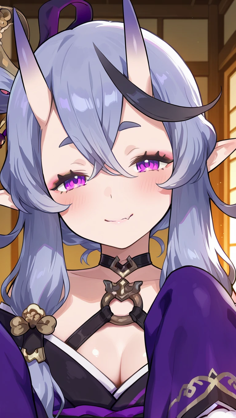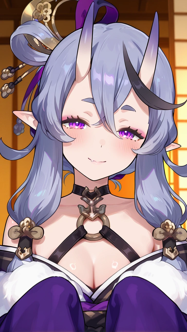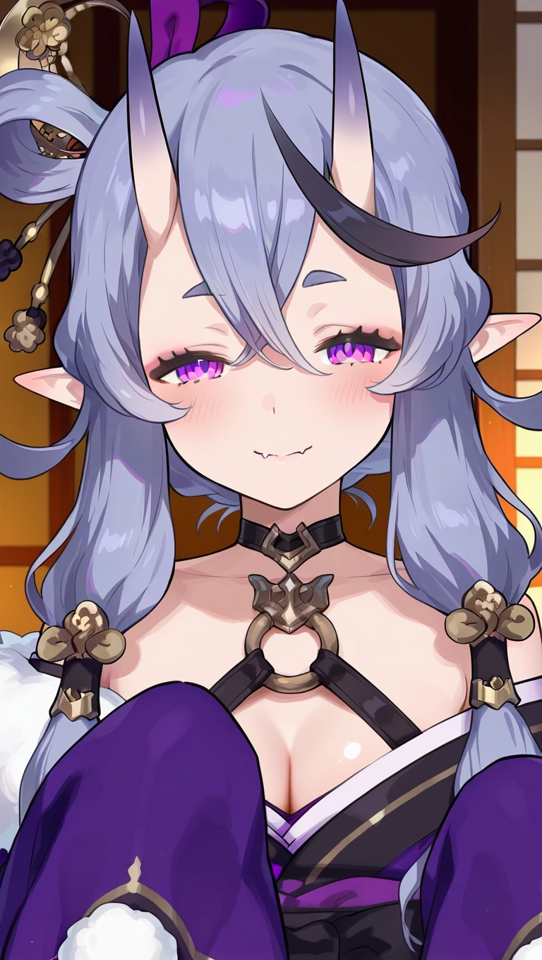 skin-covered horns,long hair,purple hair,streaked hair,pointy ears,crescent hair ornament,short eyebrows,thick eyebrows,hair between eyes,purple eyes