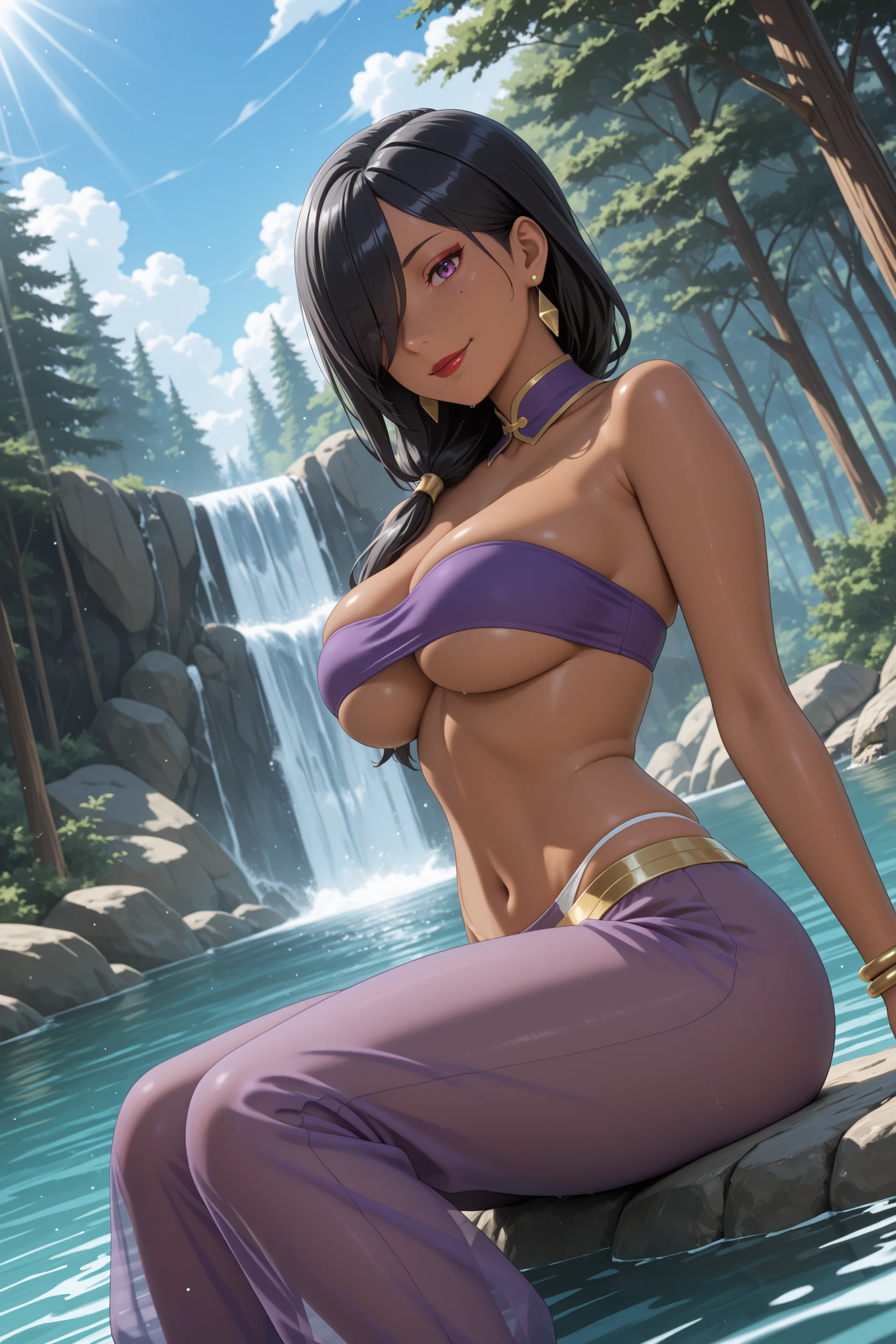 Main Prompt: 1girl, solo, mature female, dark-skinned female, curvy, long hair, black hair, hair over one eye, purple eyes, large breasts, slim waist, makeup, red lipstick,