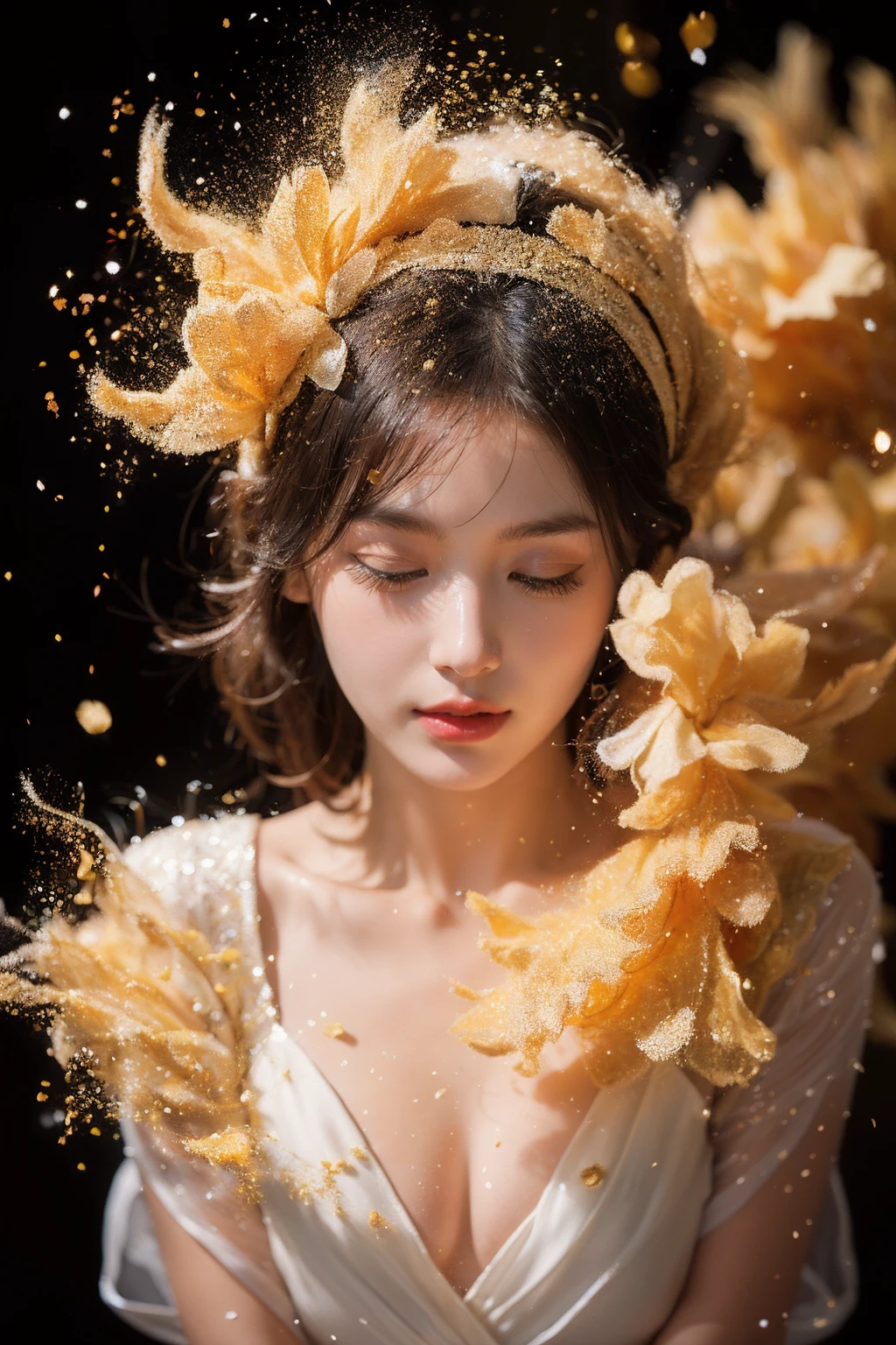 (1girl:1.1),stars in the eyes,(pure girl:1.1),(full body:0.6),There are many scattered luminous petals,contour deepening,white_background,cinematic angle,gold powder,<lora:jin_20231226224140-000003:0.7>,