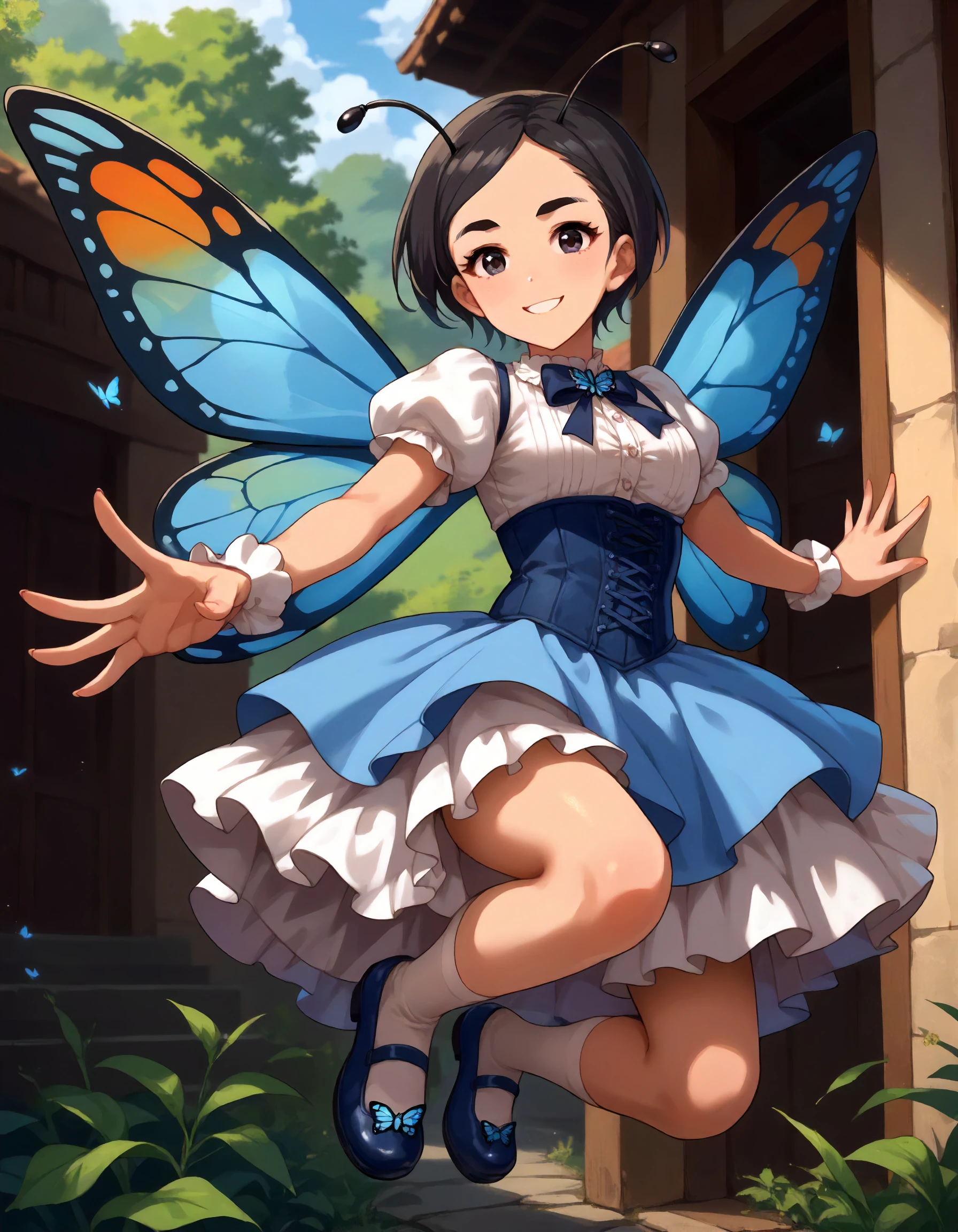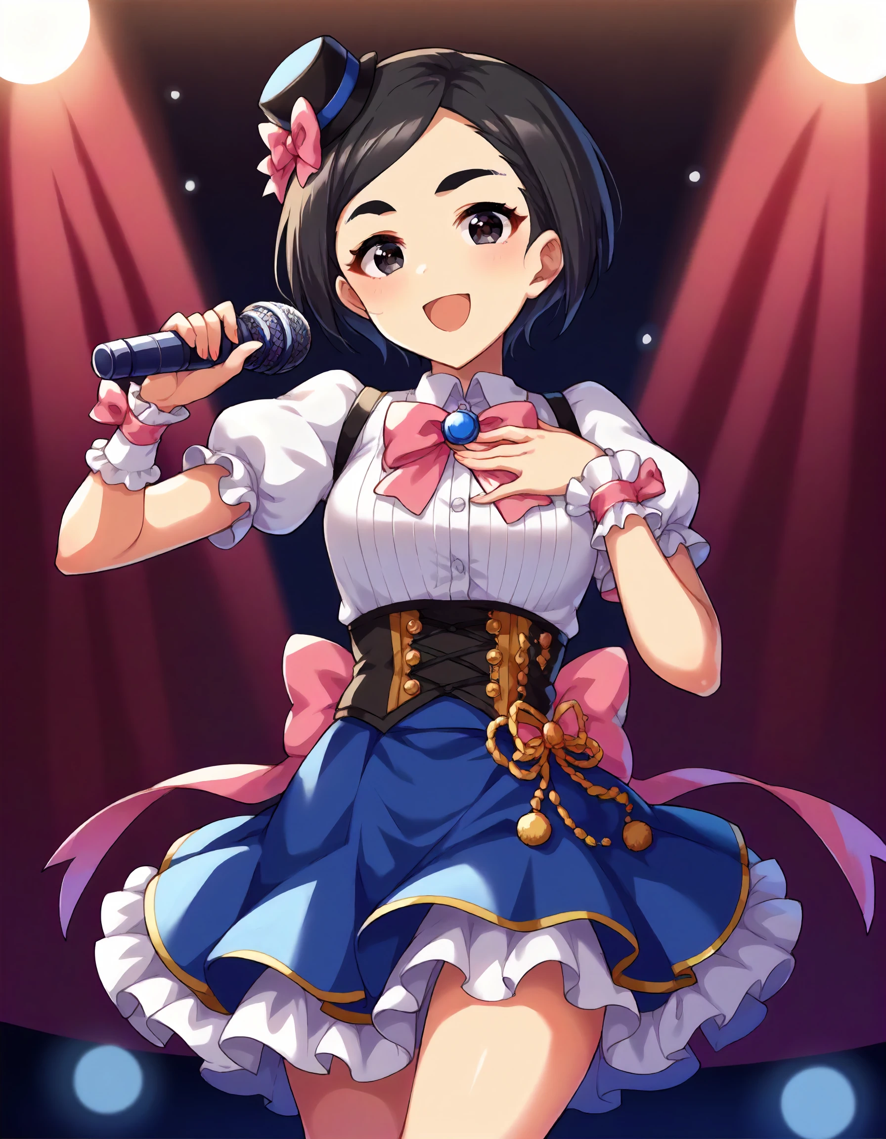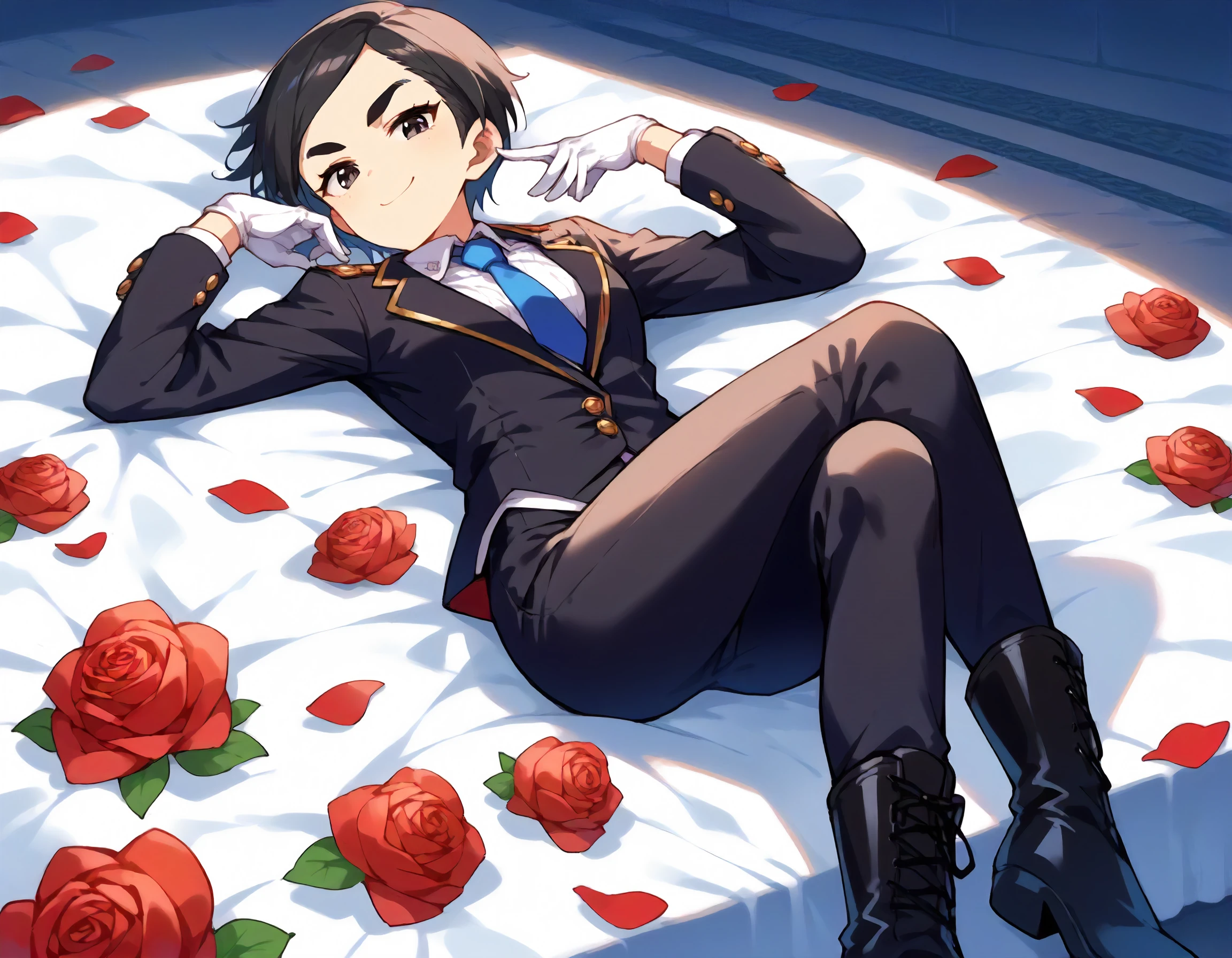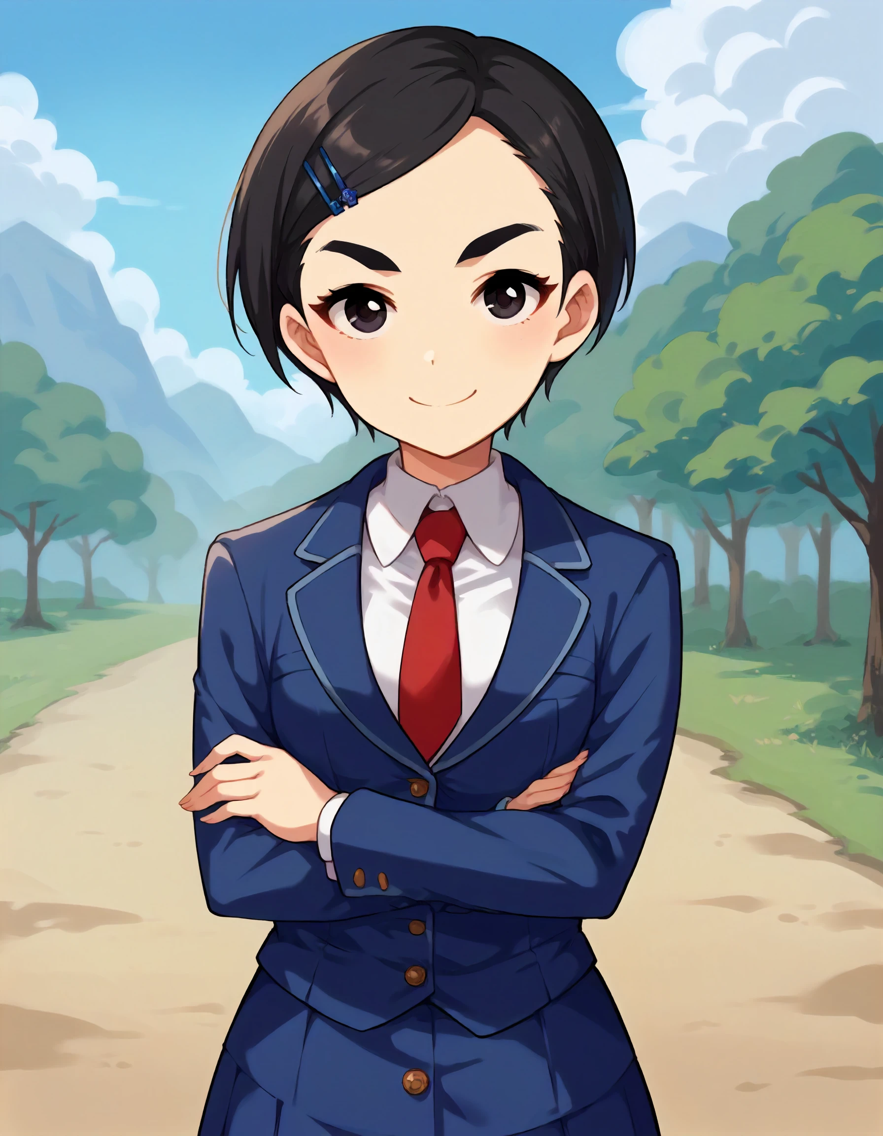 black hair,short hair,parted bangs,thick eyebrows,black eyes