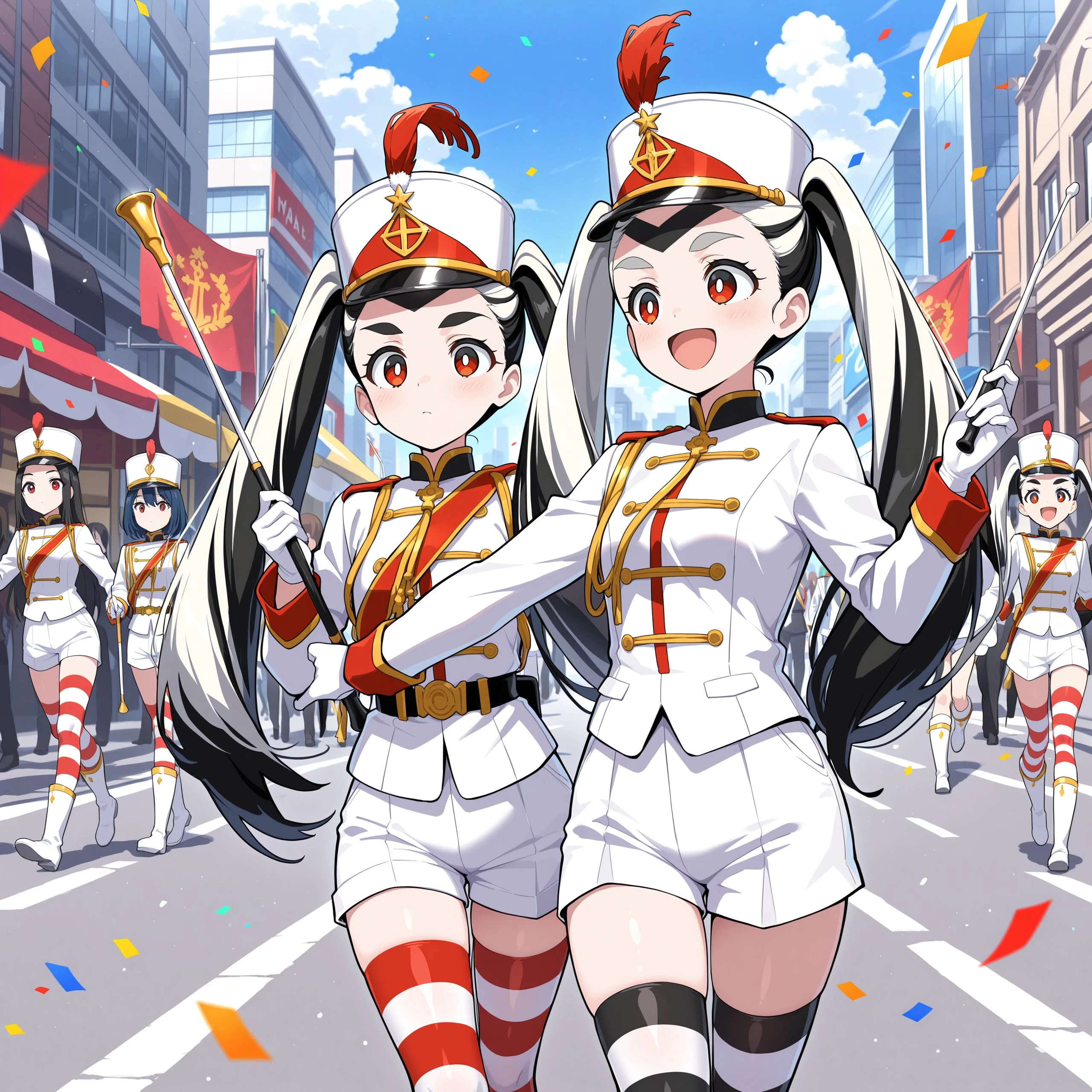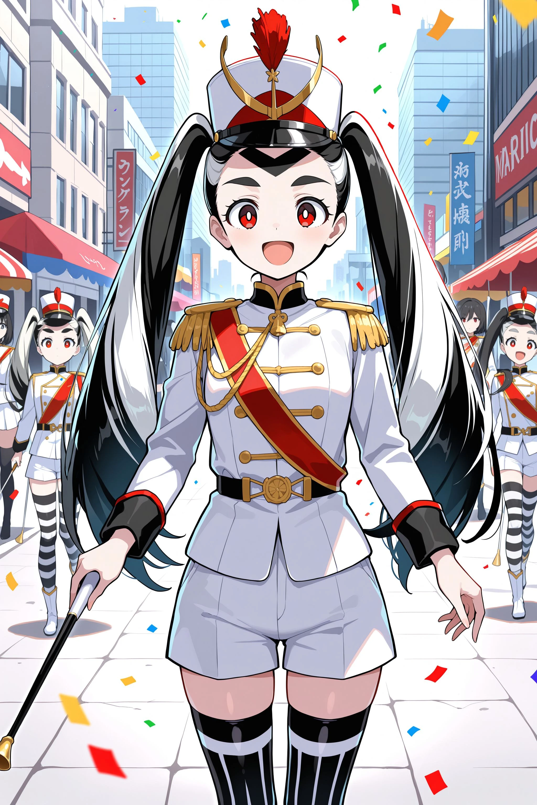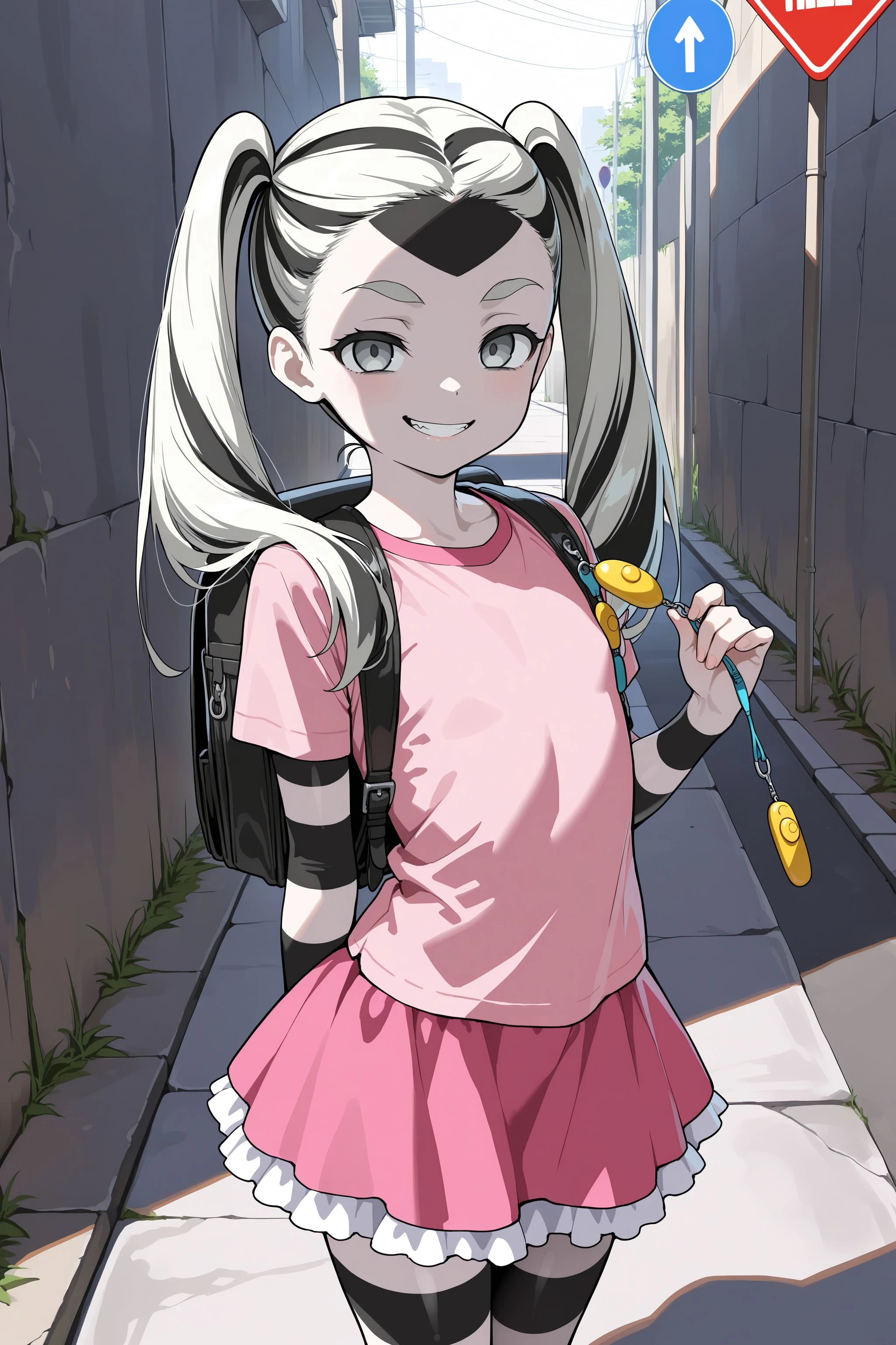 trigger: nymph, pale skin, twintails, forehead, long hair, two-tone hair, bodypaint, striped