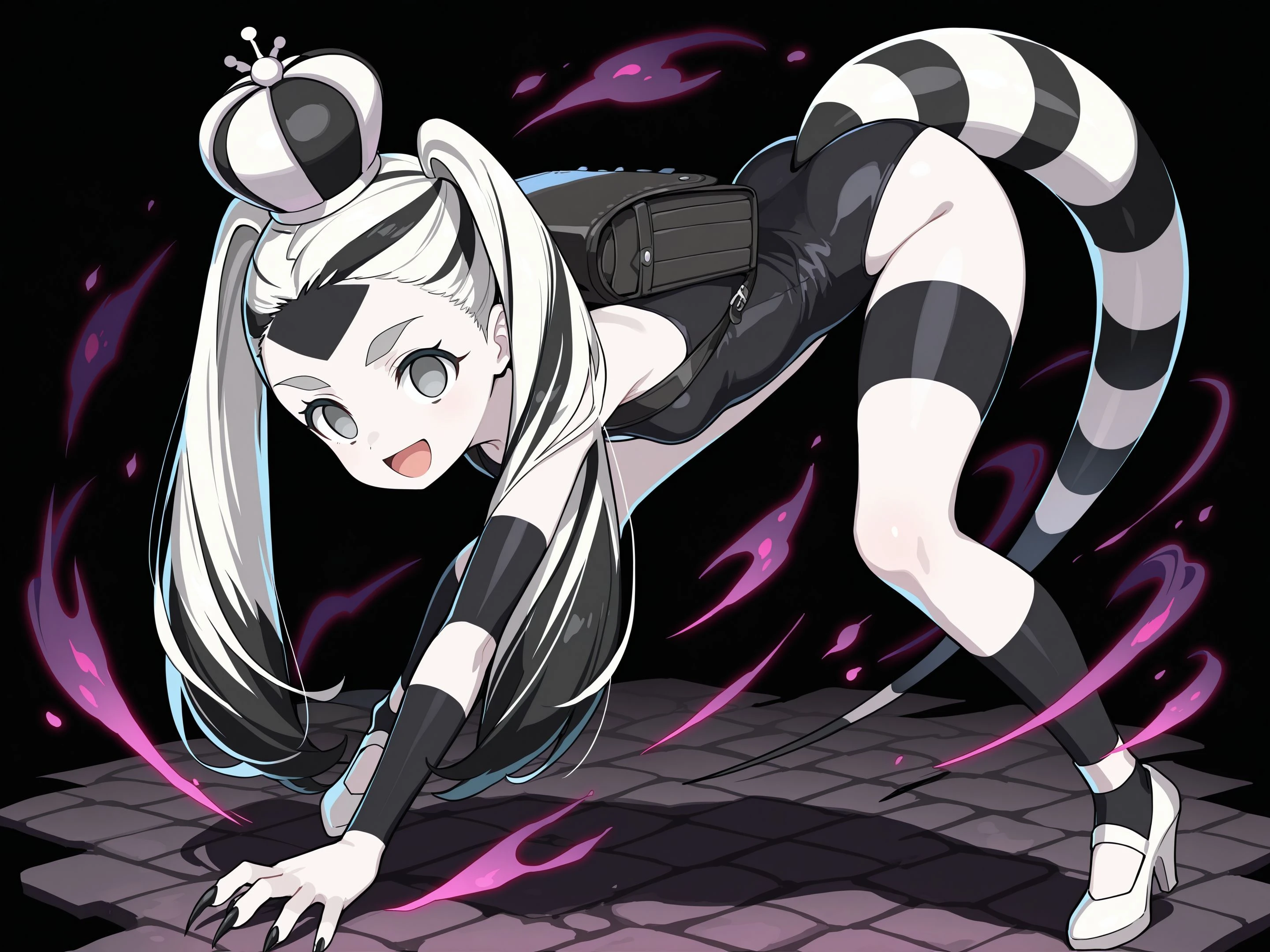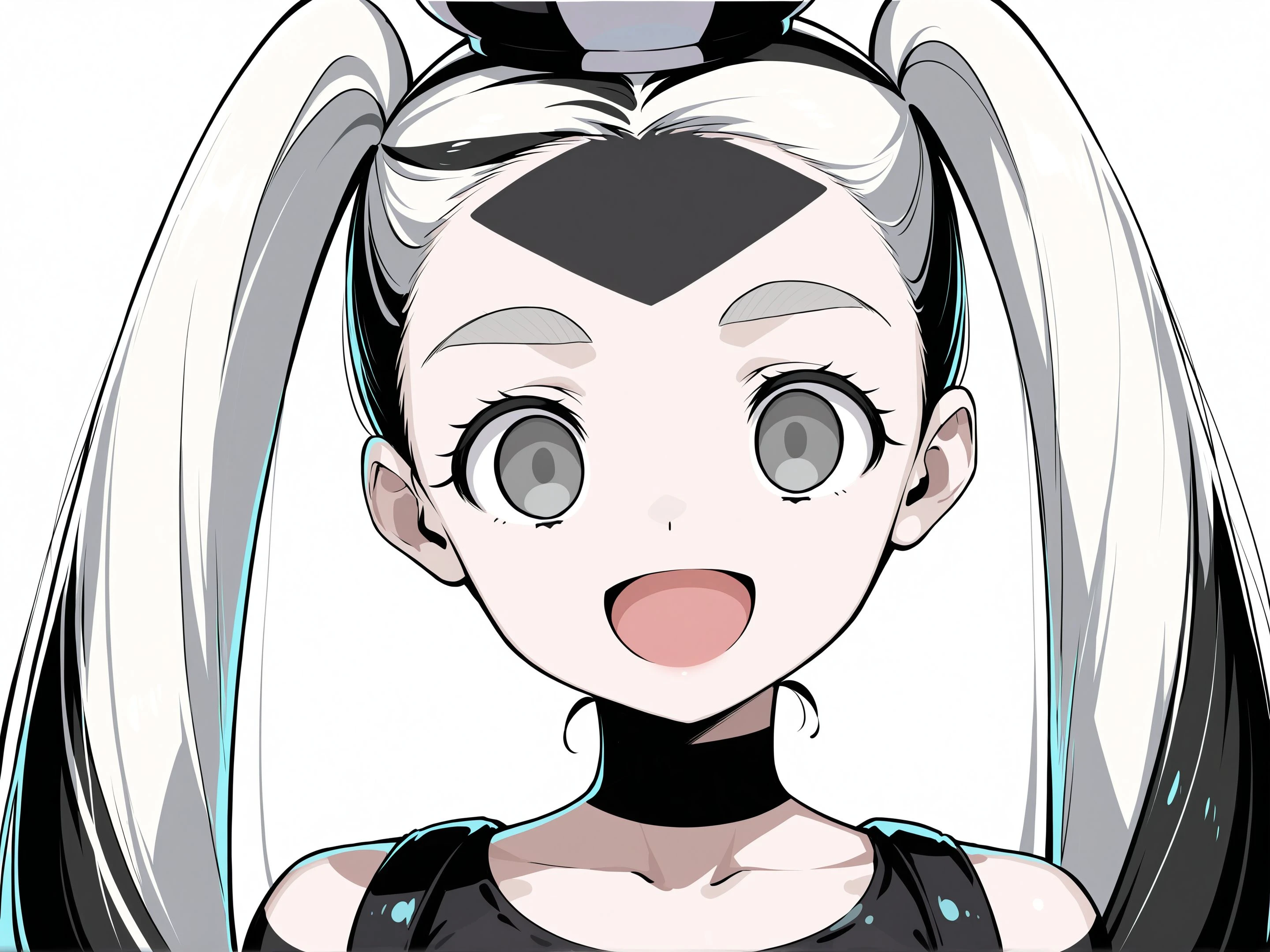 trigger: nymph, (grey skin:1.4), twintails, forehead, long hair, two-tone hair, bodypaint, striped