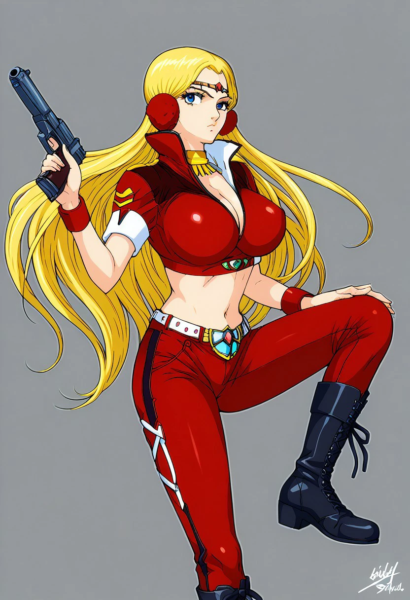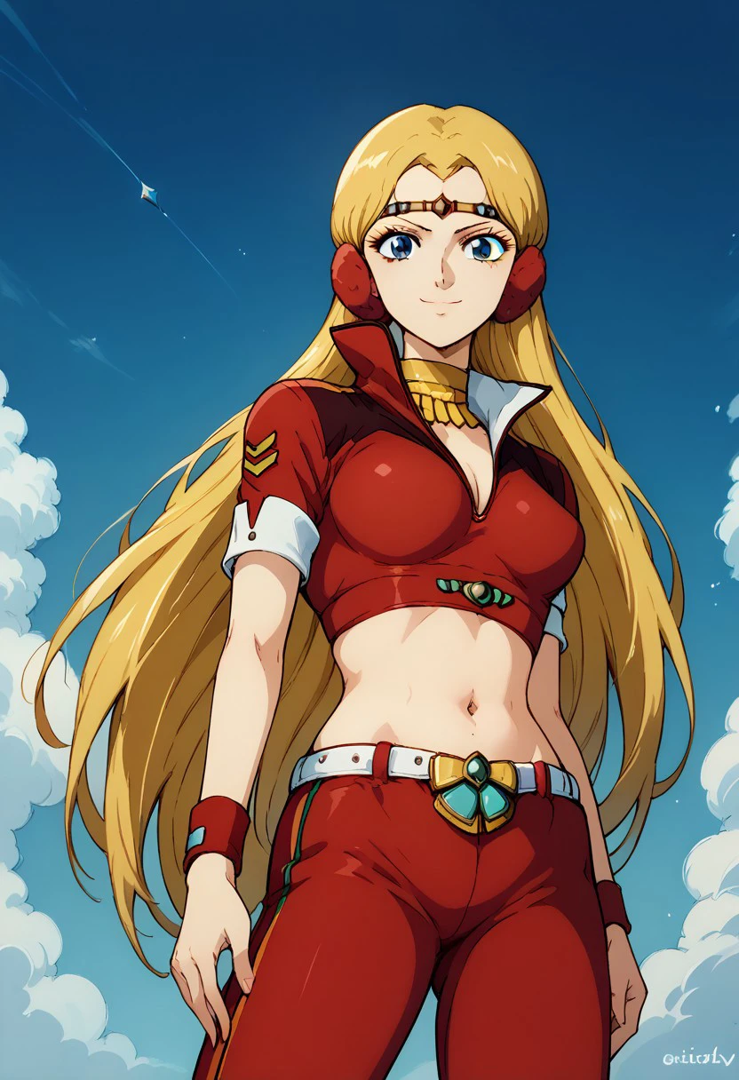 Prompt: birdy shaw, ginga shippu sasuraiga, 1girl, solo, midriff, blonde hair, blue eyes, long hair, navel, crop top, pants, red pants, breasts, smile, wristband, belt, jewelry
