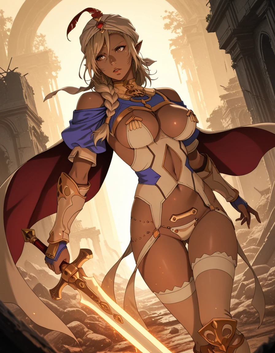 long hair, brown eyes, dark-skinned female, blonde hair, pointy ears, braid,
