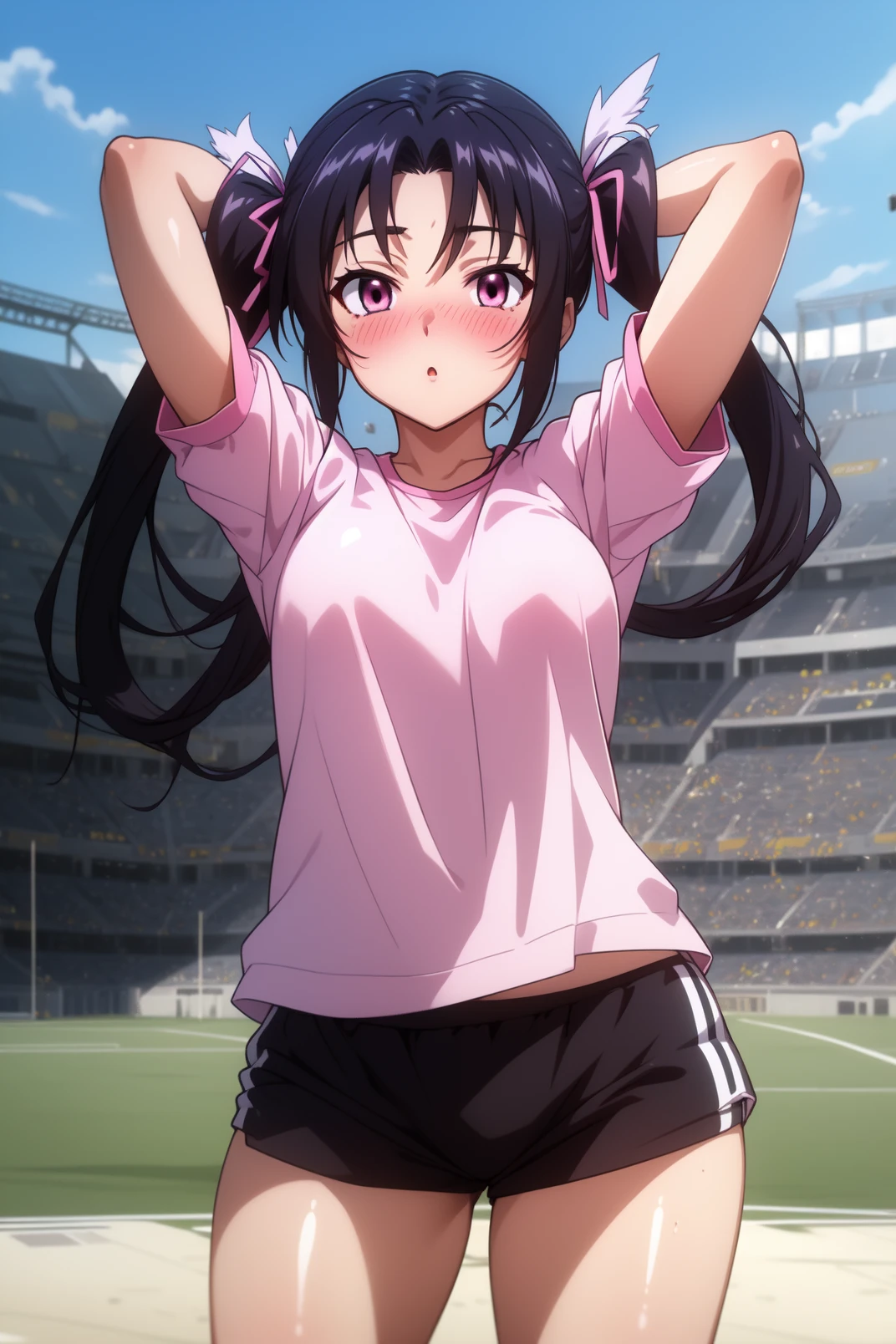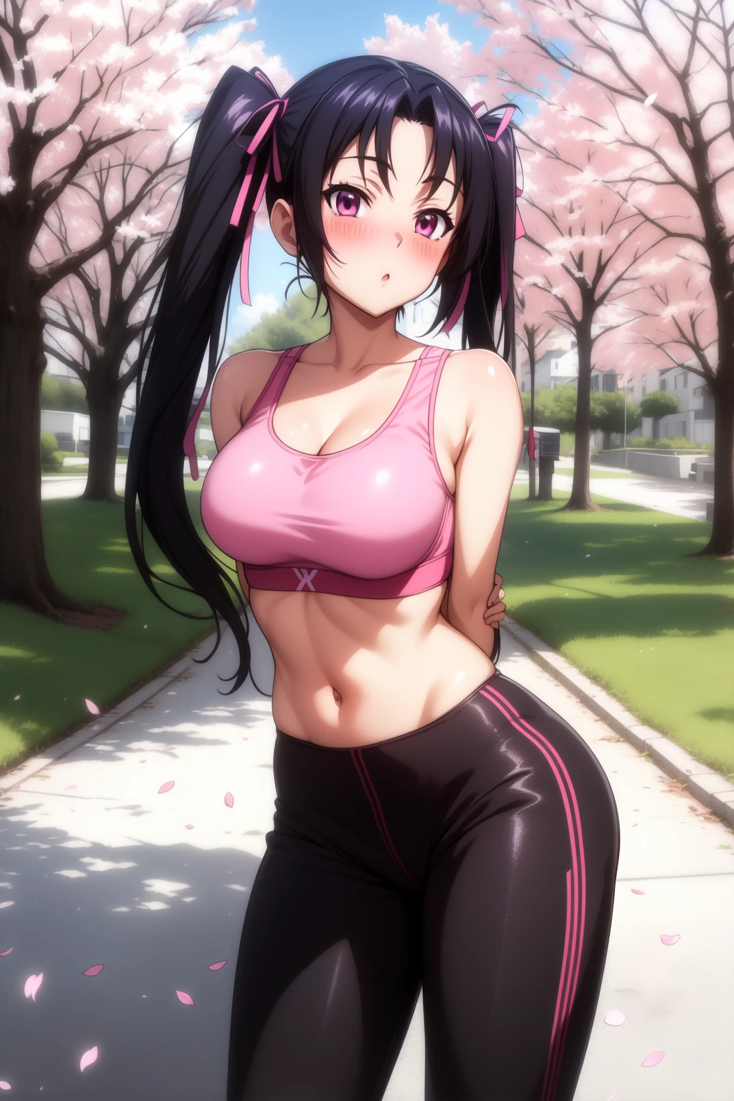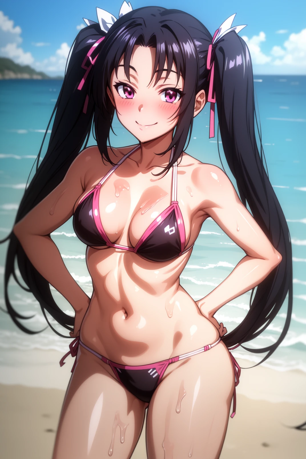 serafall, pink eyes, black hair, long hair, parted bangs, twintails, hair ribbon, pink ribbon