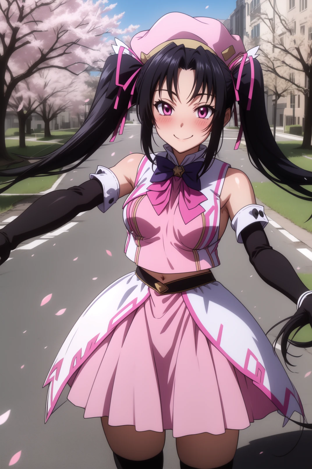 outfit: pink hat, black gloves, fingerless gloves, bare shoulders, black detached sleeves, pink crop top, pink bowtie, pink skirt, dress, striped thighhighs, black shoes