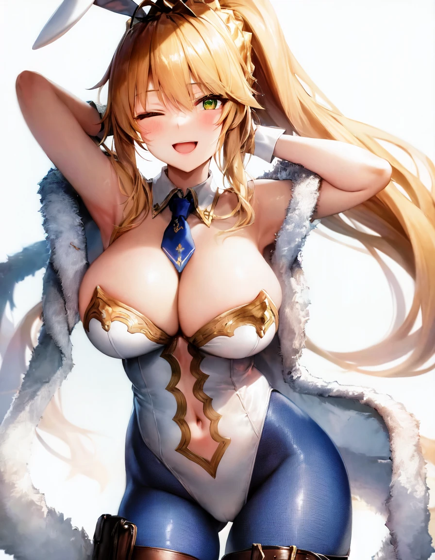 artoria pendragon \(swimsuit ruler\) \(fate\), ahoge, blonde hair, green eyes, french braid, pony tail, bare shoulders, large breasts, cleavage, clothing cut out, wrist cuffs, detached collar, navel cutout, white leotard, blue necktie, blue pantyhose
