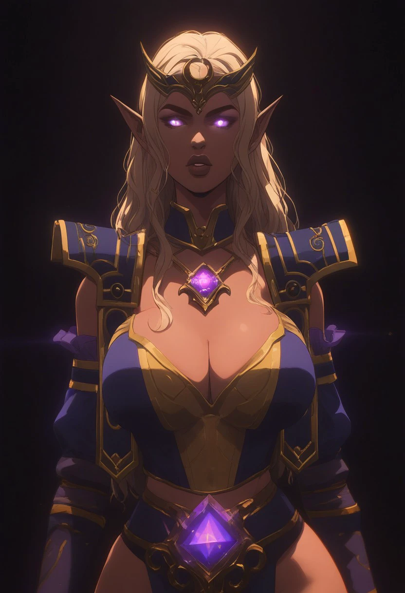 liloreth, blonde hair, elegant, purple eyes, purple and gold dress, detached sleeves, cleavage, belt with glowing gemstone, golden details, blood elf, tiara, priest mantle,