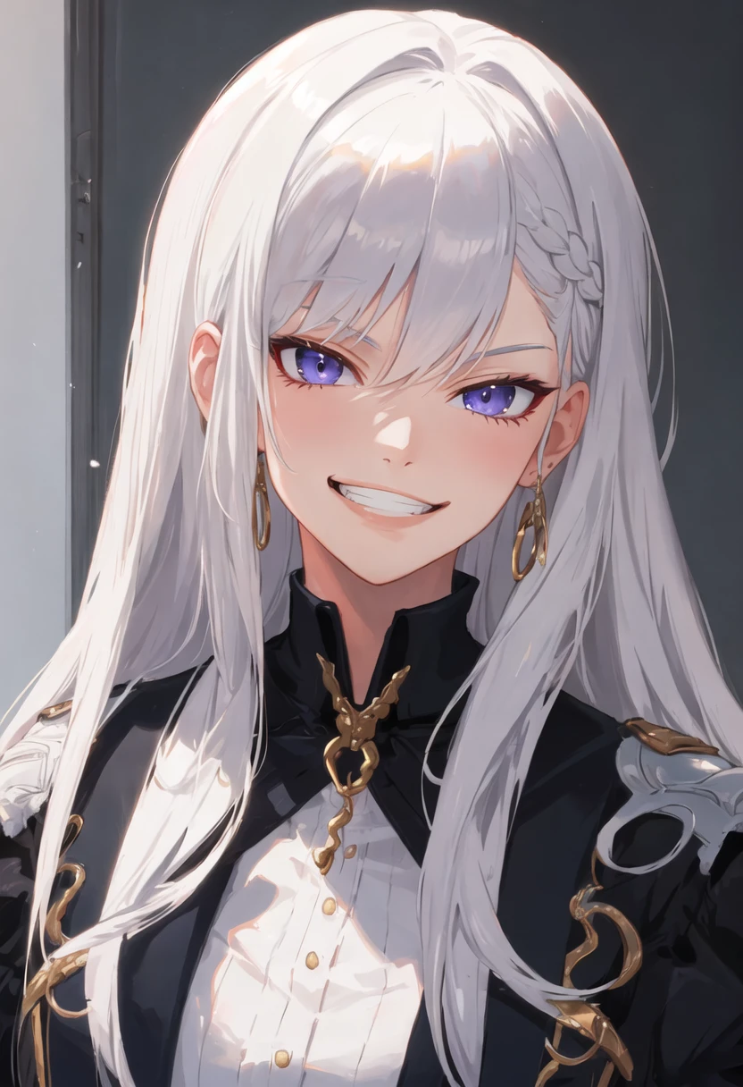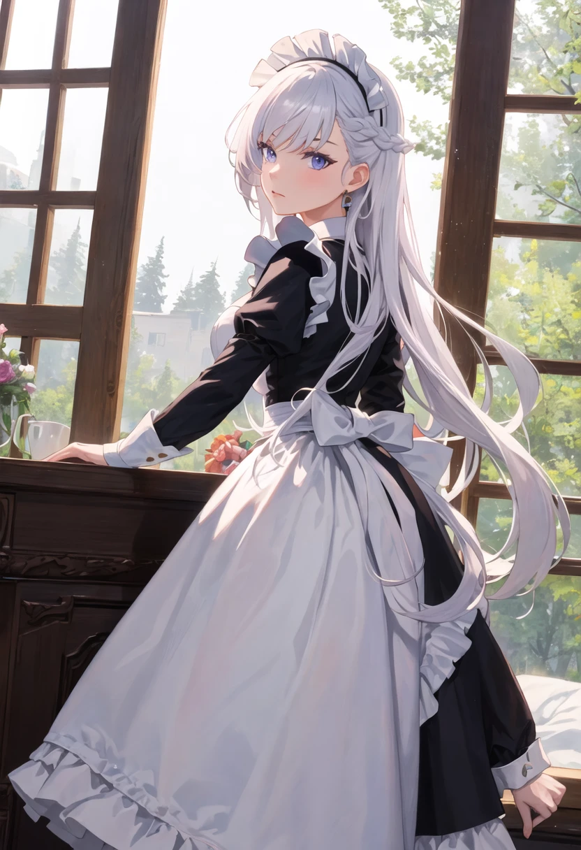 - The pruned character tags are long_hair, breasts, white_hair, large_breasts, bangs, braid, purple_eyes, french_braid, blue_eyes, maid_headdress, earrings. You can add them into prompts when core features (e.g. hair color) of character is not so stable.
