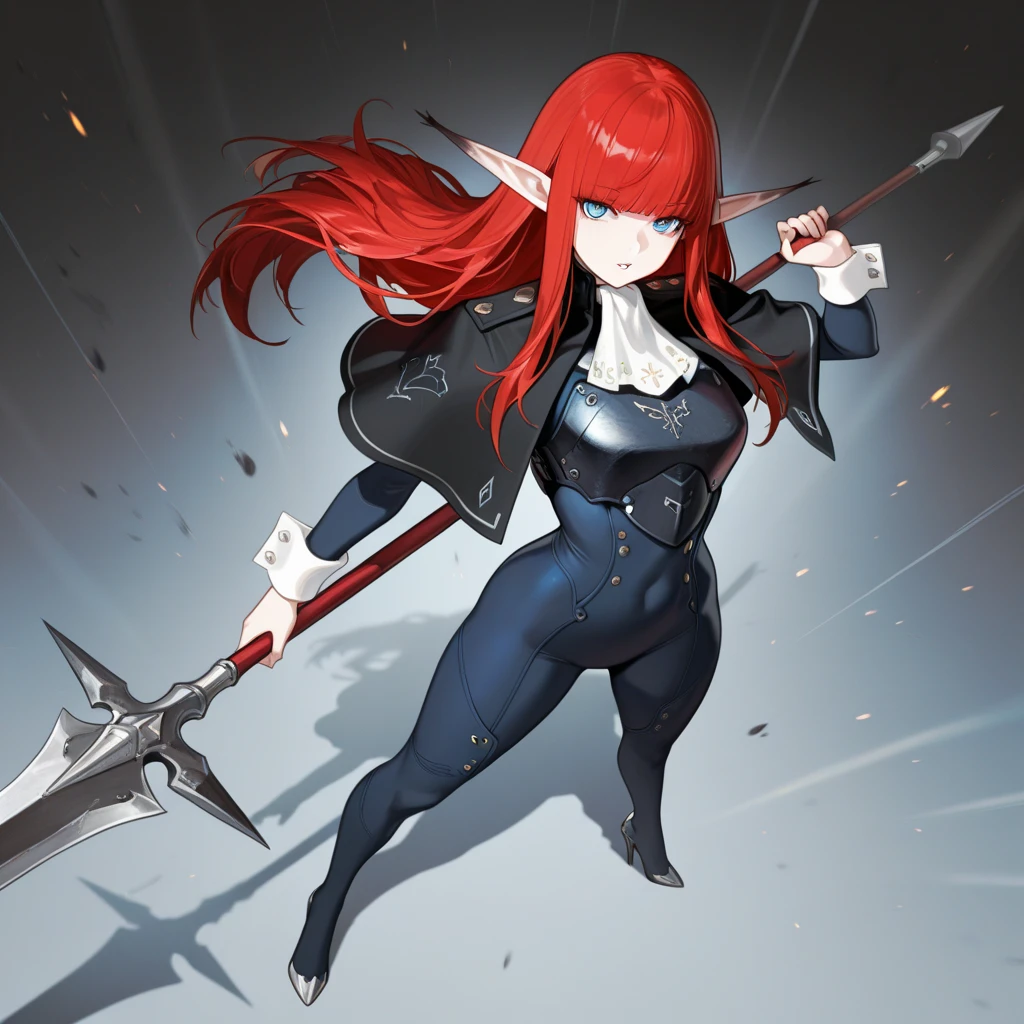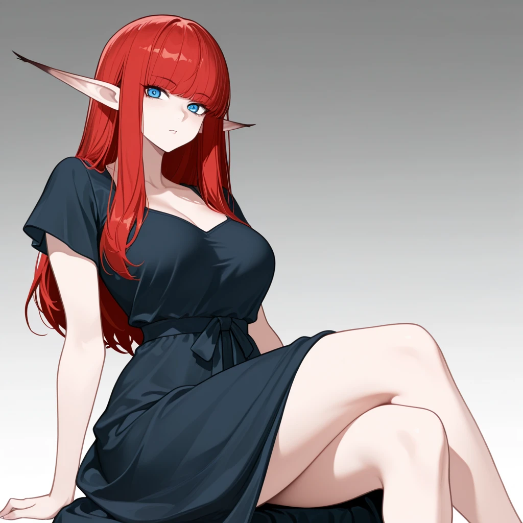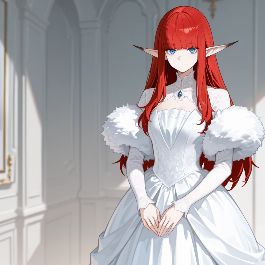 pointy ears, long ears, red hair, long hair, bangs, blue eyes