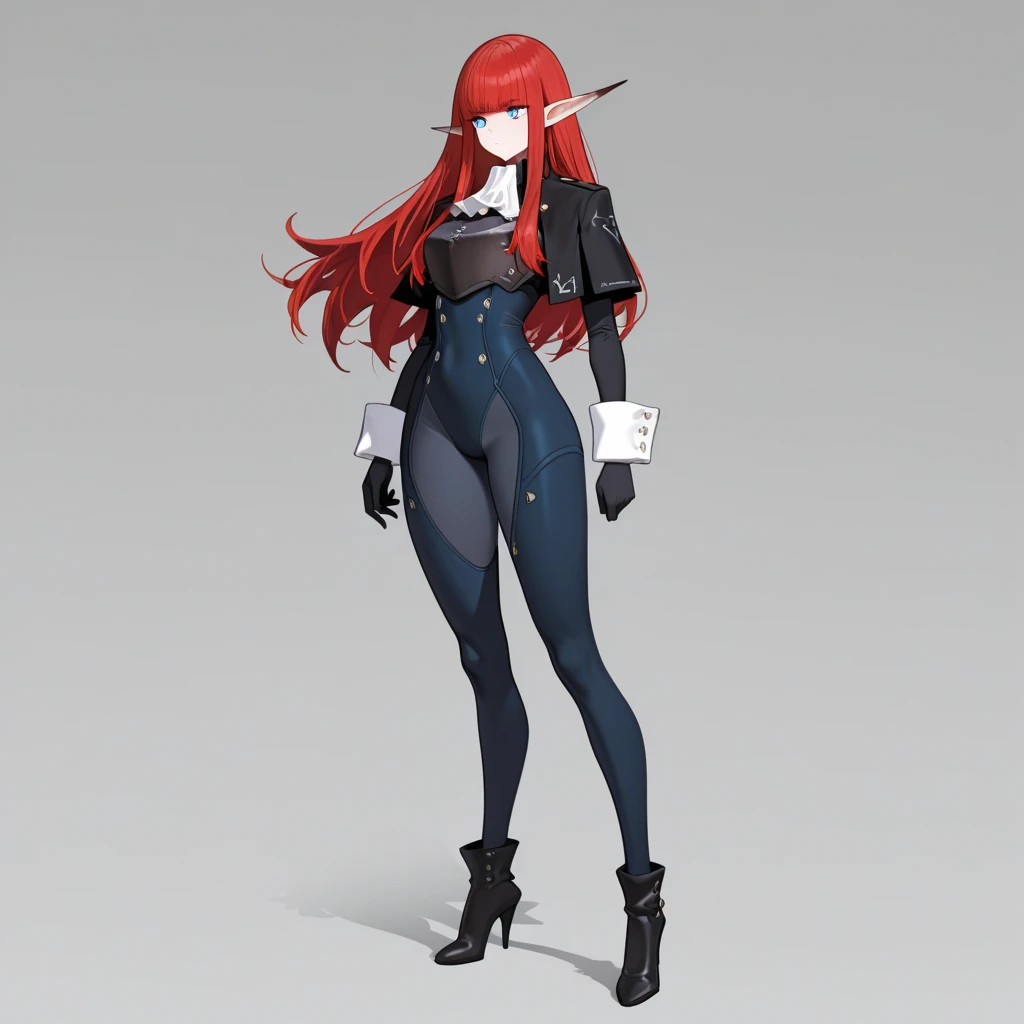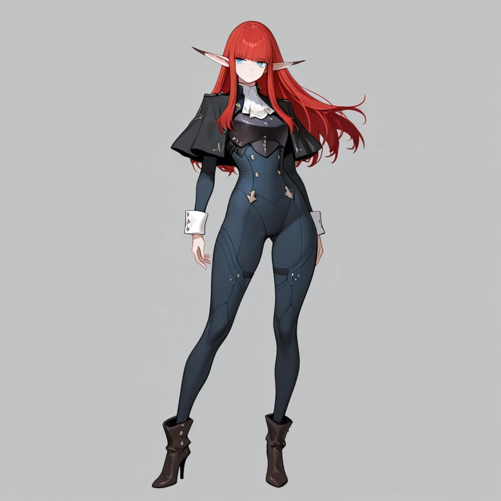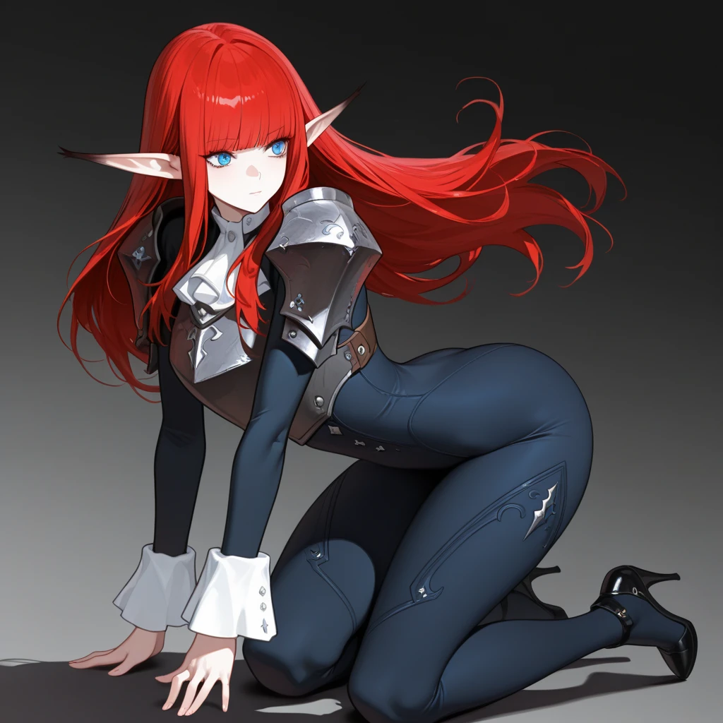 pointy ears, long ears, red hair, long hair, bangs, blue eyes