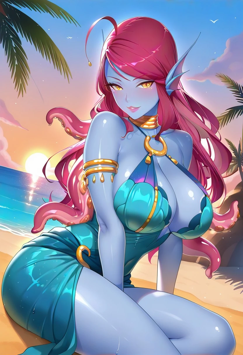 Pearl_BC, blue skin, red hair, ahoge, tentacle hair, long hair, yellow eyes, head fins, lips, large breasts, webbed hands