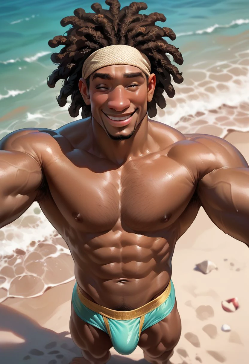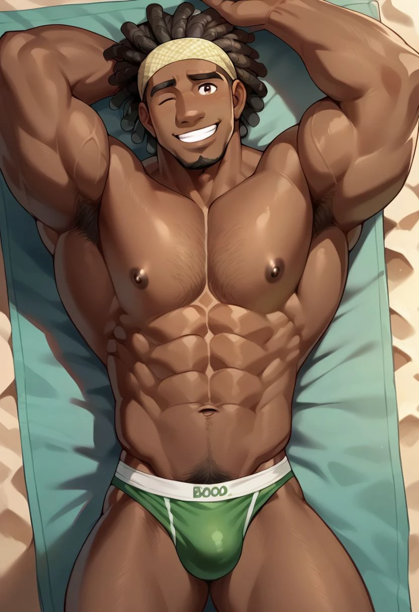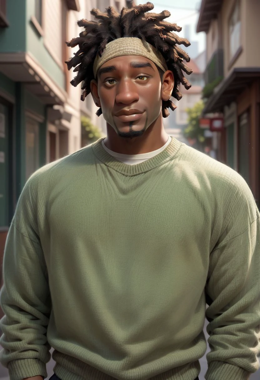 dark skin, dreadlocks, headband, goatee