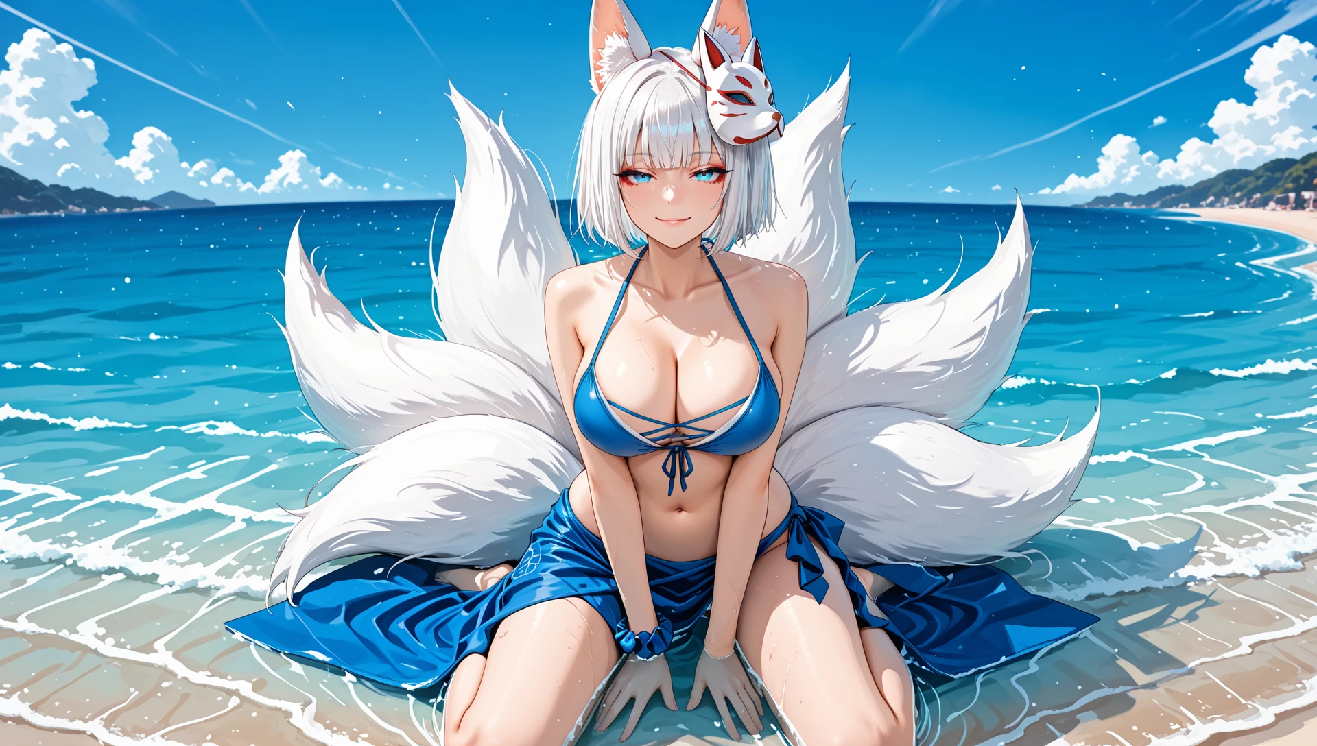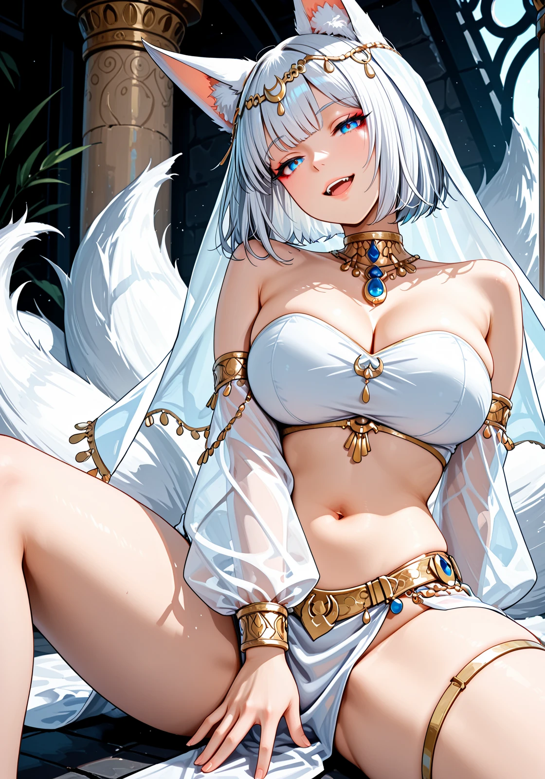 k4g4, blue eyes, white hair, short hair, bangs, kitsune, kyuubi, fox ears, fox tails, multiple fox tails, animal ear fluff, makeup, large breasts,