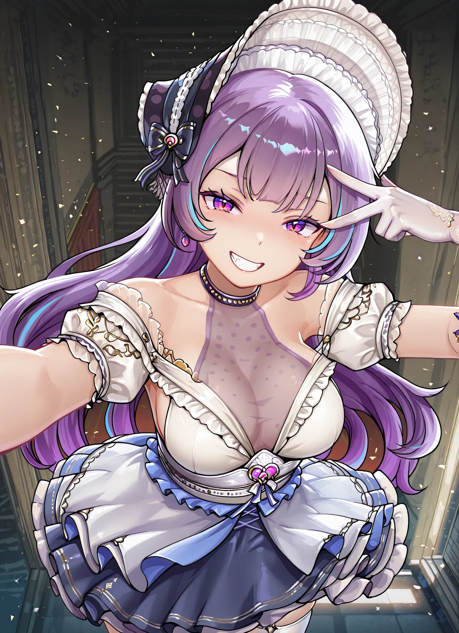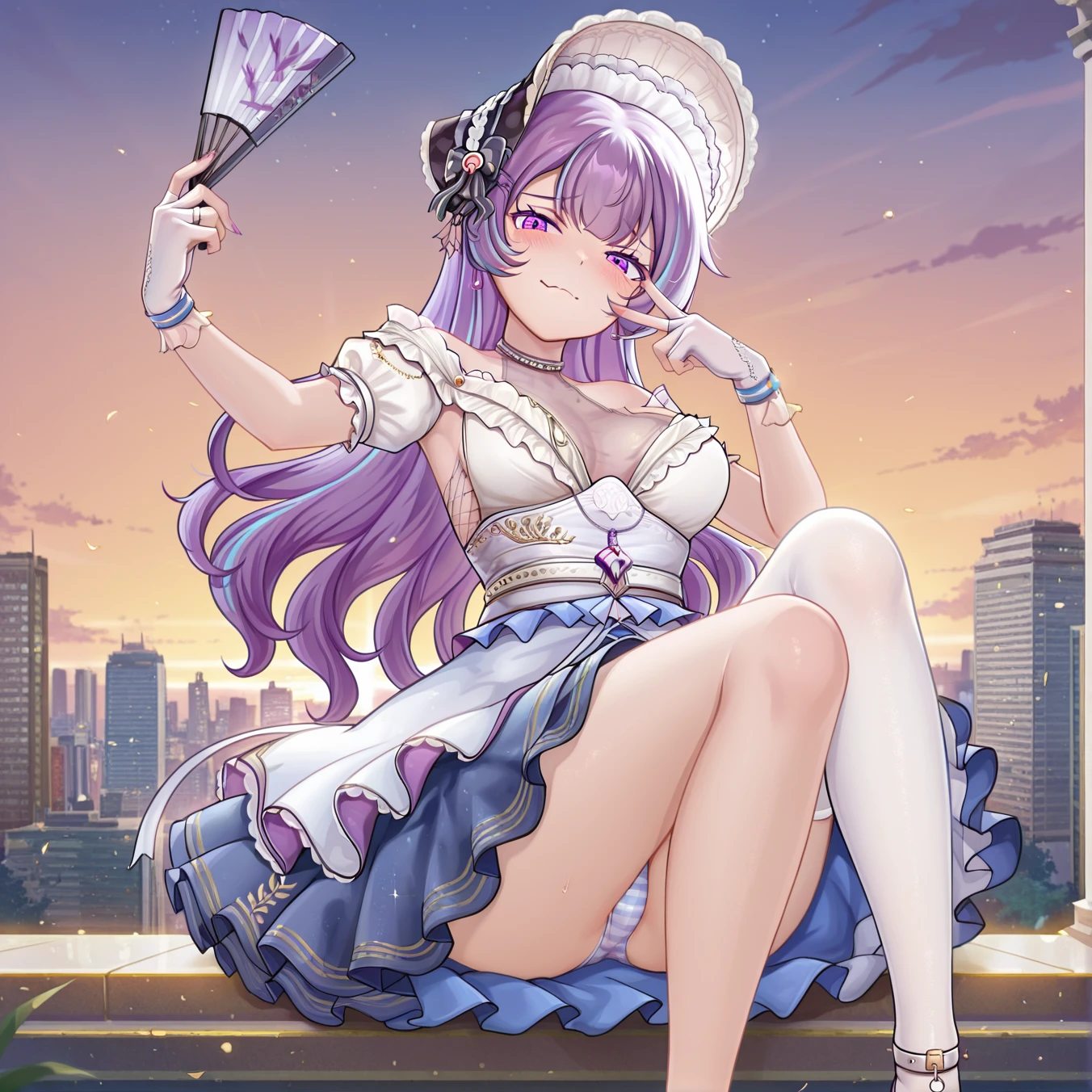 maid bonnet, black polka-dot bow, heart brooch, off-shoulder white bodice, sheer mesh chest panel, bare shoulders, white lace-cuff gloves, right white thighhigh, asymmetrical legwear, blue layered skirt with frills, mary jane heels with ankle strap and charm, choker, holding folding fan, gold vine embroidery, amethyst pendant necklace