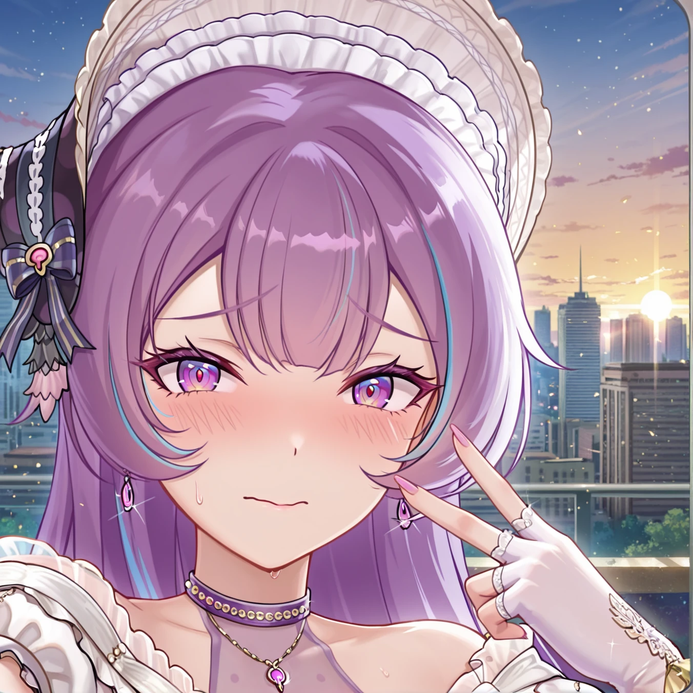 purple long hair, cyan streaks, violet eyes, elegant expression, soft smile