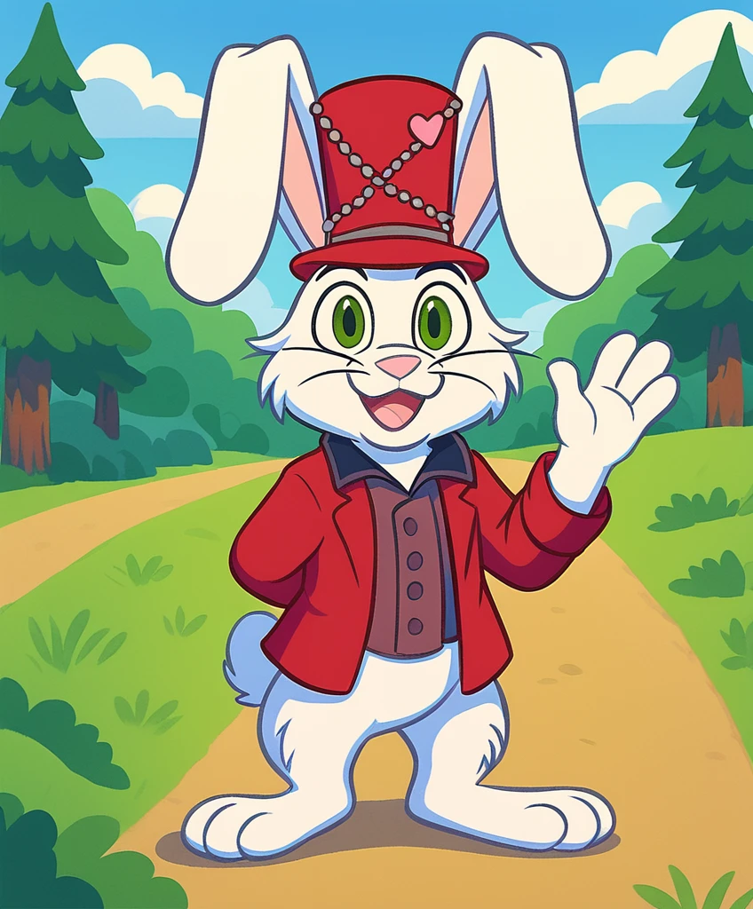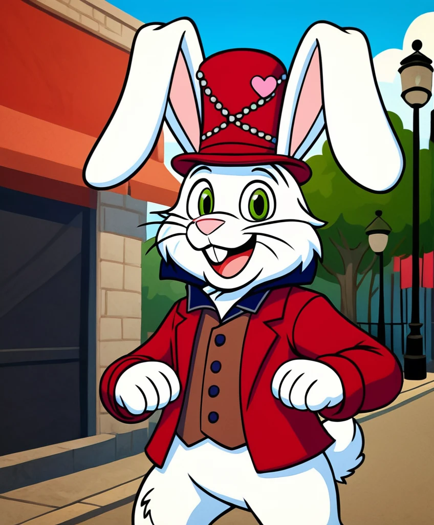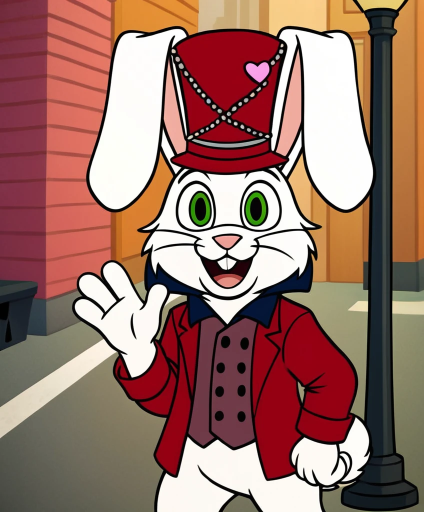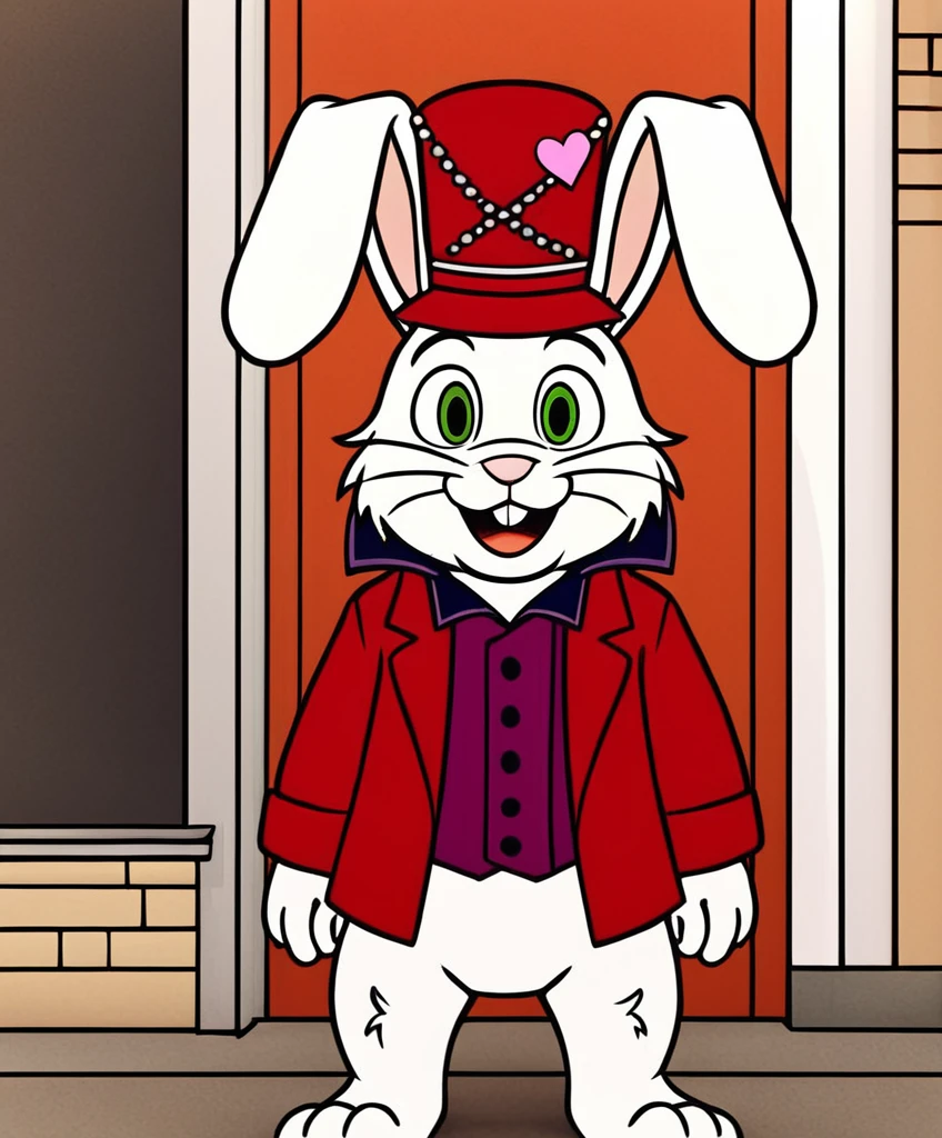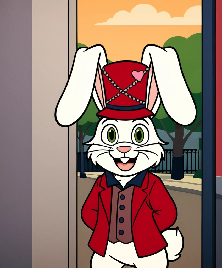 Felix_the_Bunny, shirt, long sleeves, hat, animal ears, green eyes, jacket, heart, open clothes, teeth, collared shirt, rabbit ears, vest, open jacket, black shirt,upper teeth only, buttons,bottomless, rabbit tail, furry, red headwear,red jacket, rabbit, arms down, furry male, red vest, body fur,white fur, animal nose, brown vest, buck teeth, rabbit boy, top hat, shako cap