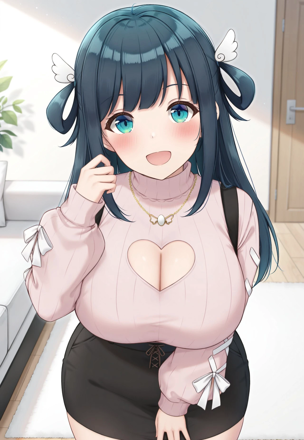 Default outfit : nene amano, wing hair ornaments, blue hair, bangs, long hair, hair rings, blue eyes, 1st costume, default costume, virtual youtuber, clothing cutout, skirt, huge breasts, thick thighs, wide hips, sweater, cleavage, heart cutout, cleavage cutout, black skirt, suspender skirt, pink sweater, long sleeves, suspenders,