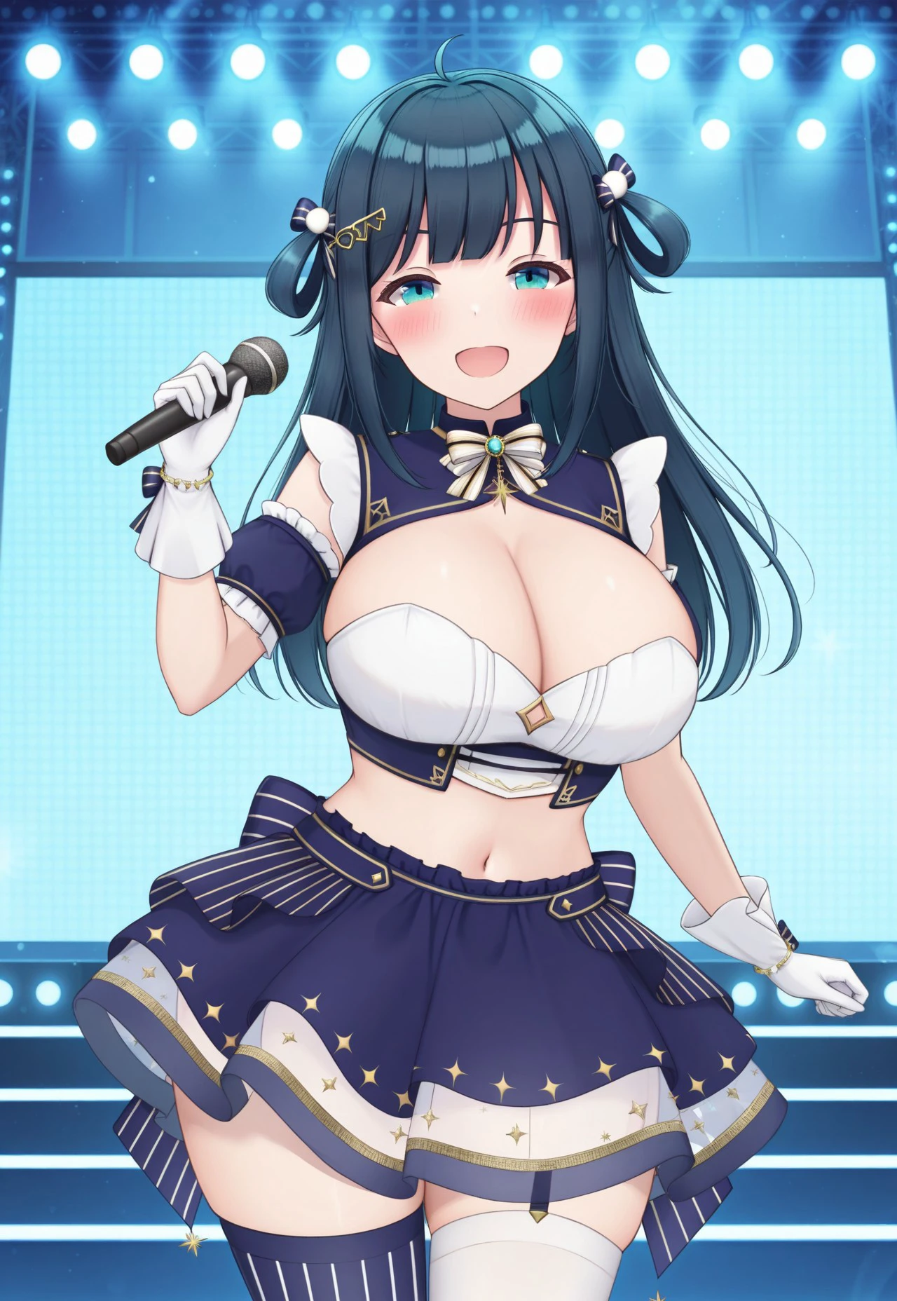 Idol outfit : nene amano, blue hair, bangs, long hair, blue eyes, virtual youtuber, huge breasts, thick thighs, wide hips, idol outfit, 4th costume, gloves, thighhighs, cleavage, white gloves, navel, skirt, ahoge, asymmetrical legwear, hair ornament, straight-on, bow, bangs, hair rings, midriff, striped, cleavage cutout