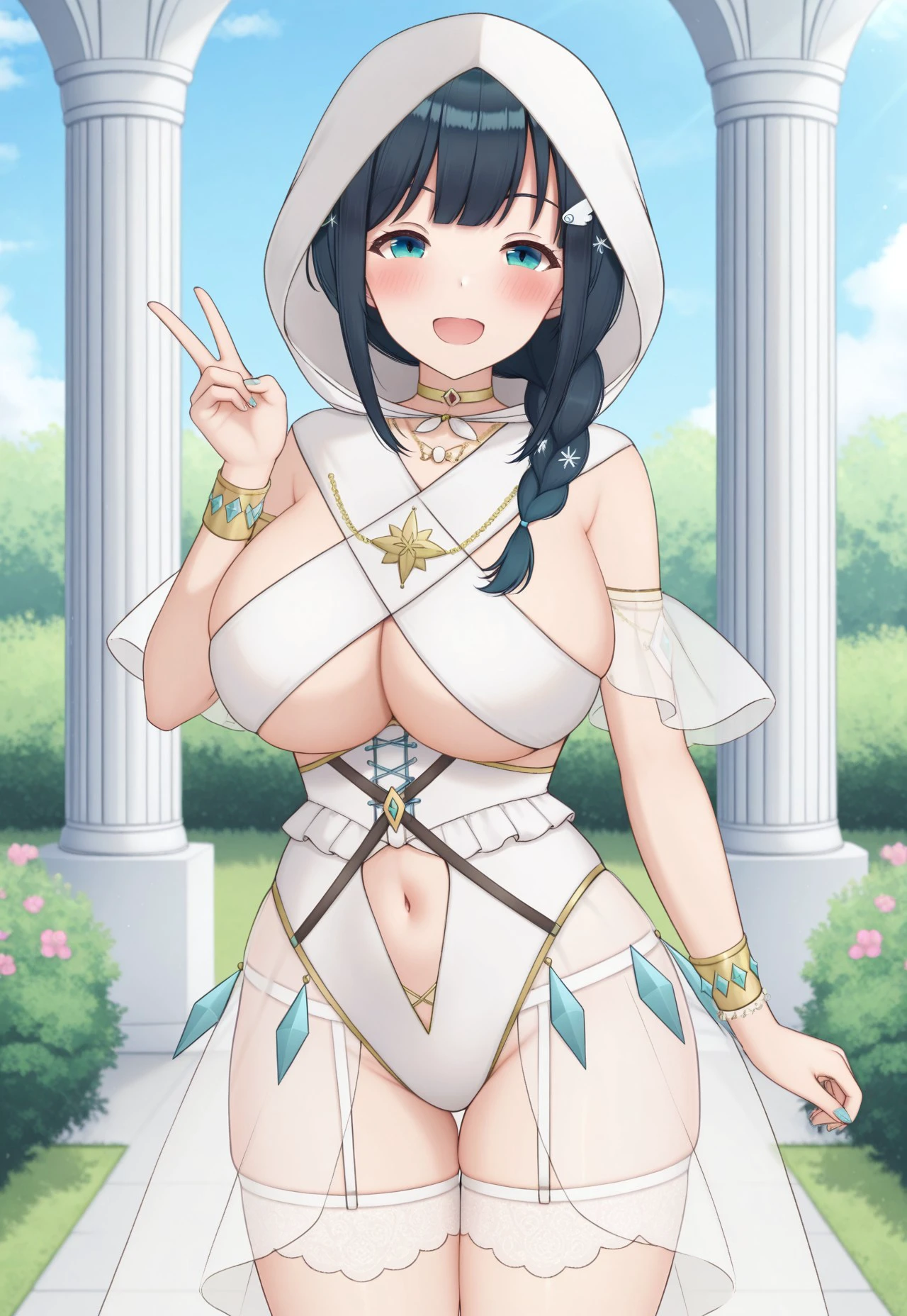 Goddess outfit : nene amano, blue hair, bangs, blue eyes, virtual youtuber, huge breasts, thick thighs, wide hips, goddess outfit, straight-on, braid, black hair, navel, barefoot, hood, long hair, nail polish, jewelry, see-through, single braid, hair ornament, hood up, clothing cutout, bangs, hair over shoulder, underboob, sideboob,